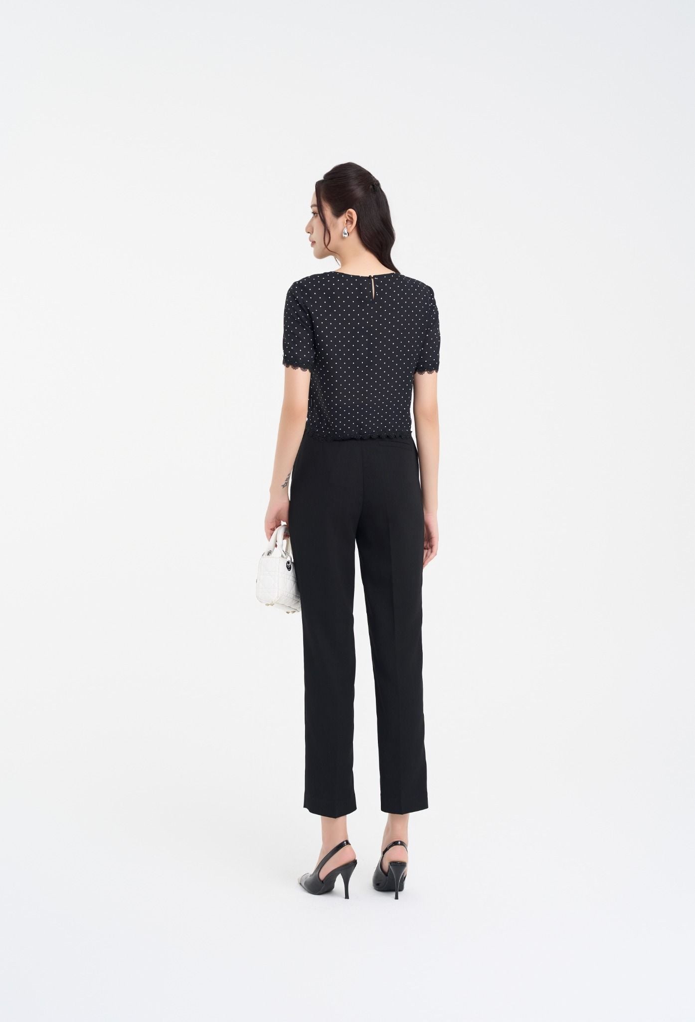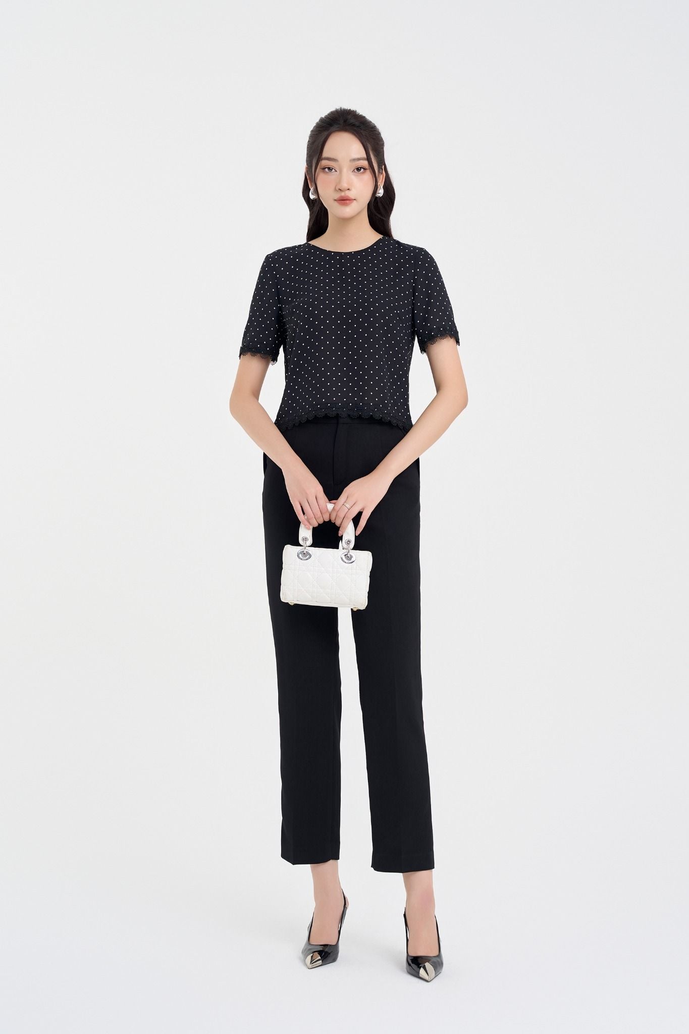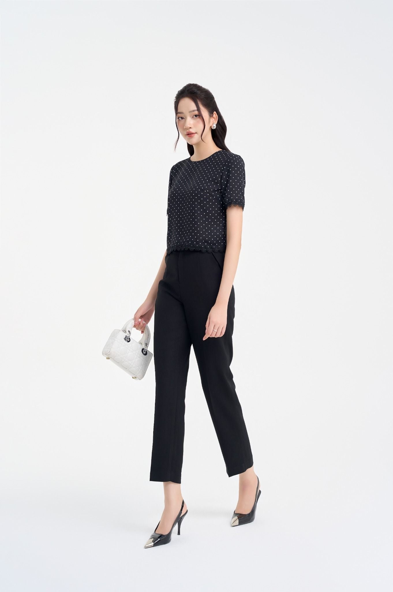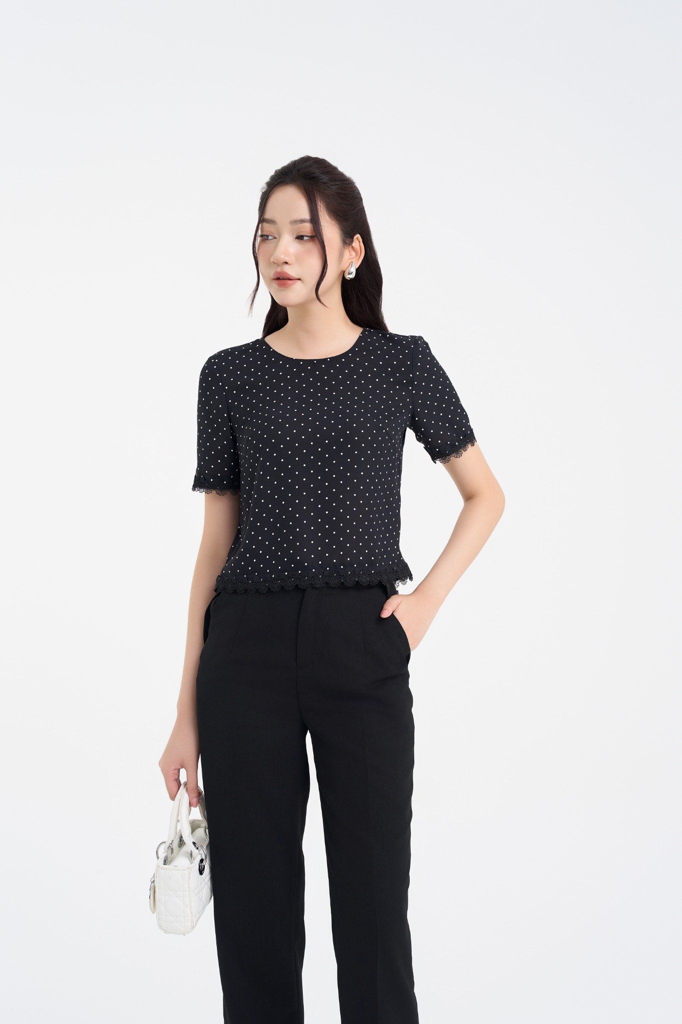 Kiểu dáng: áo sơ mi thiết kế dáng suông, kết hợp họa tiết chấm bi trắng