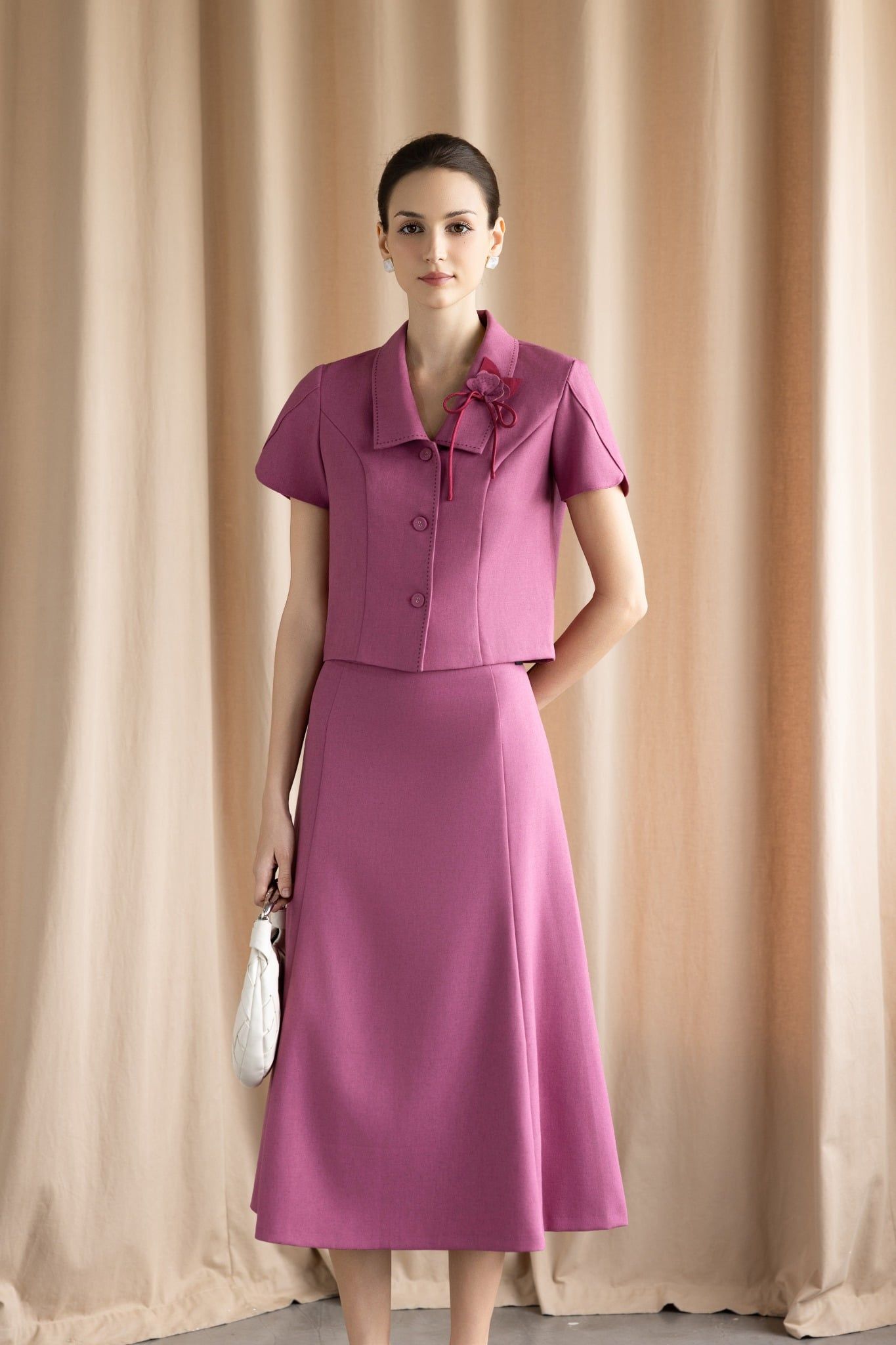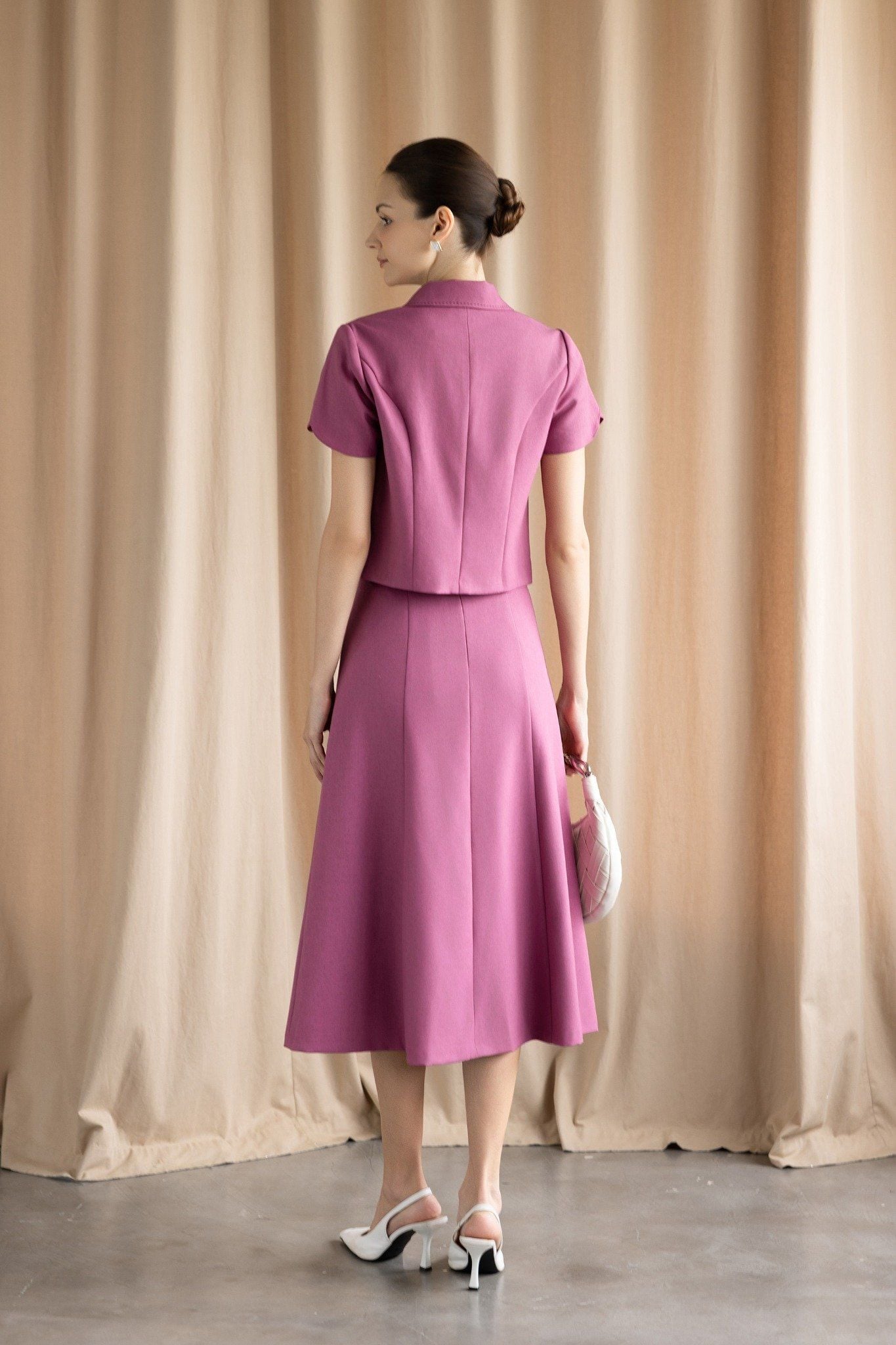 Kiểu dáng: áo công sở thiết kế ngắn tay, dáng suông nhẹ cùng chiều dài vừa phải giúp người mặc giữ được sự thanh lịch mà trẻ trung hơn các dáng áo truyền thống, tone màu hồng tím kết hợp chi tiết tay xẻ trẻ trung, cổ đính hoa 3D tạo điểm nhấn