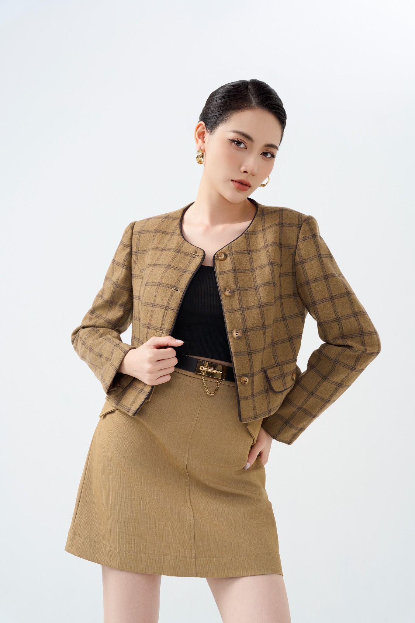 Kiểu dáng: áo khoác thiết kế dáng ngắn, kết hợp họa tiết kẻ tone màu nâu