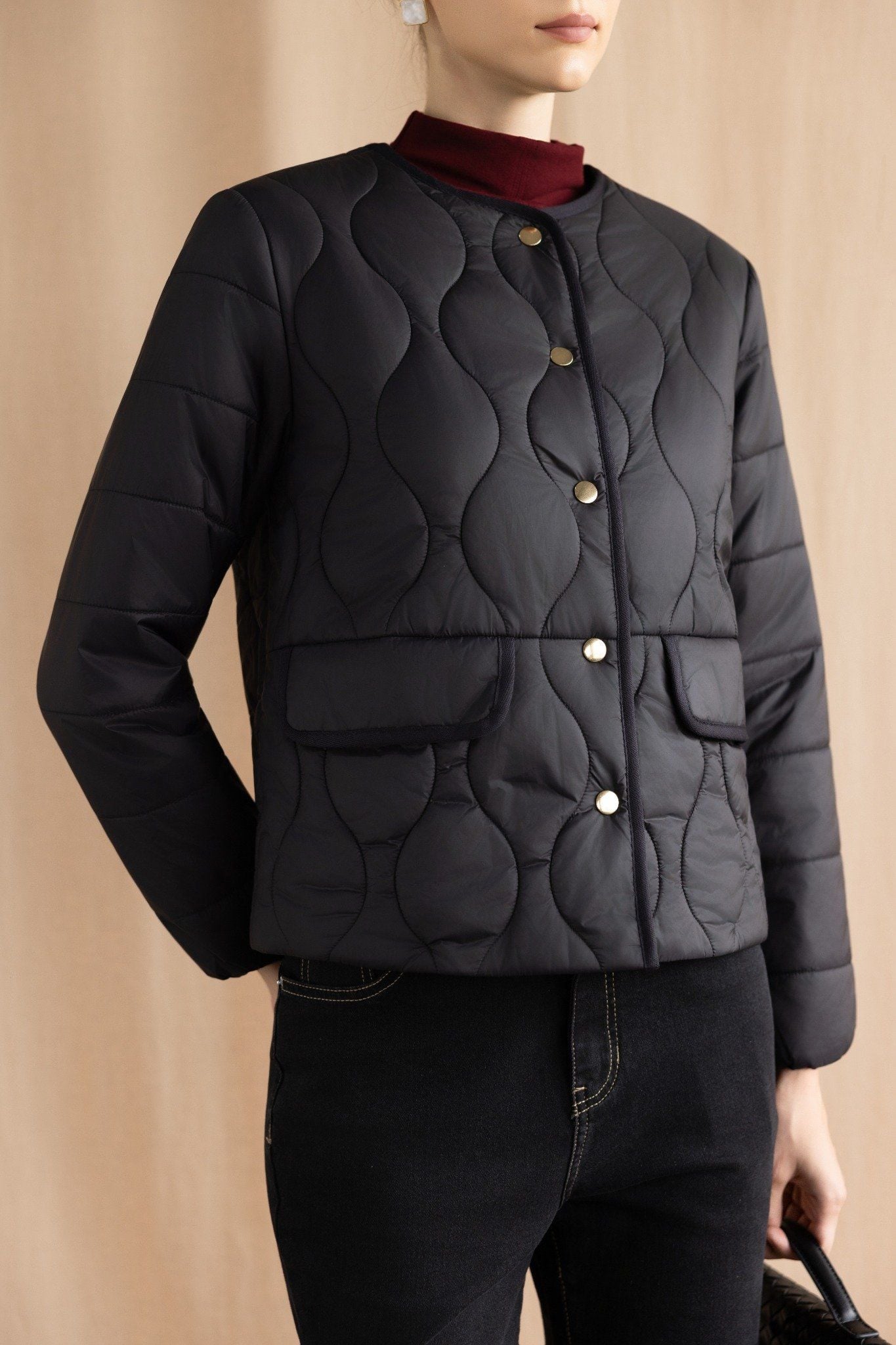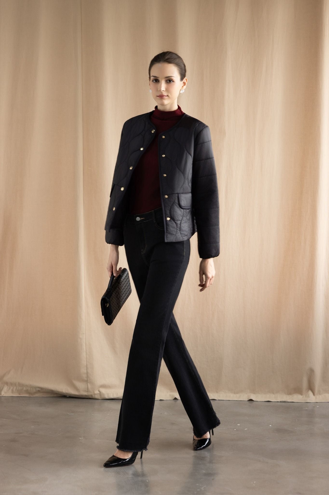 Kiểu dáng: áo khoác phao dáng suông, độ dài vừa phải mang tới sự trẻ trung và thoải mái cho người mặc. Áo sử dụng tone màu đen trơn phối đường trần chỉ cách điệu