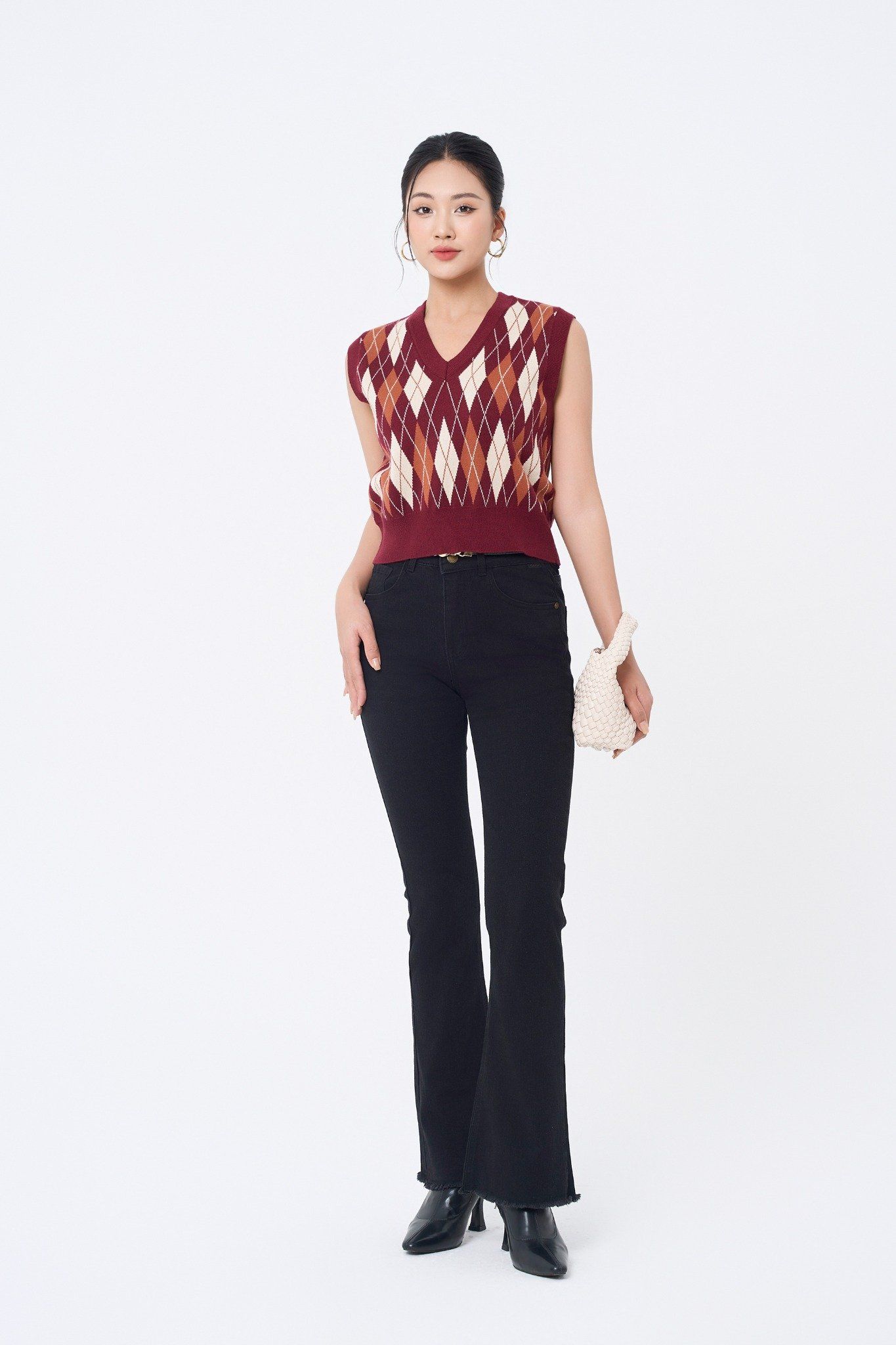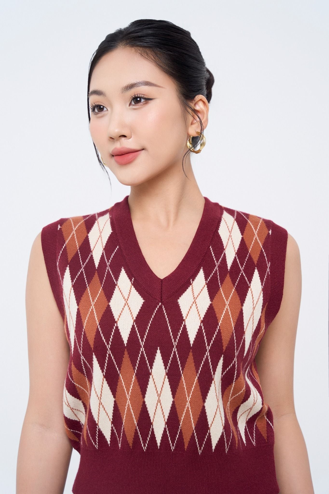 Kiểu dáng: áo gile len bo gấu, kết hợp họa tiết quả trám