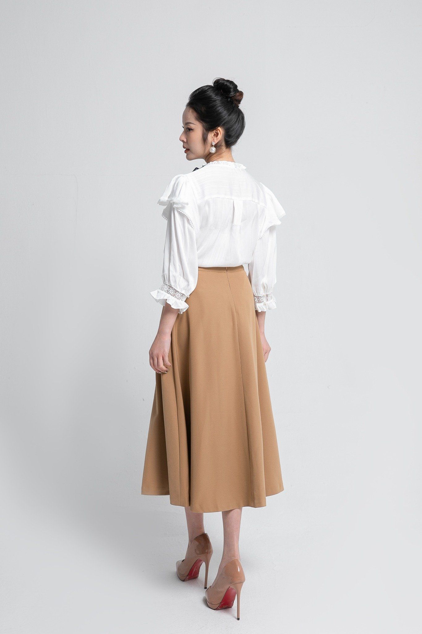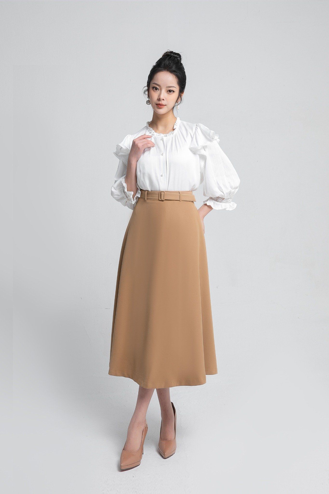 Kiểu dáng: chân váy thiết kế dáng chữ A, tone màu nâu trơn