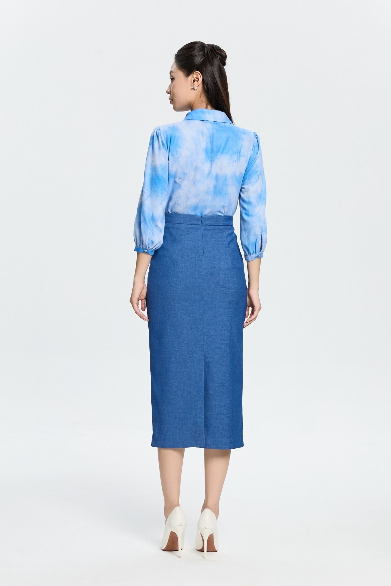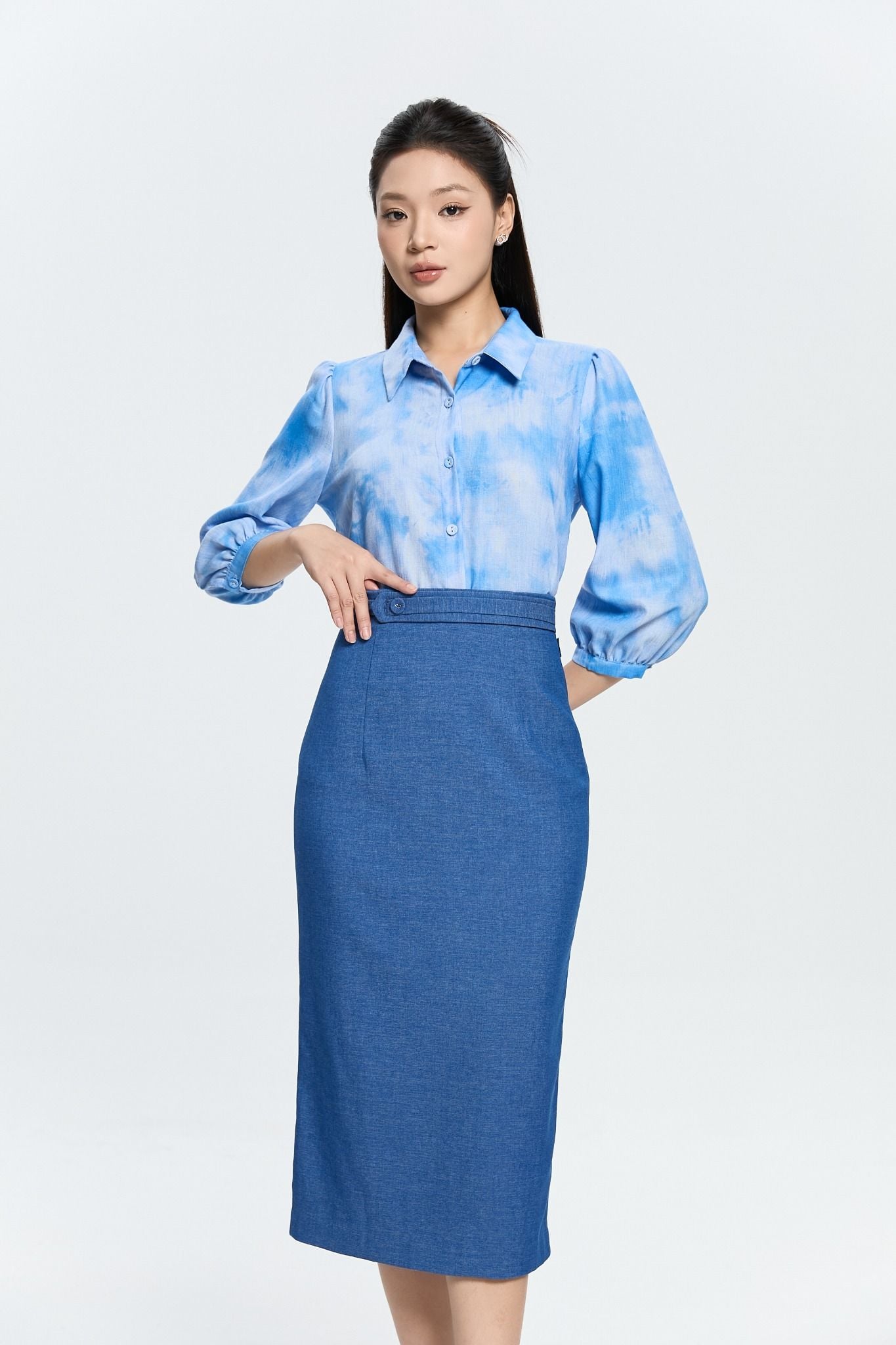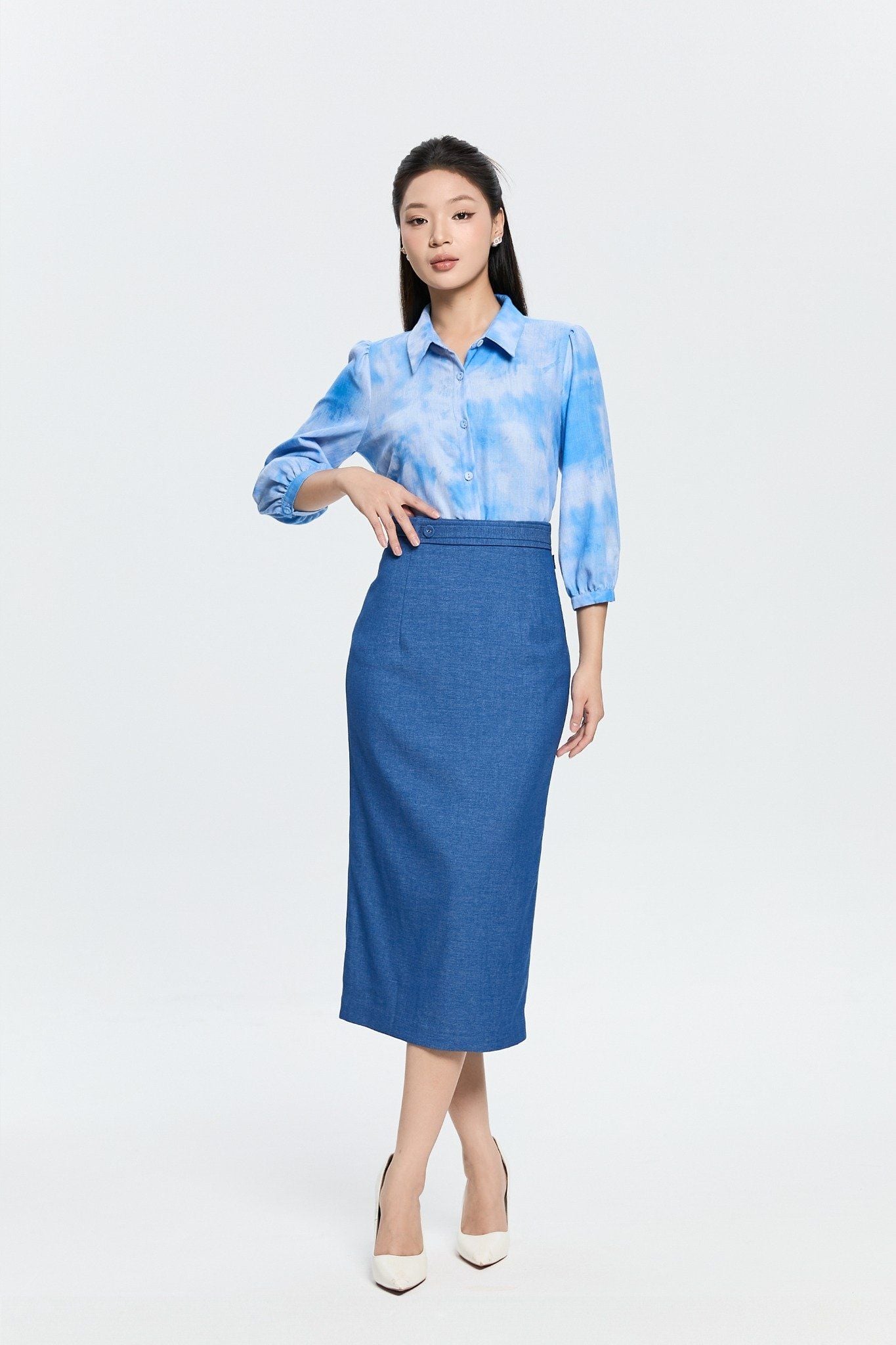 Kiểu dáng: chân váy thiết kế dáng bút chì dài qua gối, tone màu xanh trơn