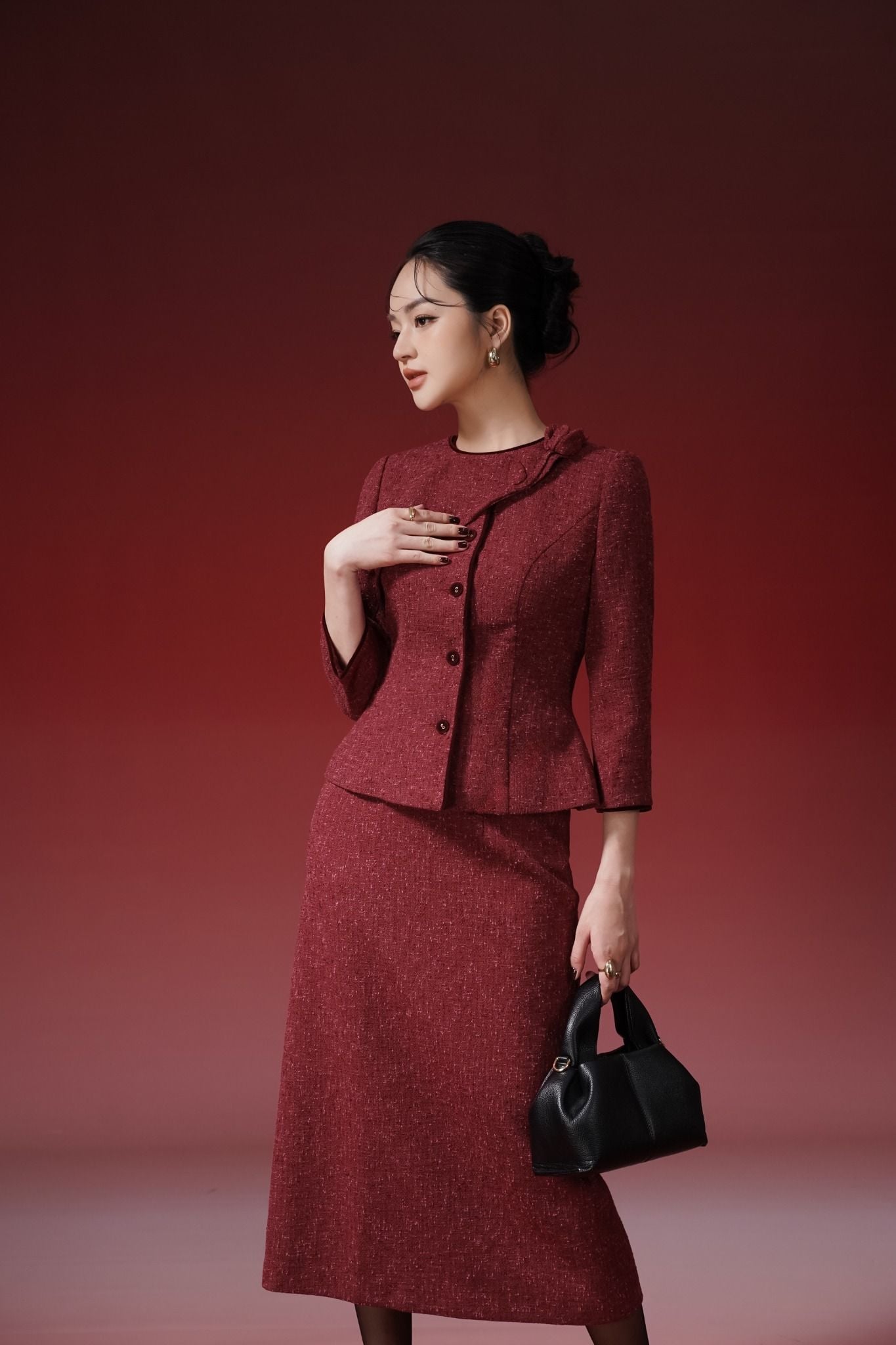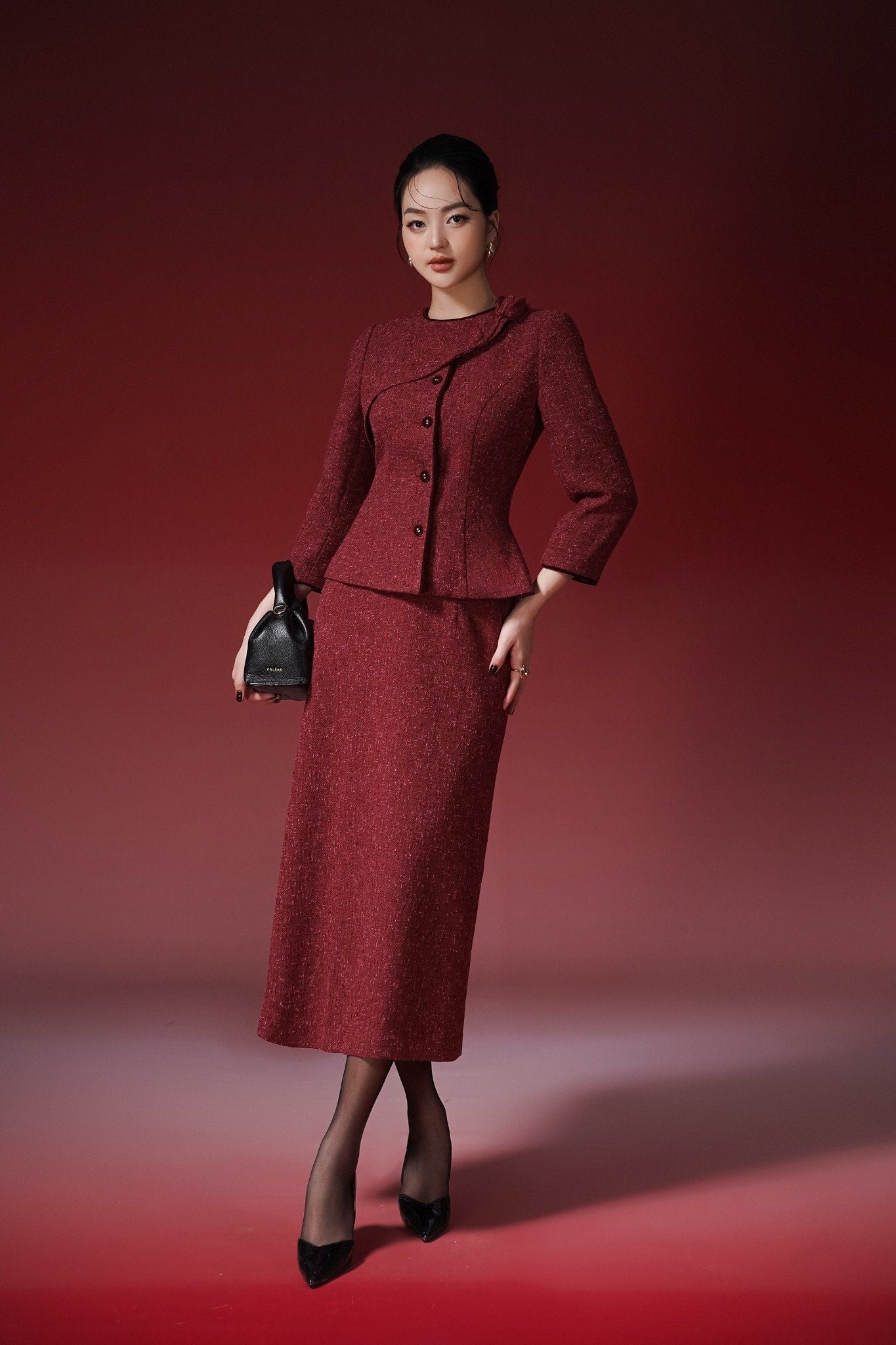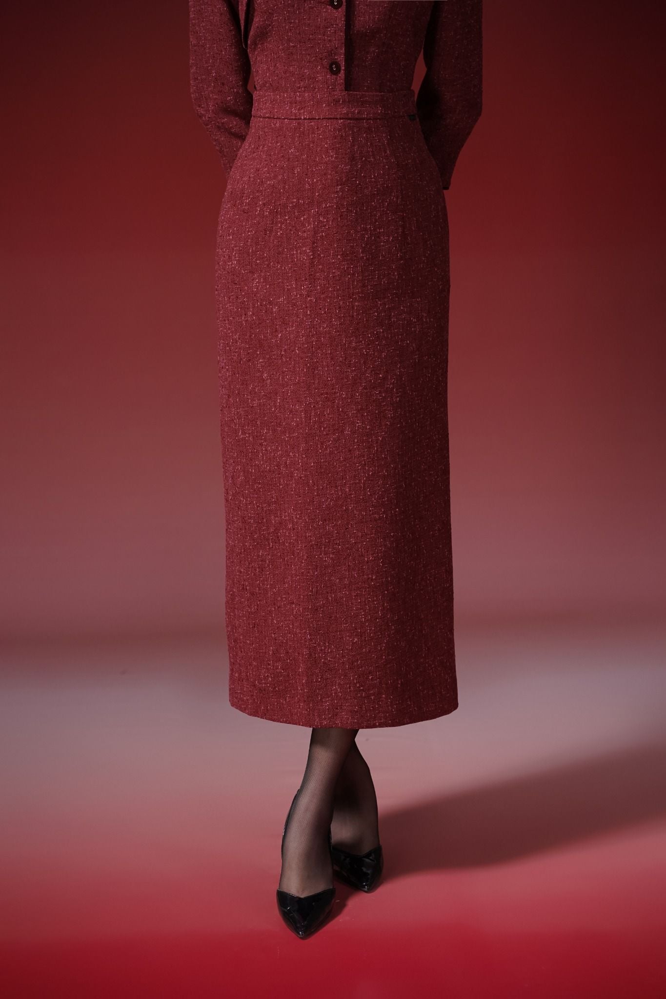 Kiểu dáng: chân váy thiết kế dáng bút chì ôm nhẹ giúp tôn dáng hiệu quả, độ dài qua gối, tone màu đỏ đậm sang trọng