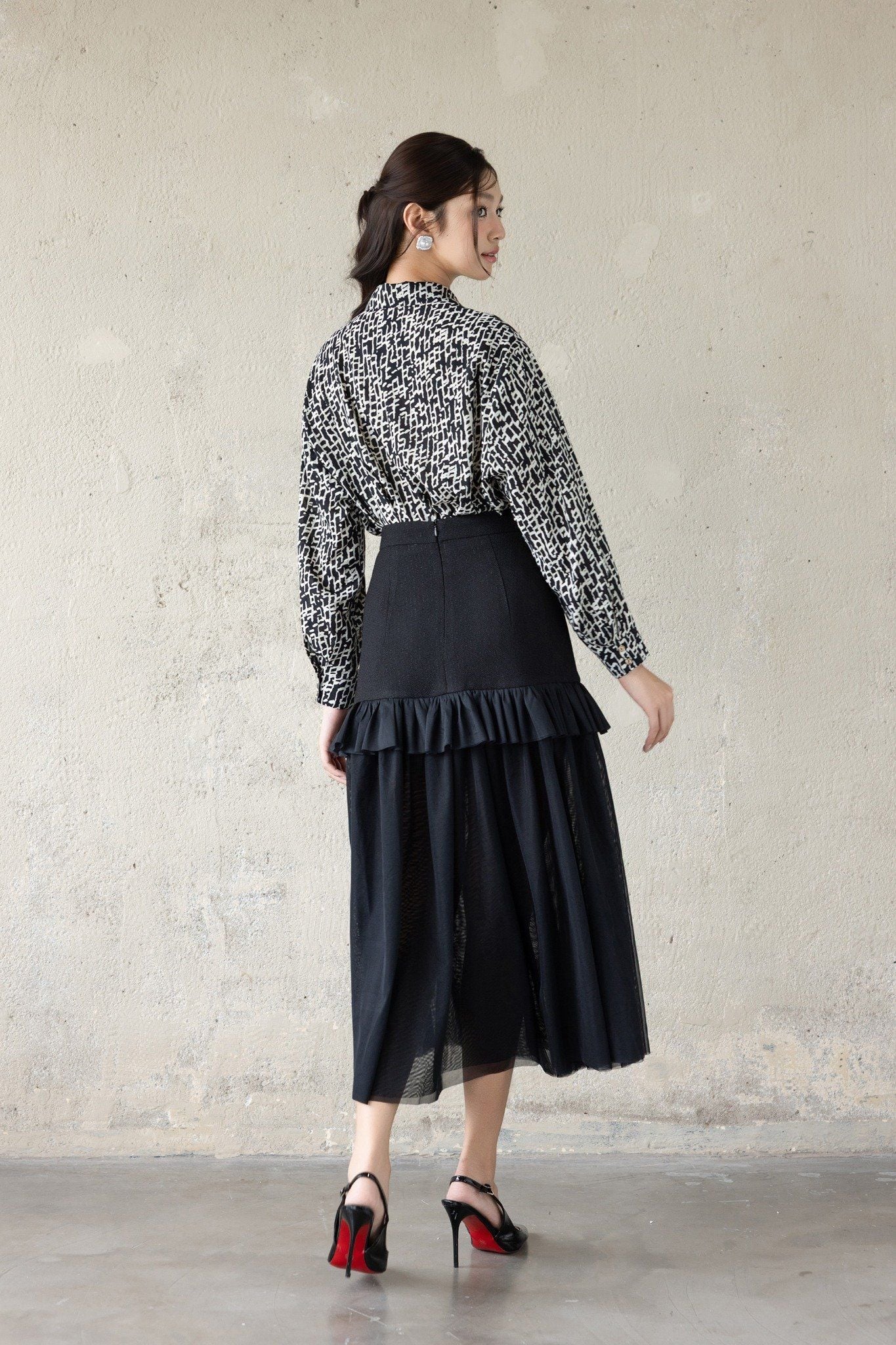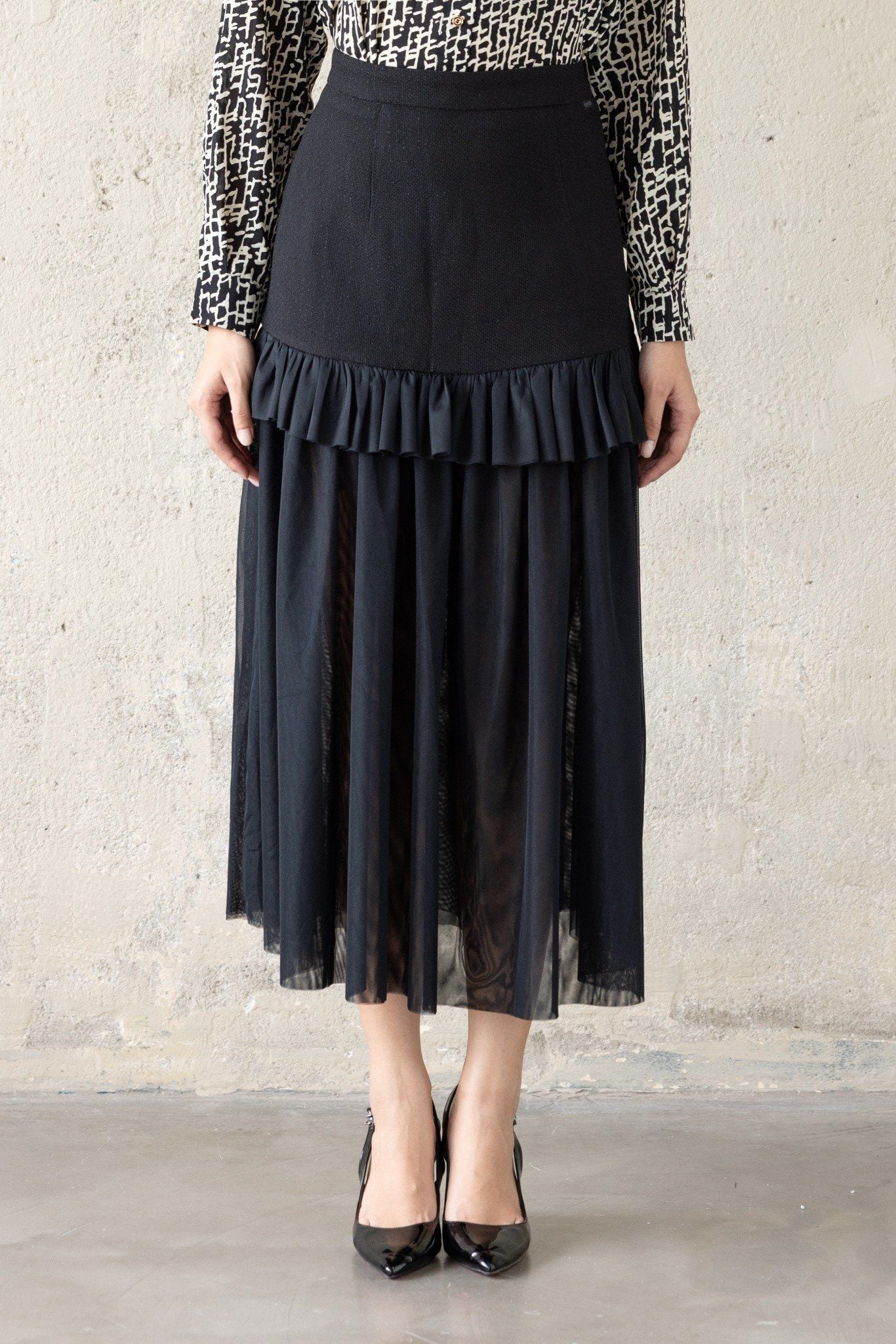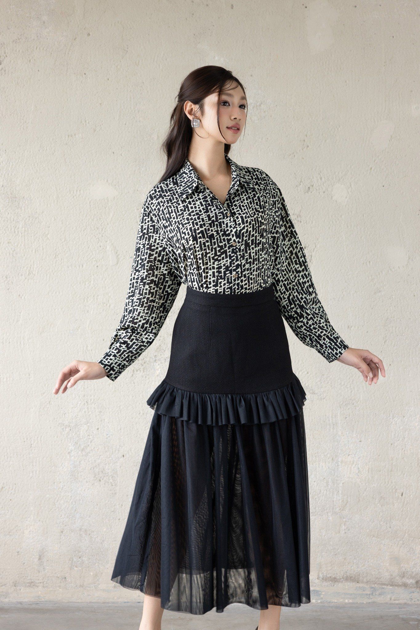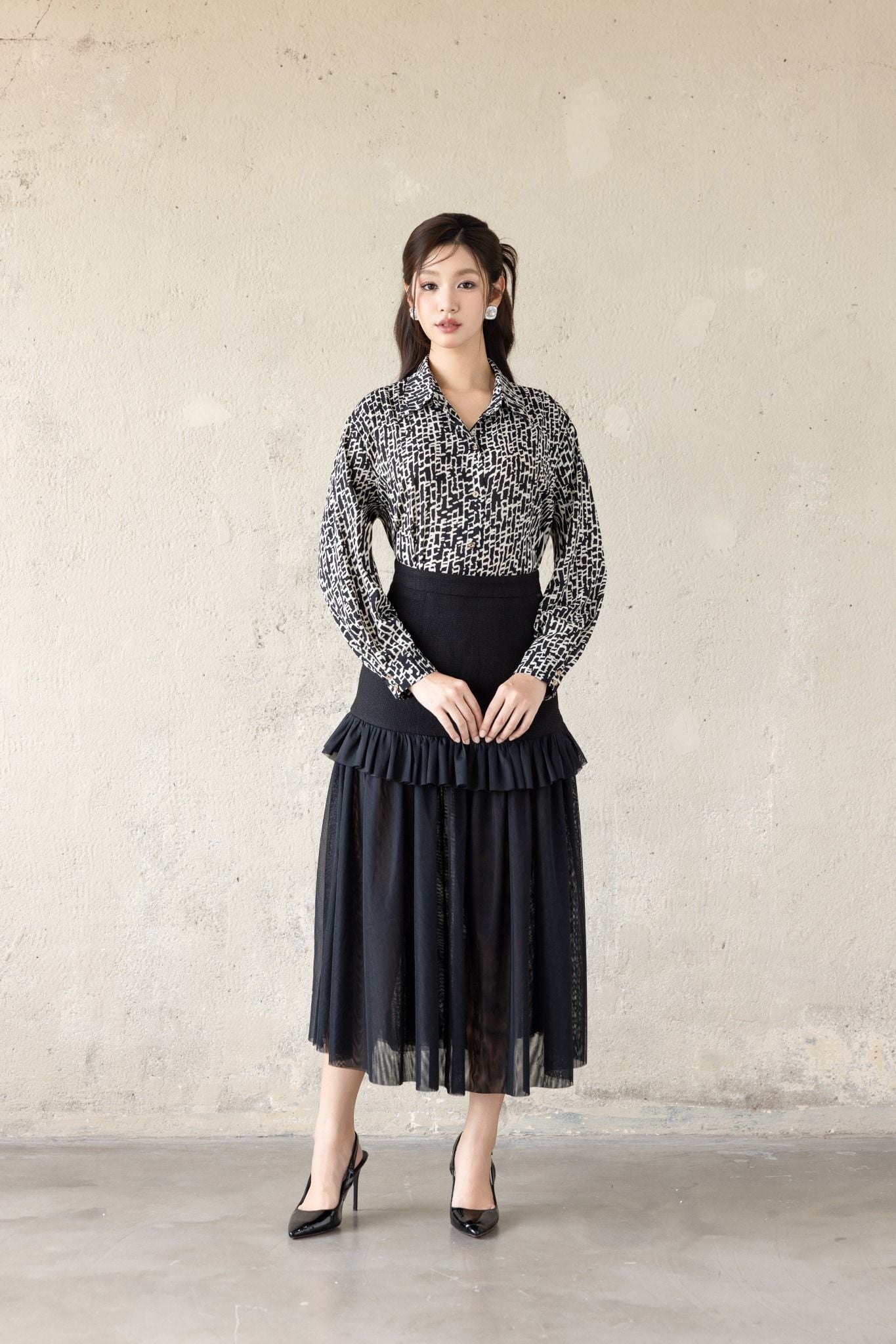 Kiểu dáng: chân váy thiết kế dáng chữ A giúp tôn dáng hiệu quả, độ dài qua gối kết hợp tầng bèo nhún điệu đà, tone màu đen trơn, sản phẩm có thể dễ dàng kết hợp cùng áo với nhiều tone màu khác nhau