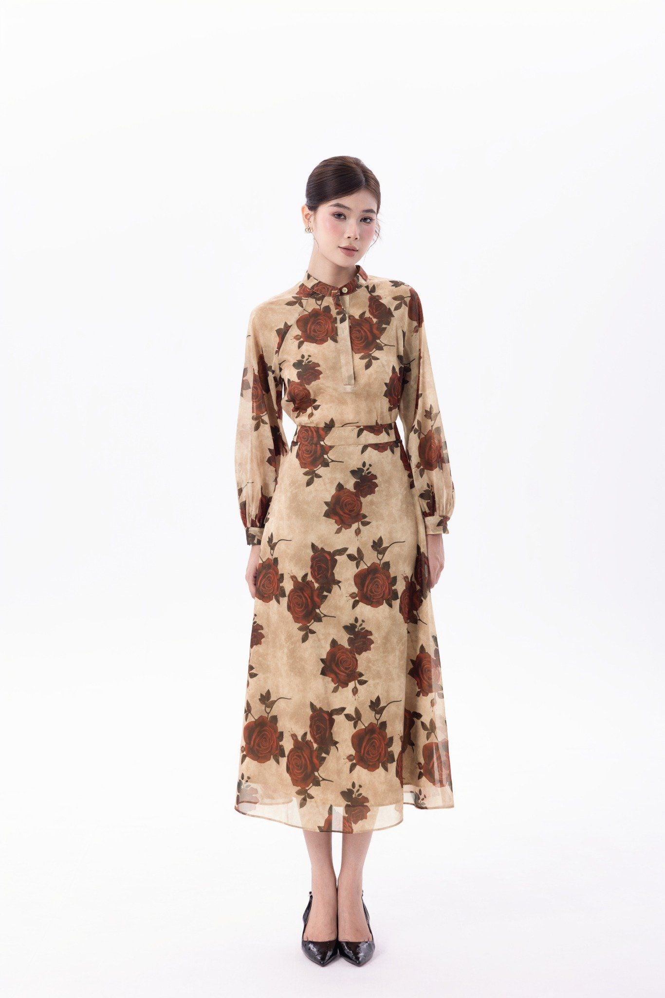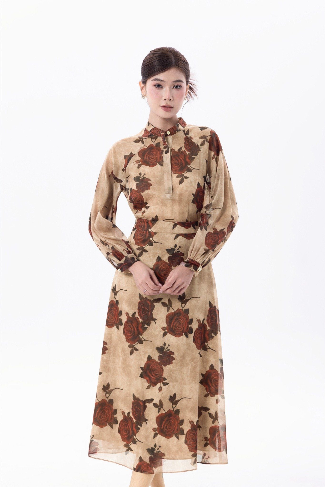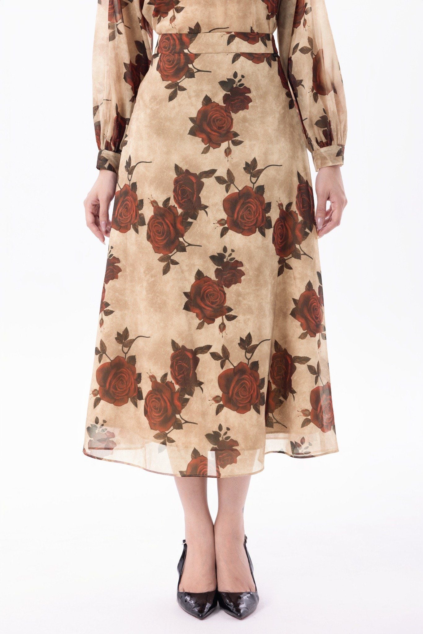 Kiểu dáng: chân váy thiết kế dáng chữ A giúp tôn dáng hiệu quả, độ dài qua gối, sản phẩm sử dụng tone màu nâu be phối hoạ tiết hoa in nổi bật