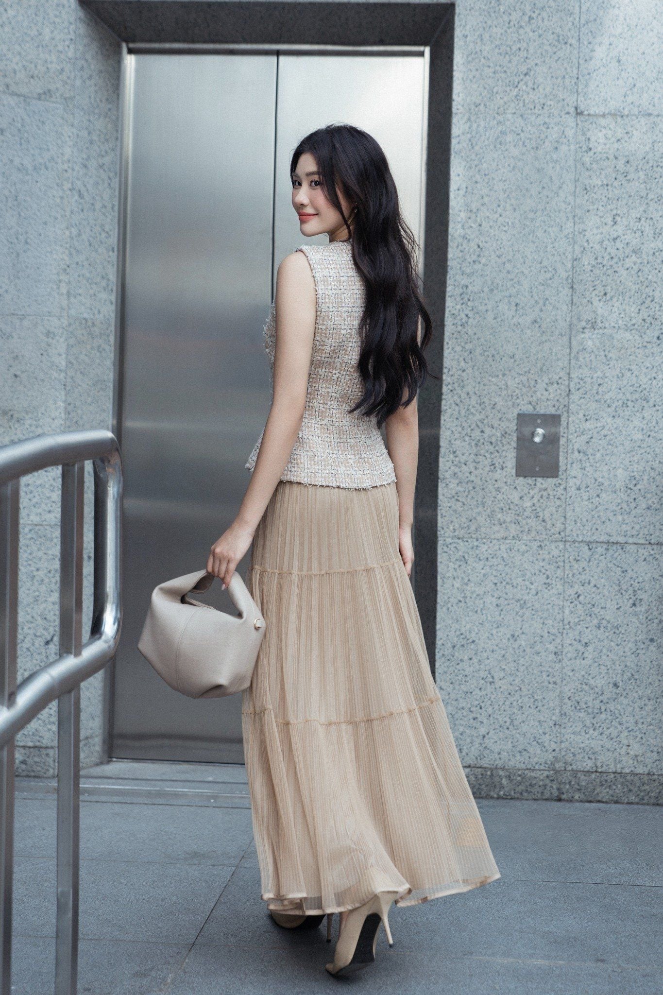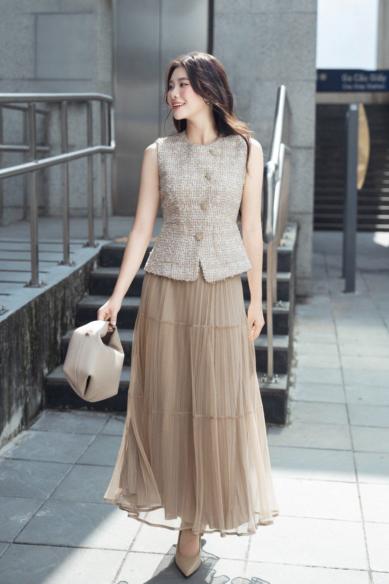 Kiểu dáng: chân váy thiết kế dáng chữ A giúp tôn dáng hiệu quả, độ dài qua gối tạo độ bồng xoè, tone màu nâu be thanh lịch