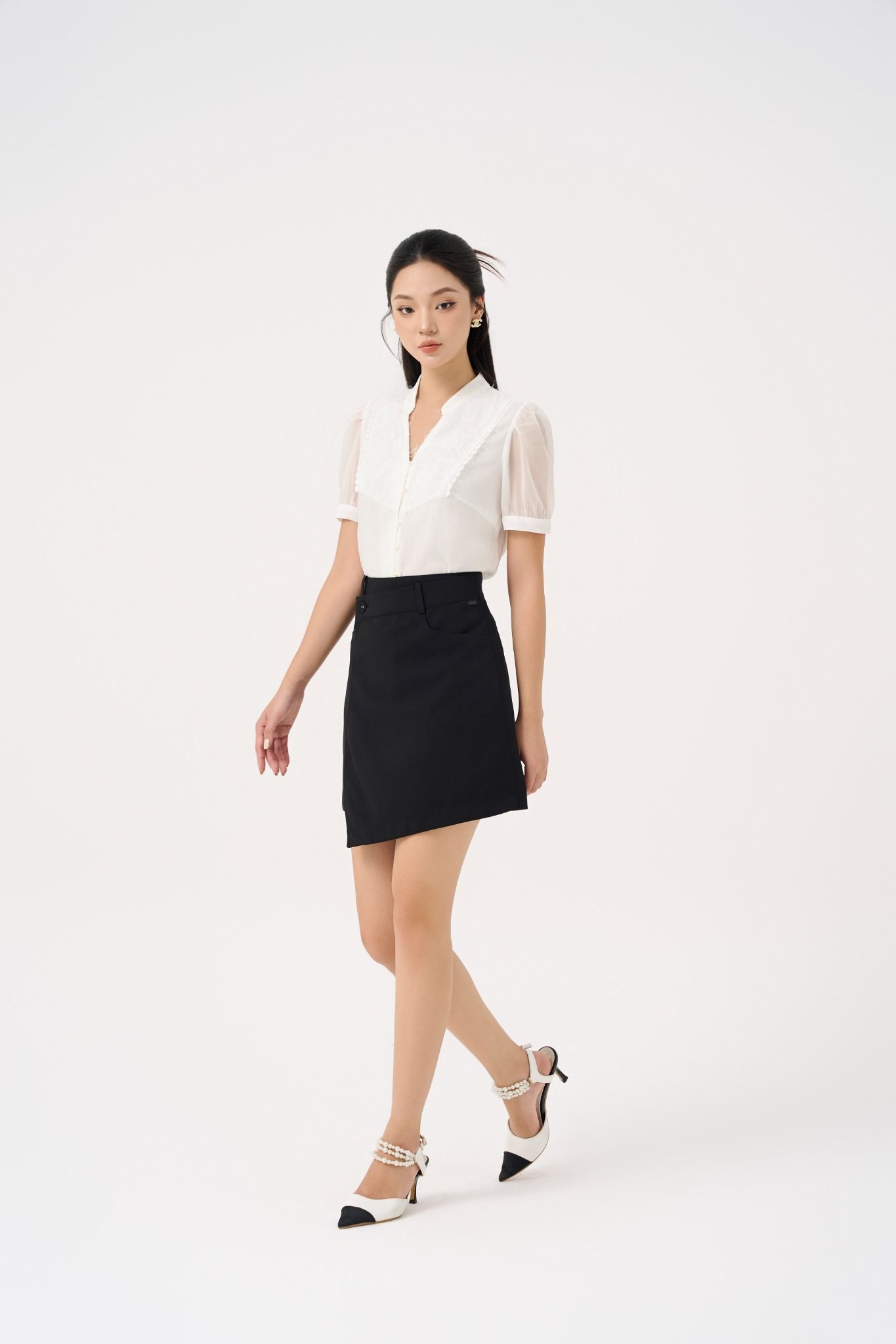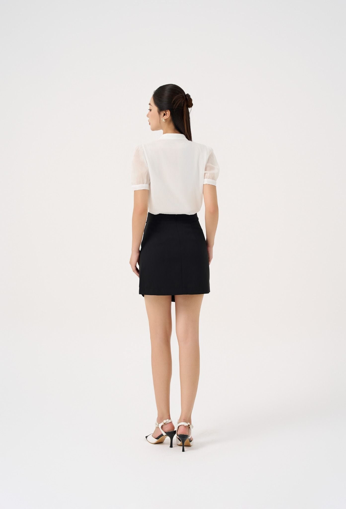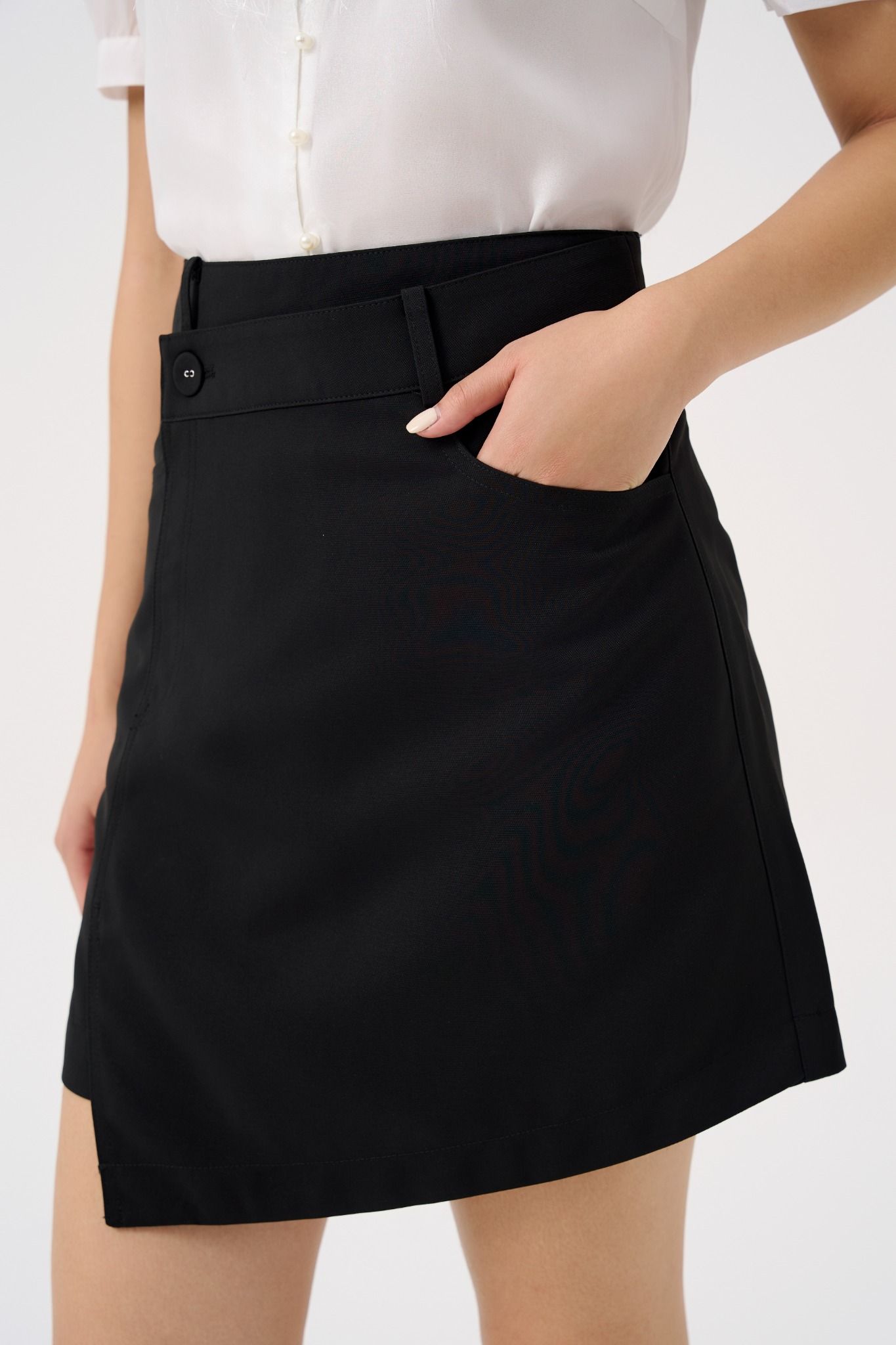 Kiểu dáng: chân váy thiết kế dáng chữ A độ dài trên gối, vạt lệch, tone màu đen trơn