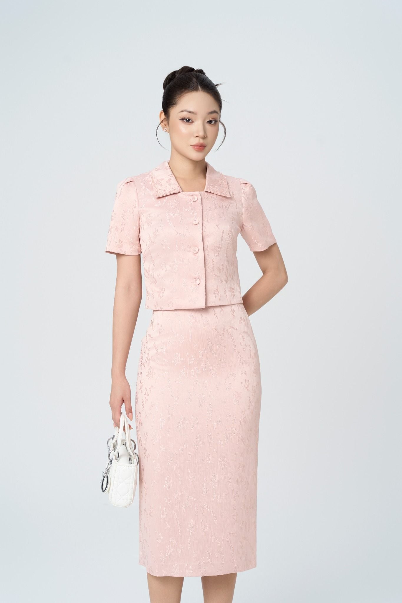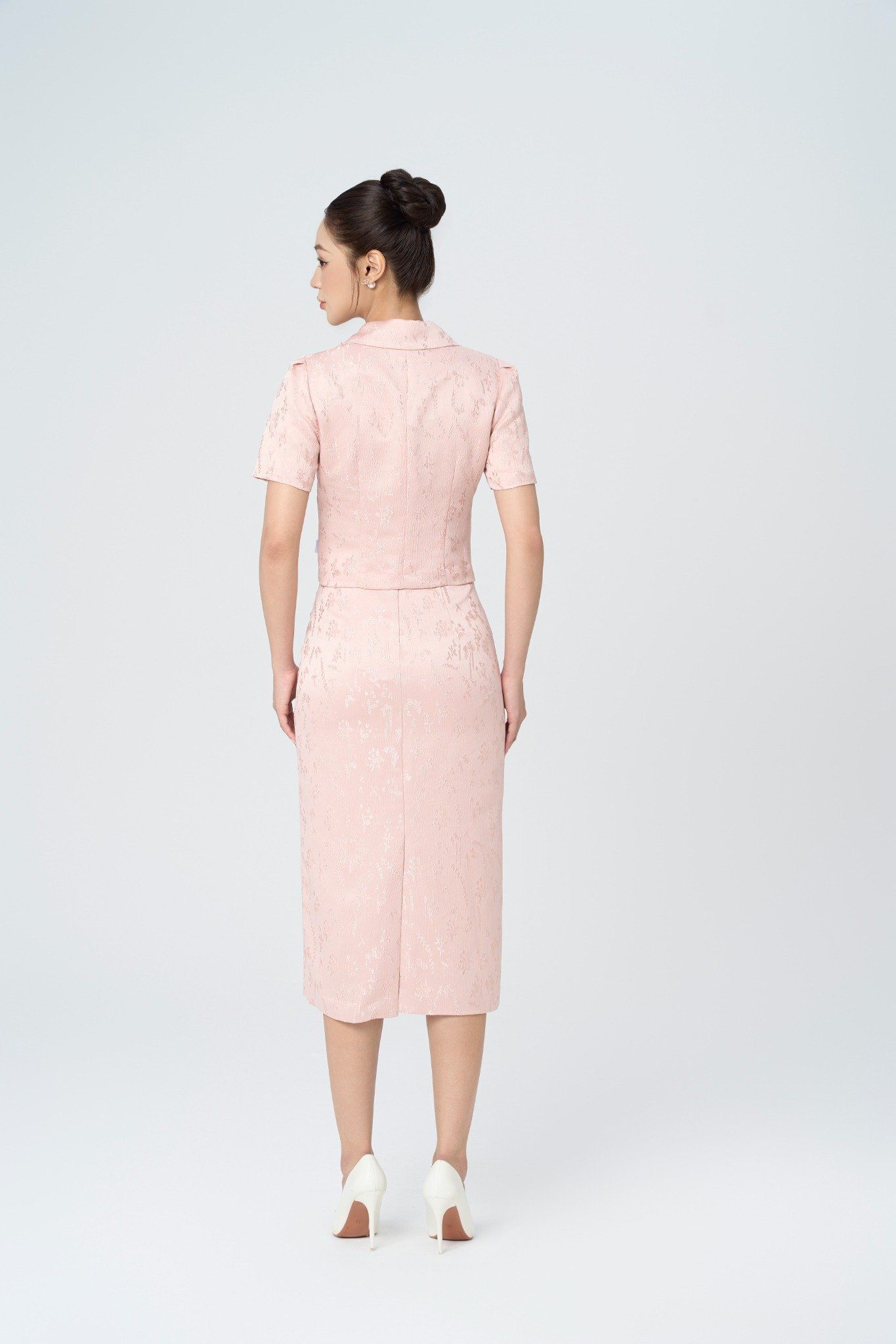 Kiểu dáng: chân váy thiết kế dáng bút chì, dài qua gối, tone màu hồng nhạt phối họa tiết chìm
