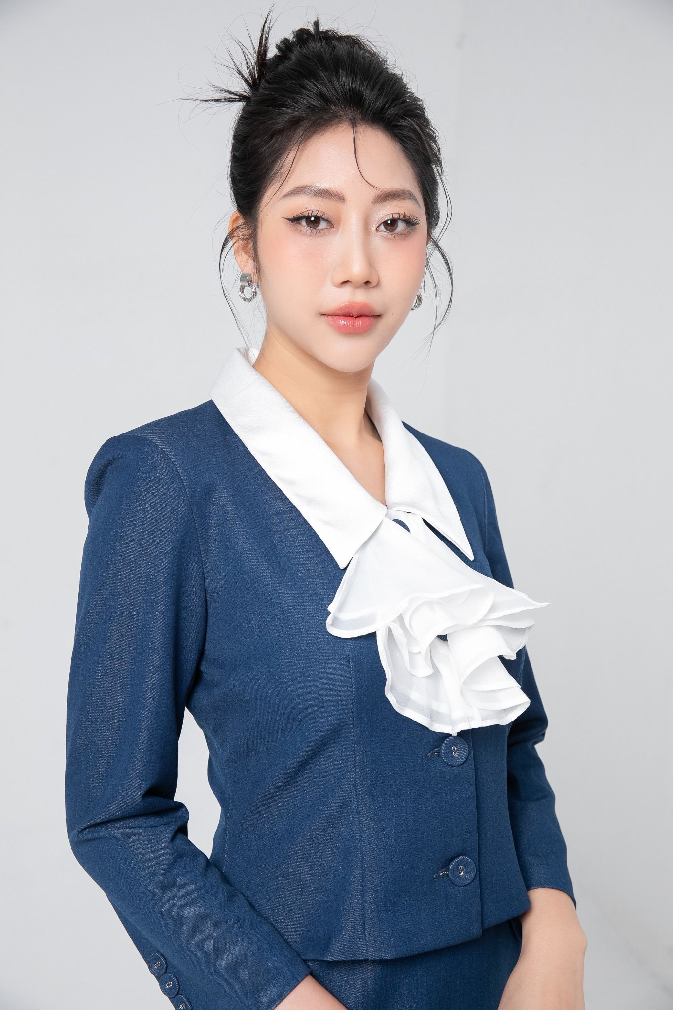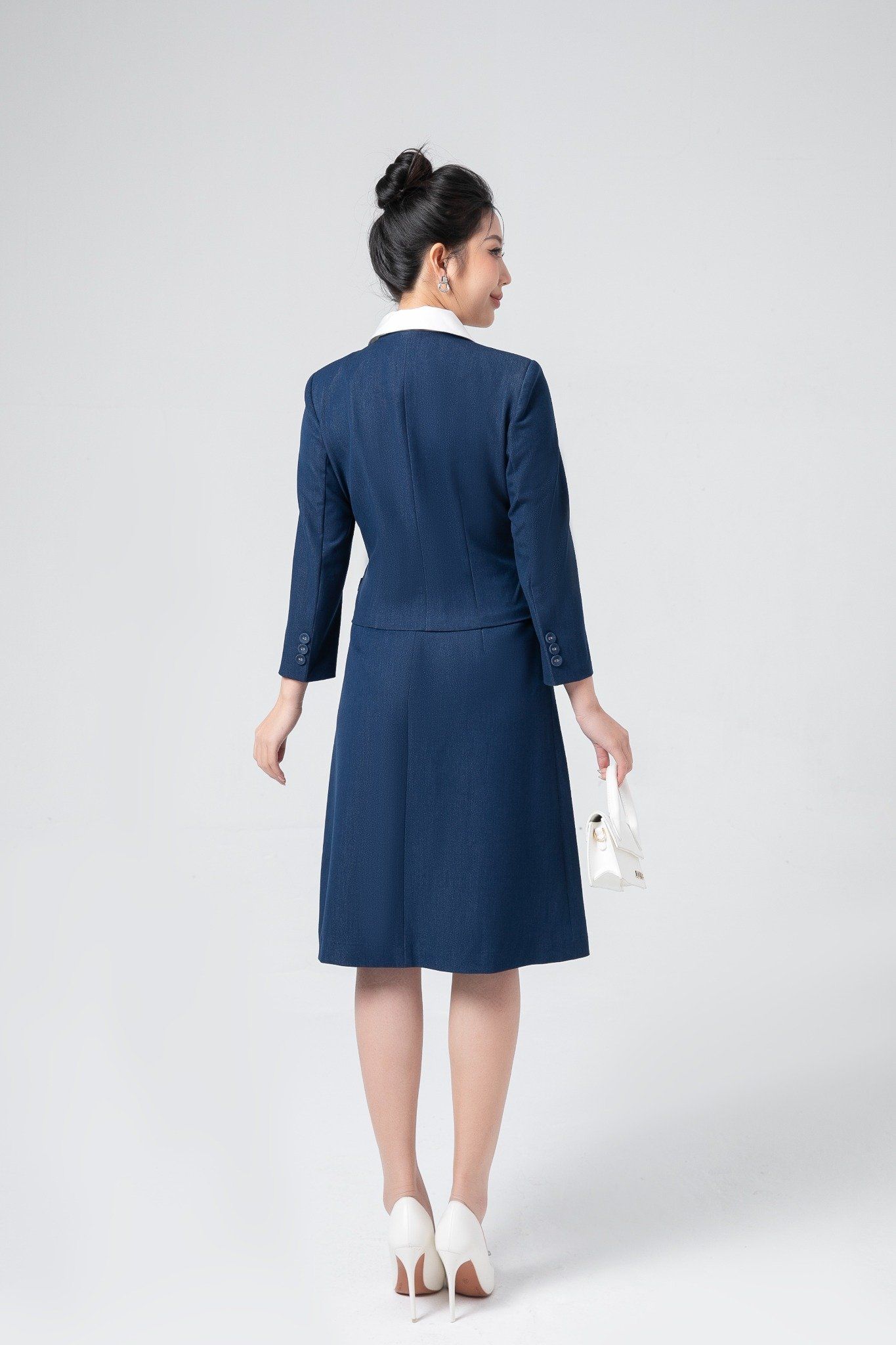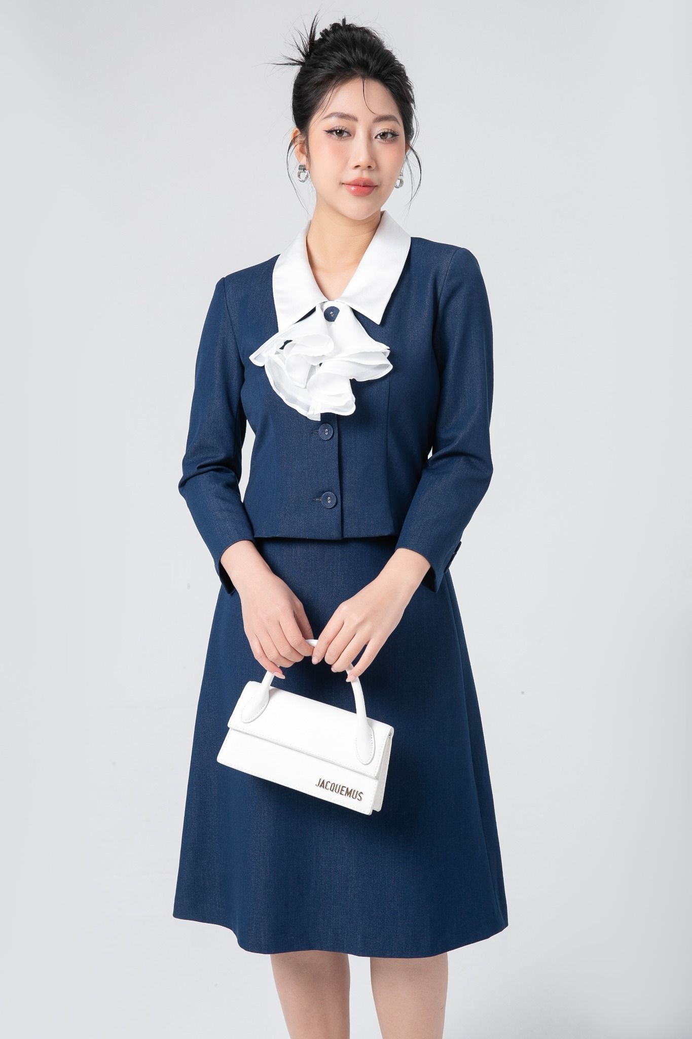 Kiểu dáng: áo khoác thiết kế cài khuy trước, tone màu xanh, phối nơ bản to