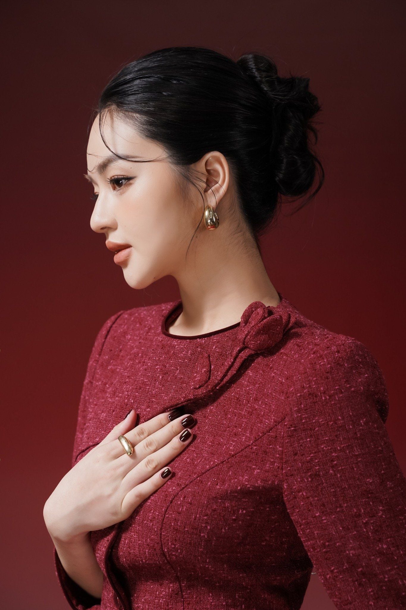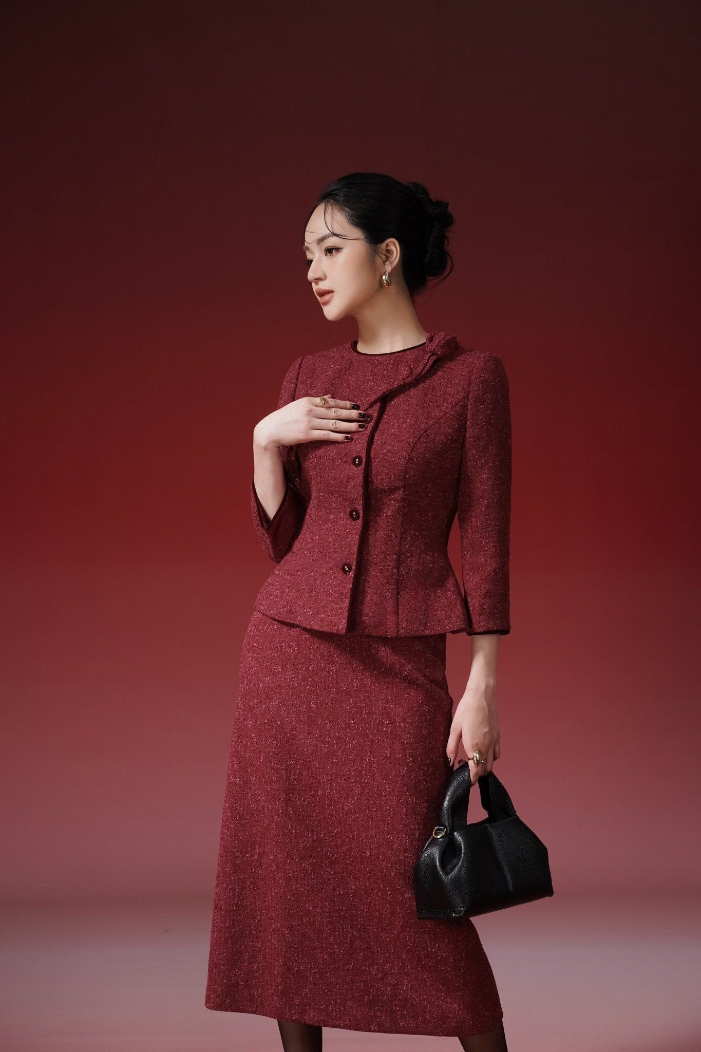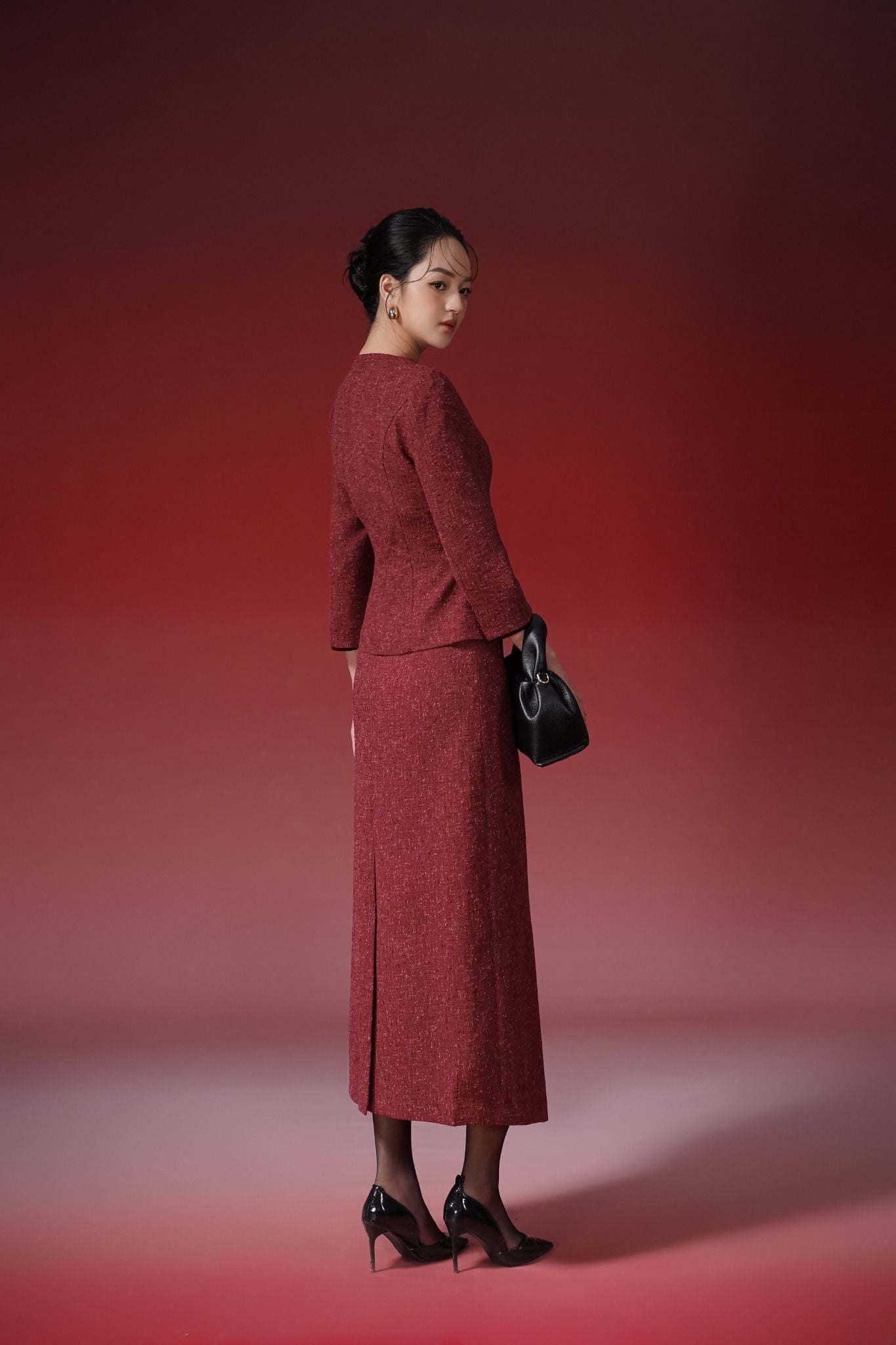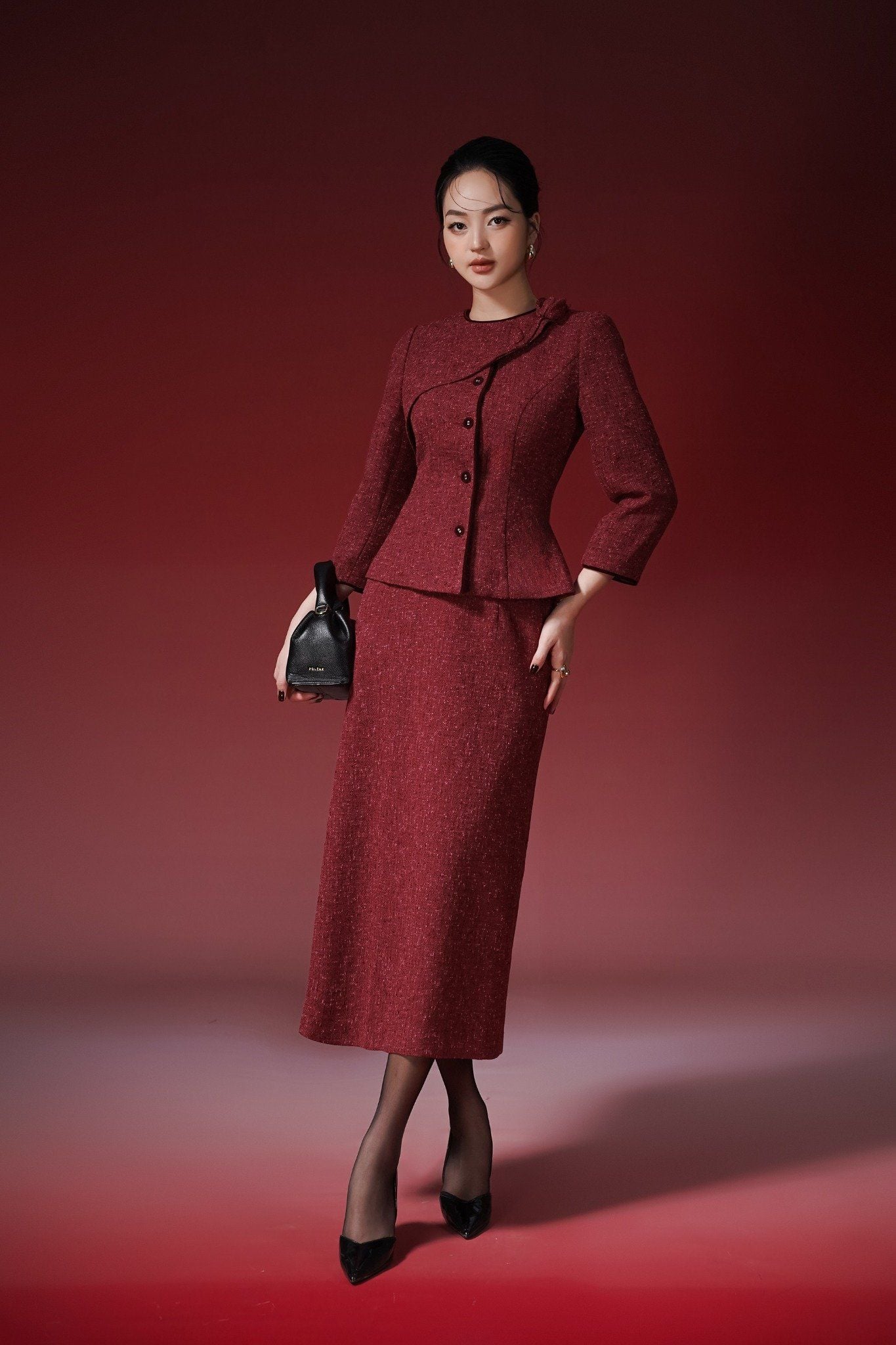 Kiểu dáng: áo vest thiết kế dài tay, dáng chiết eo nhẹ với độ dài vừa phải. Phần cổ cách điệu cùng hàng khuy đính phía trước tạo nét hiện đại, phá cách cho bộ trang phục.