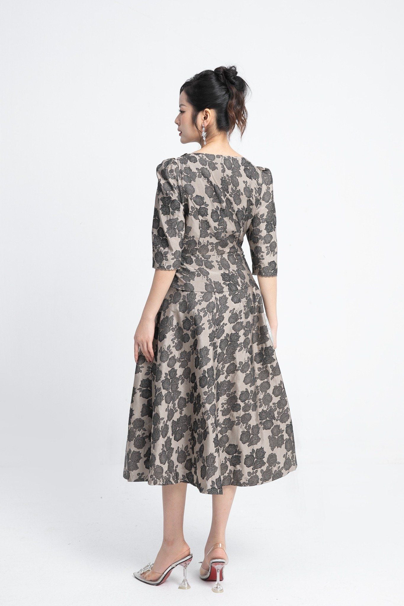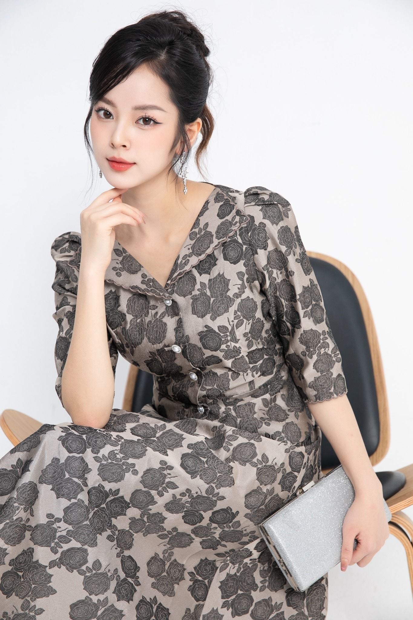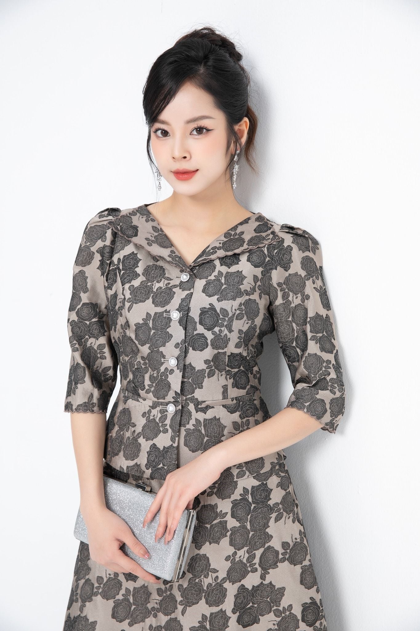 Kiểu dáng: áo peplum thiết kế tay lỡ, vai bồng, kết hợp họa tiết hoa