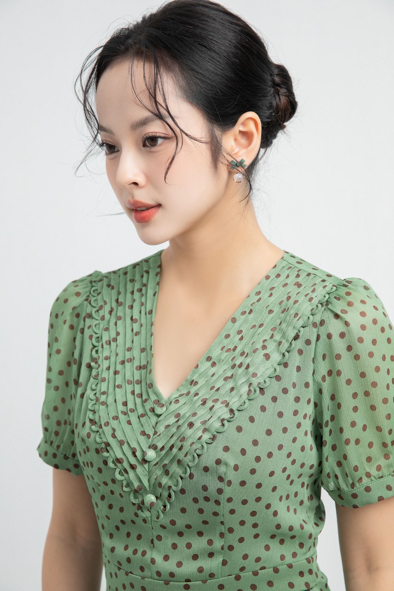 Kiểu dáng: đầm thiết kế dáng chữ A dài qua gối, tay bồng, kết hợp họa tiết chấm bi