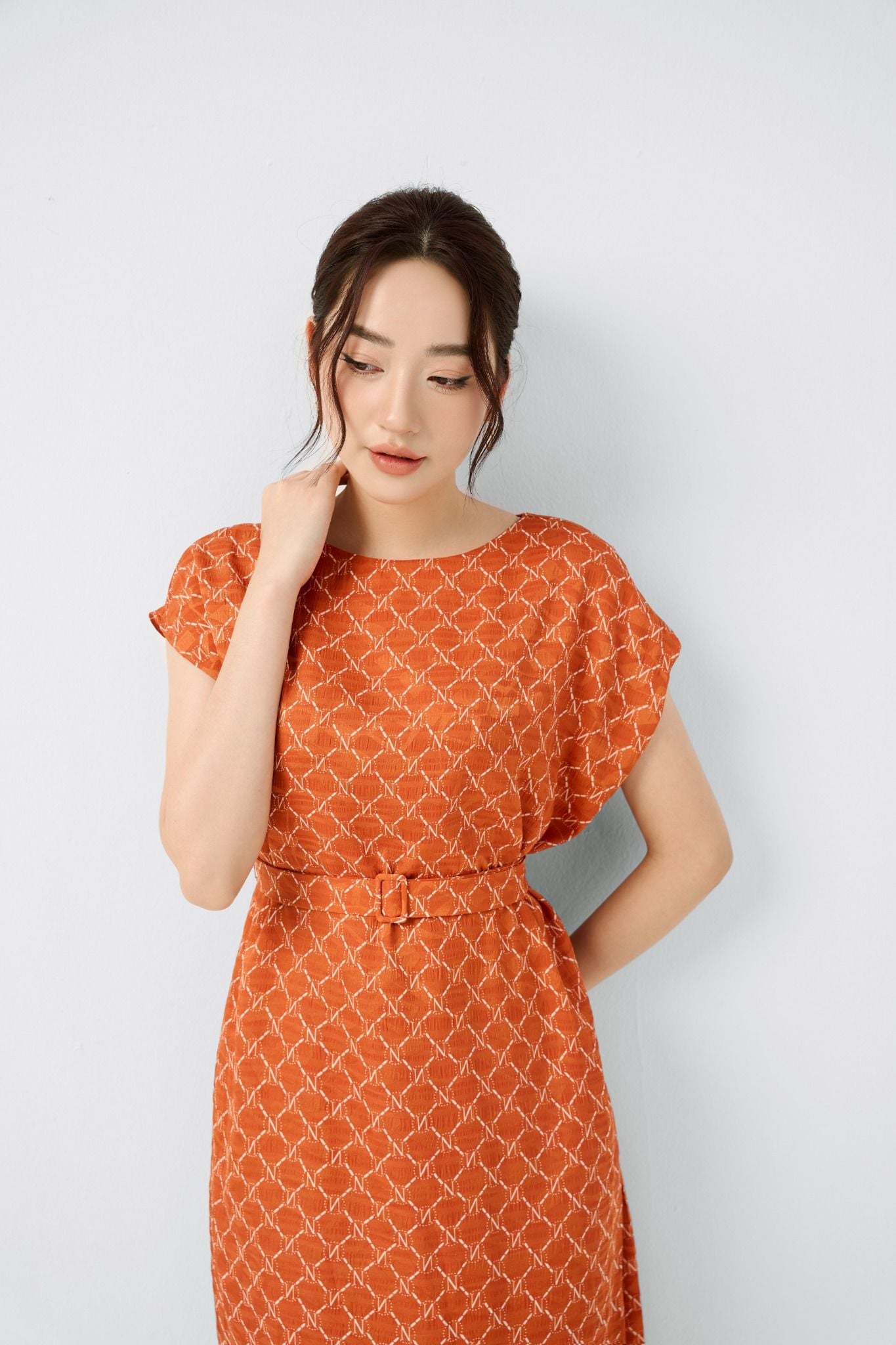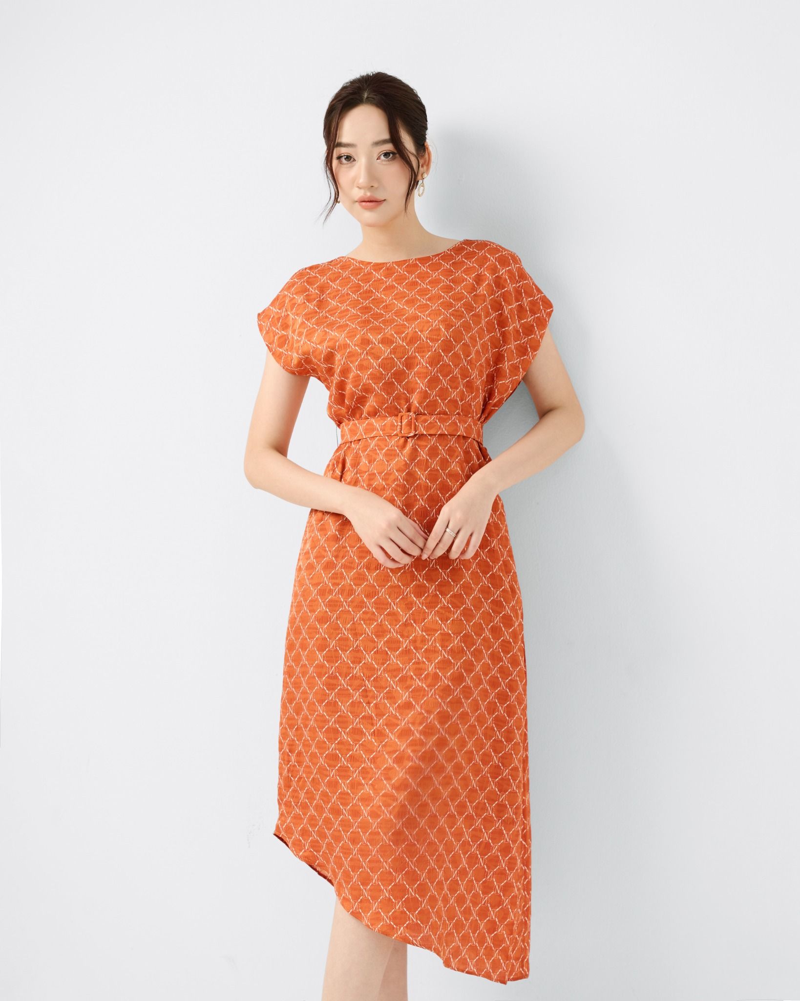 Kiểu dáng: đầm thiết kế dáng chữ A dài qua gối, tone màu cam kết hợp họa tiết in, kèm đai