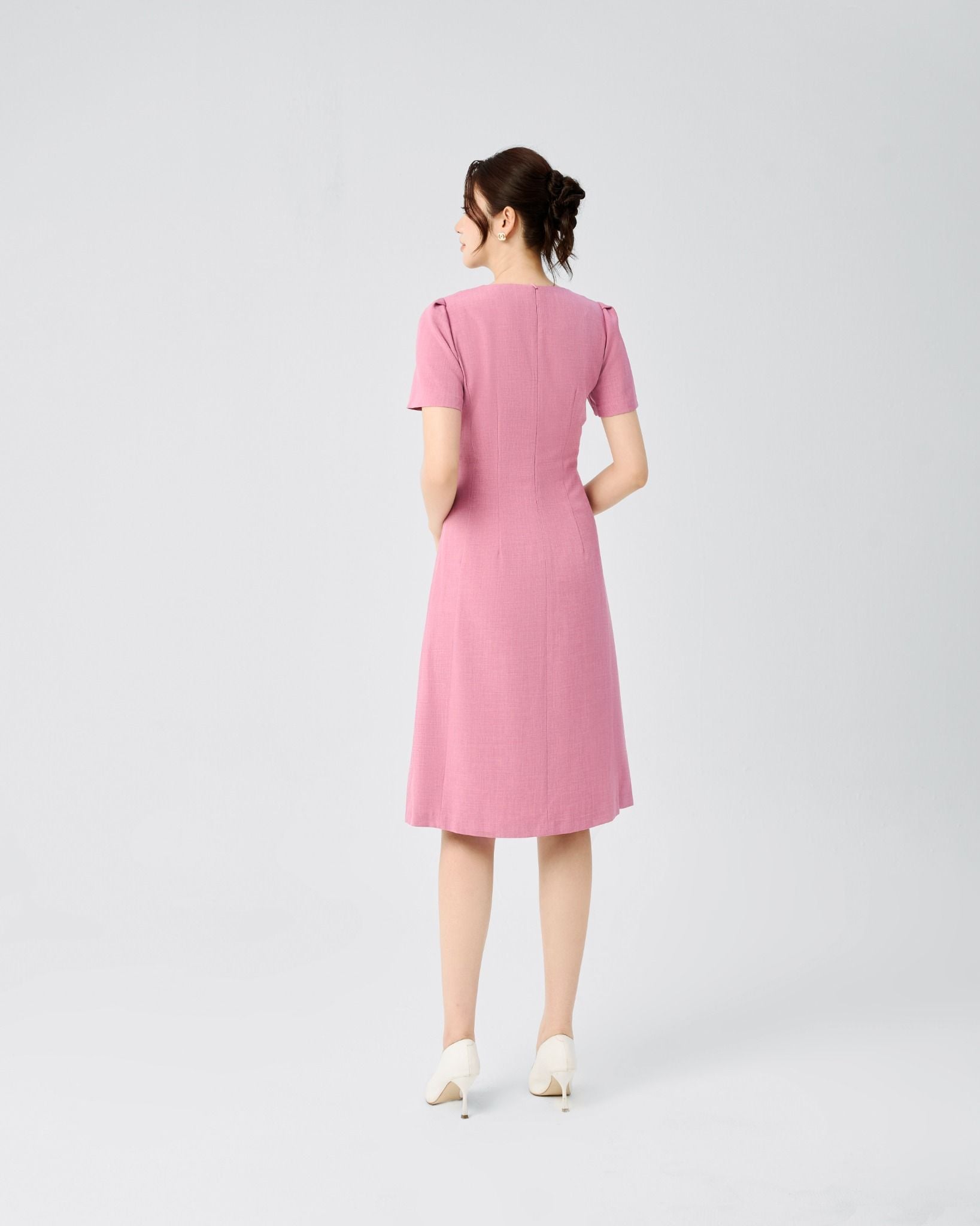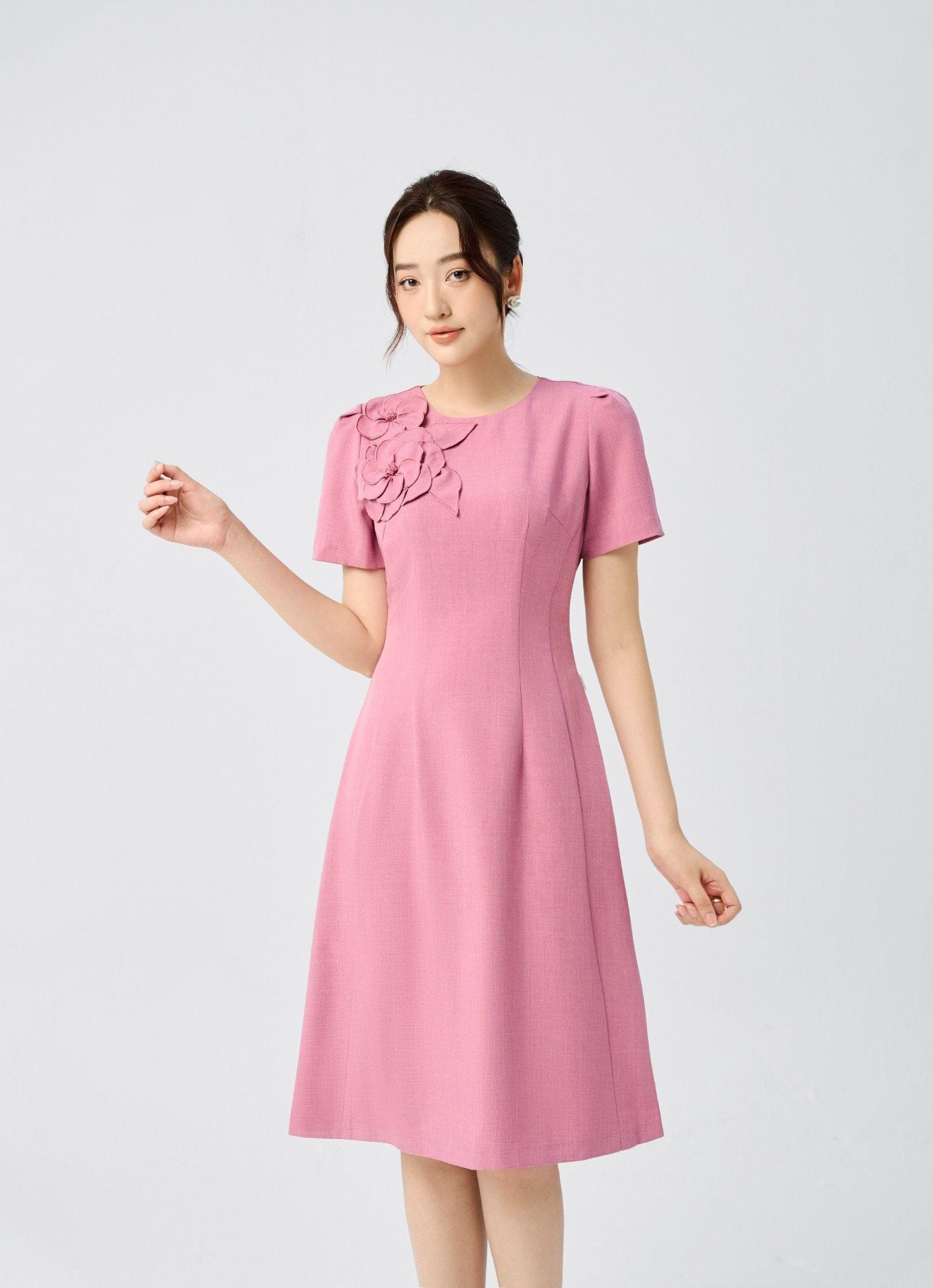 Kiểu dáng: đầm thiết kế dáng chữ A dài qua gối, tone màu hồng tím, đáp hoa nổi bản to