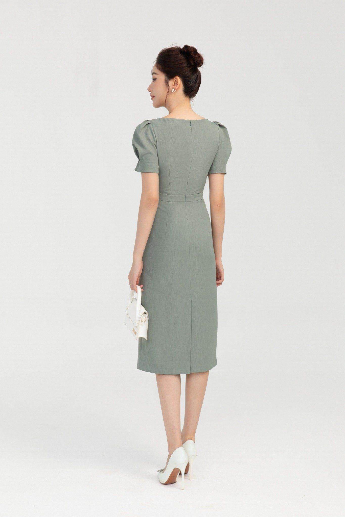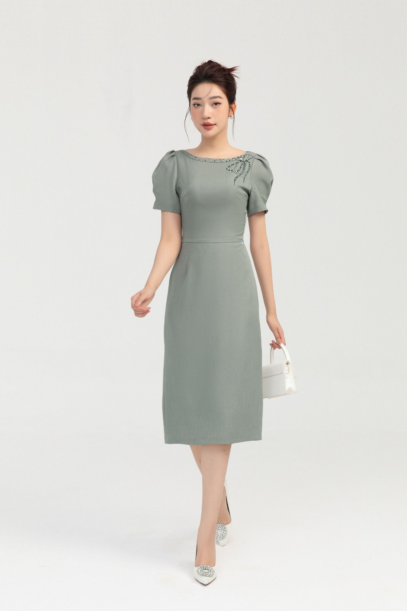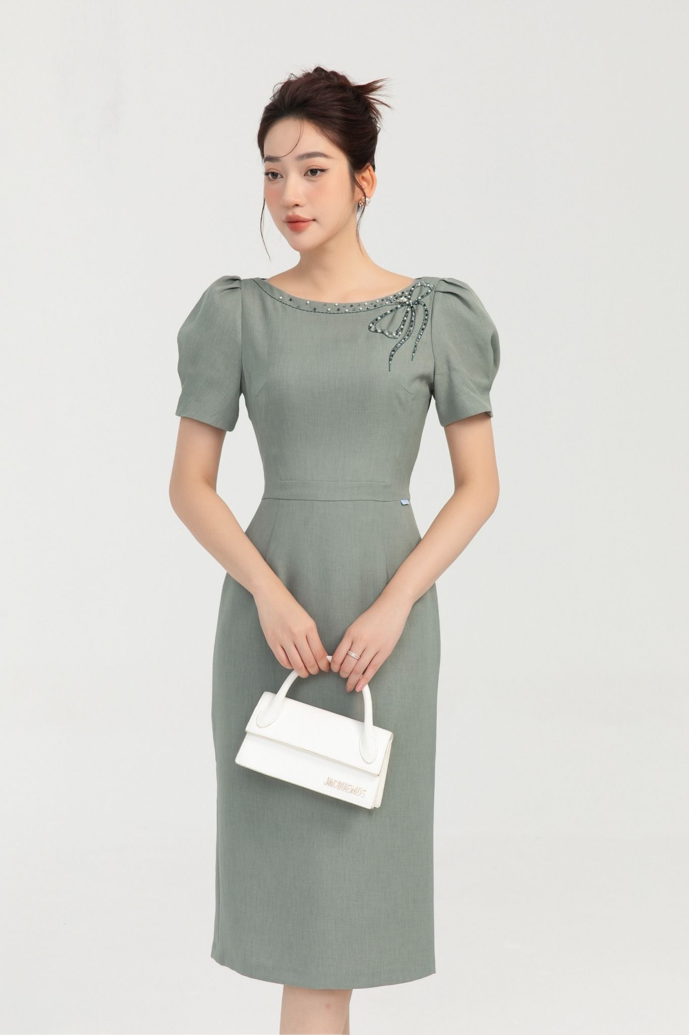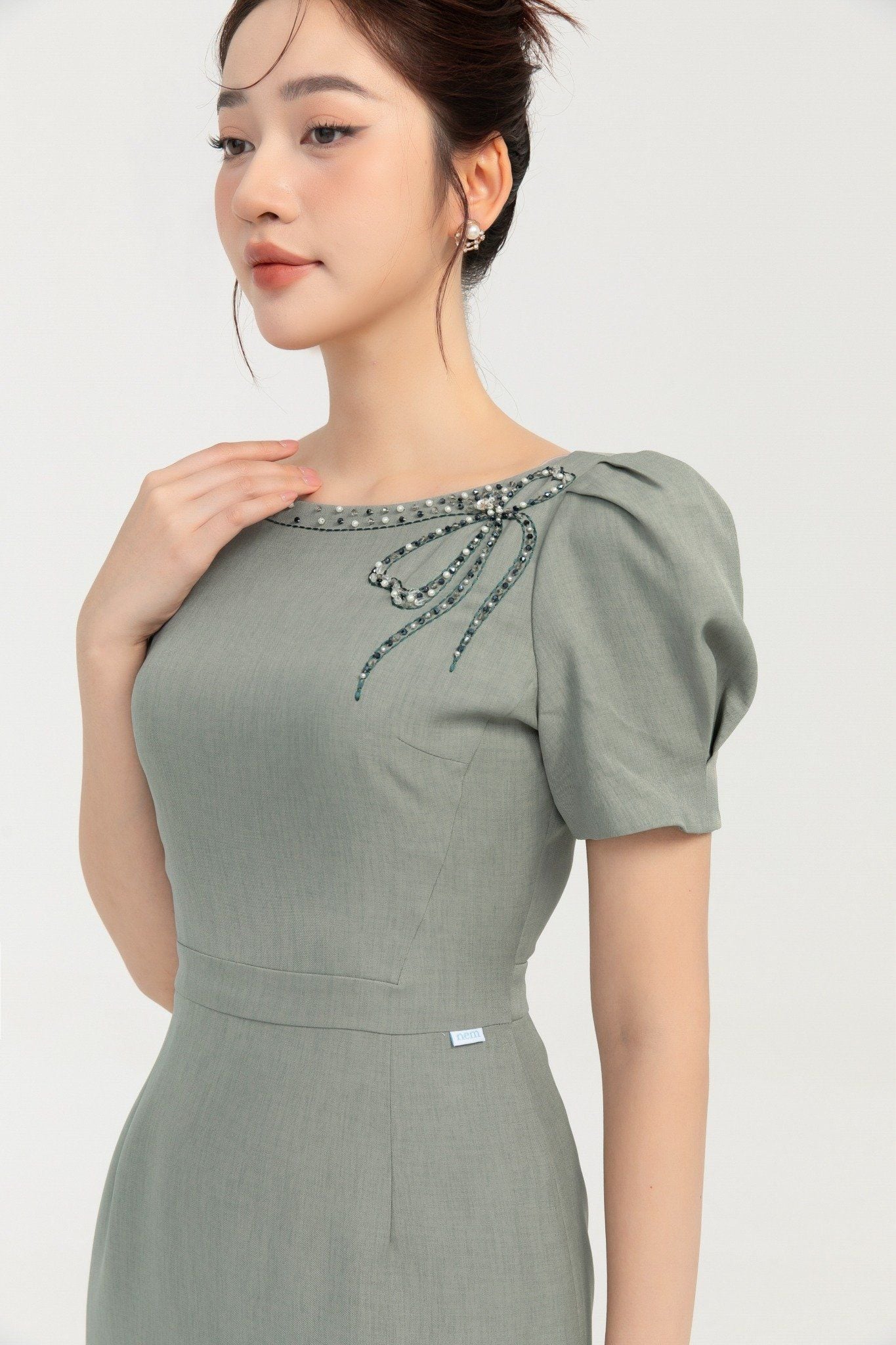 Kiểu dáng: đầm thiết kế dáng ôm dài qua gối, tay bồng, cổ đính cườm