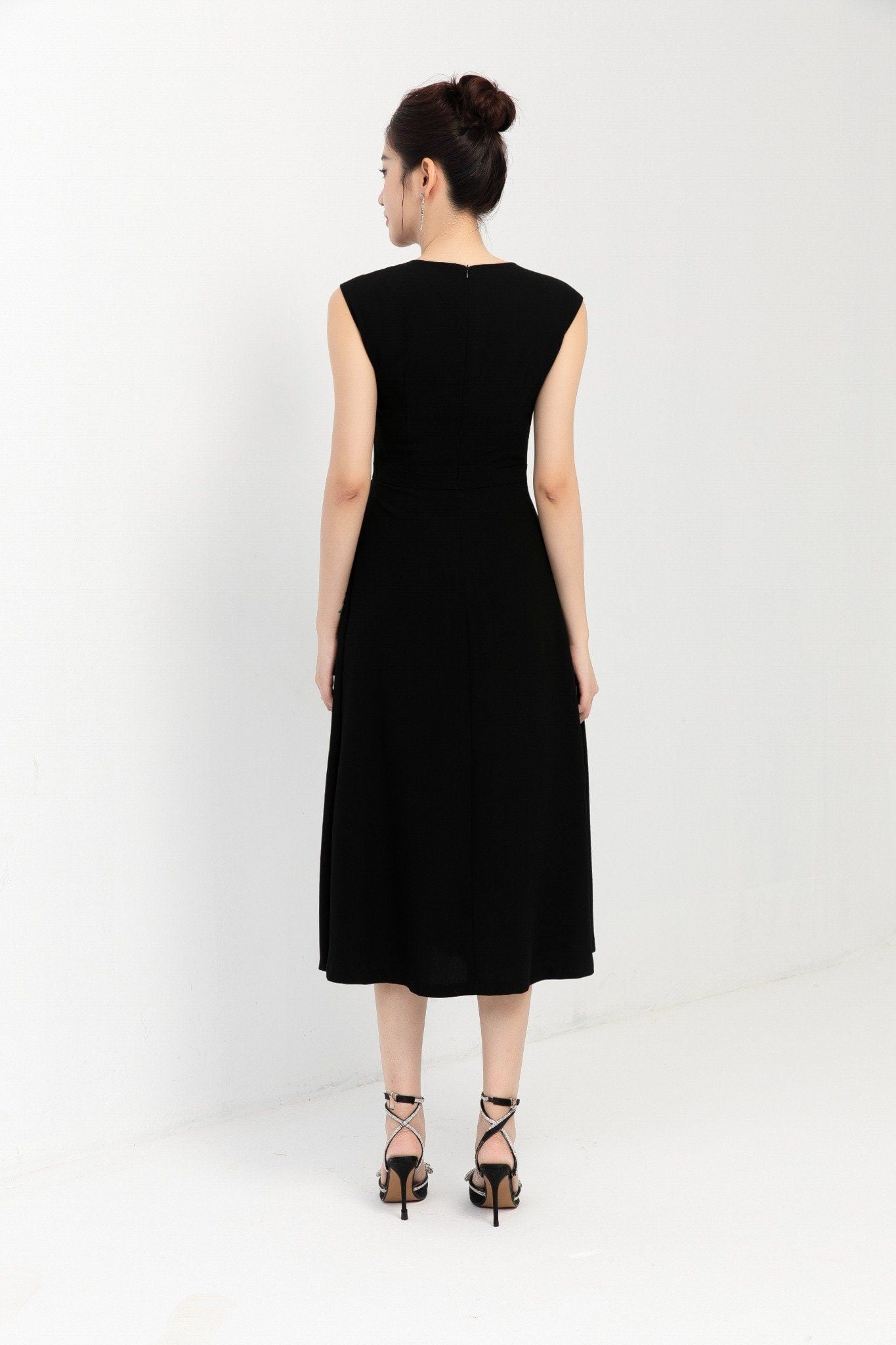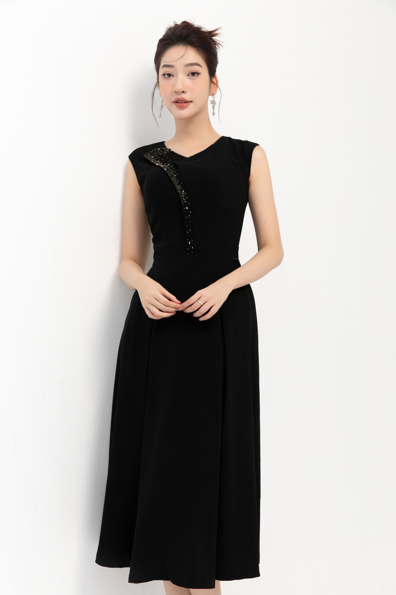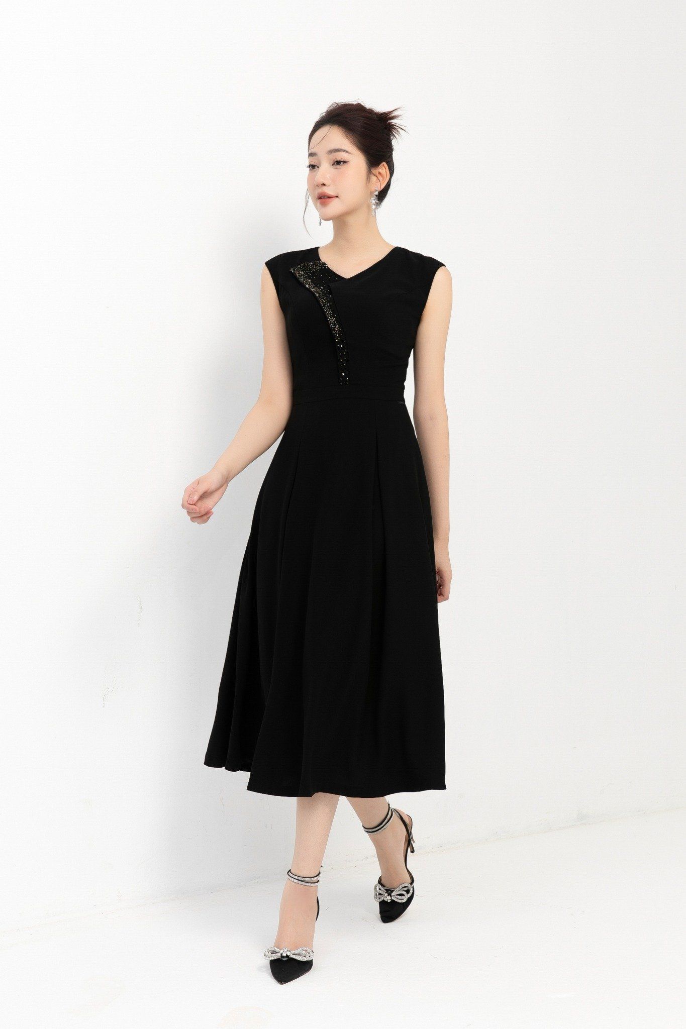 Kiểu dáng: đầm thiết kế dáng chữ A dài qua gối, không tay, tone màu đen trơn đính cườm