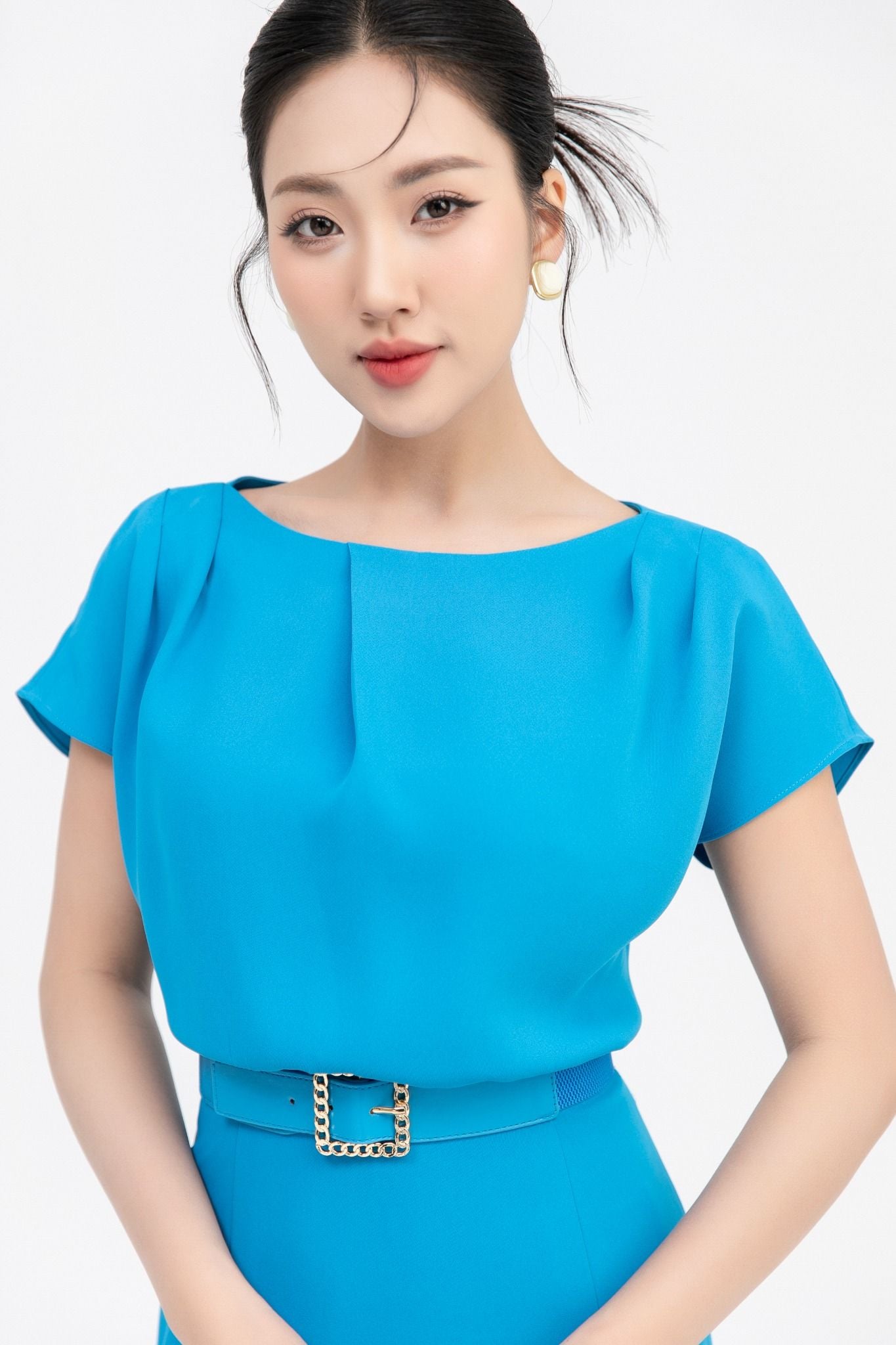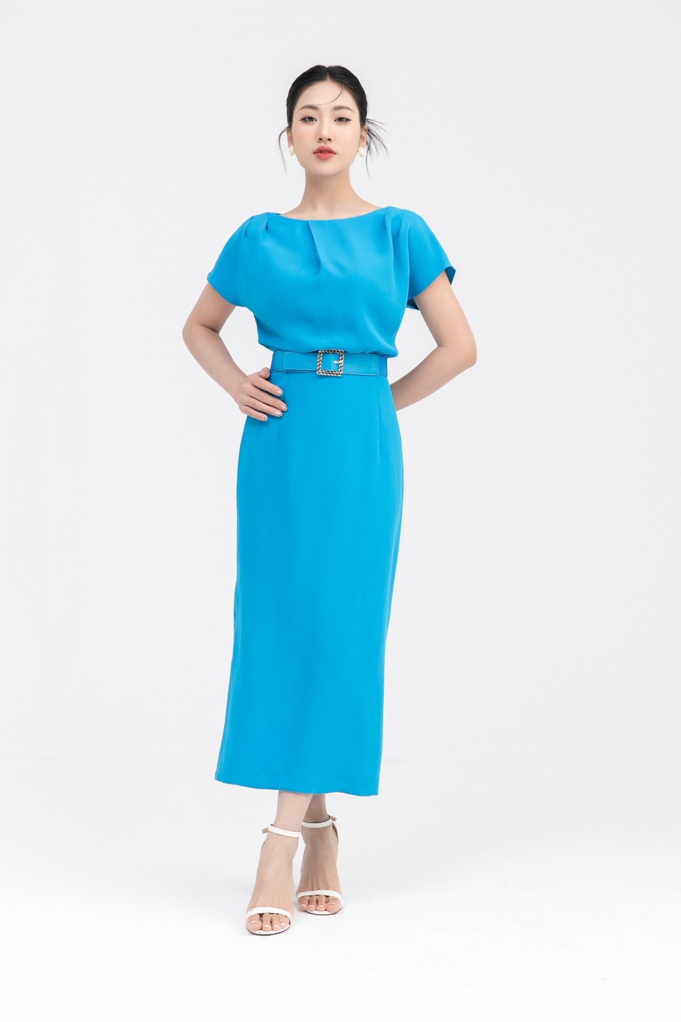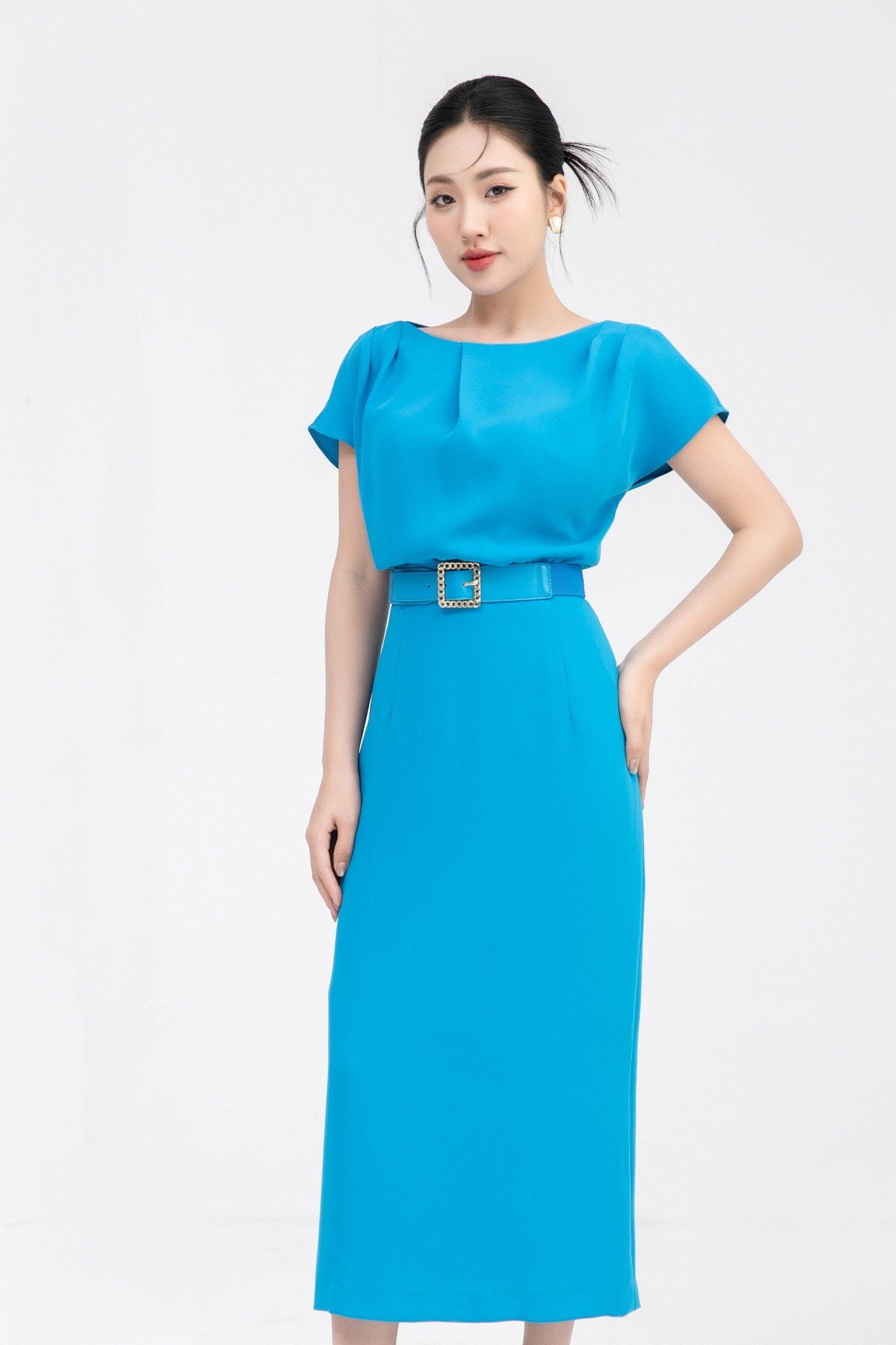 Kiểu dáng: đầm thiết kế dáng ôm dài qua gối, tone màu xanh trơn, kèm đai như hình