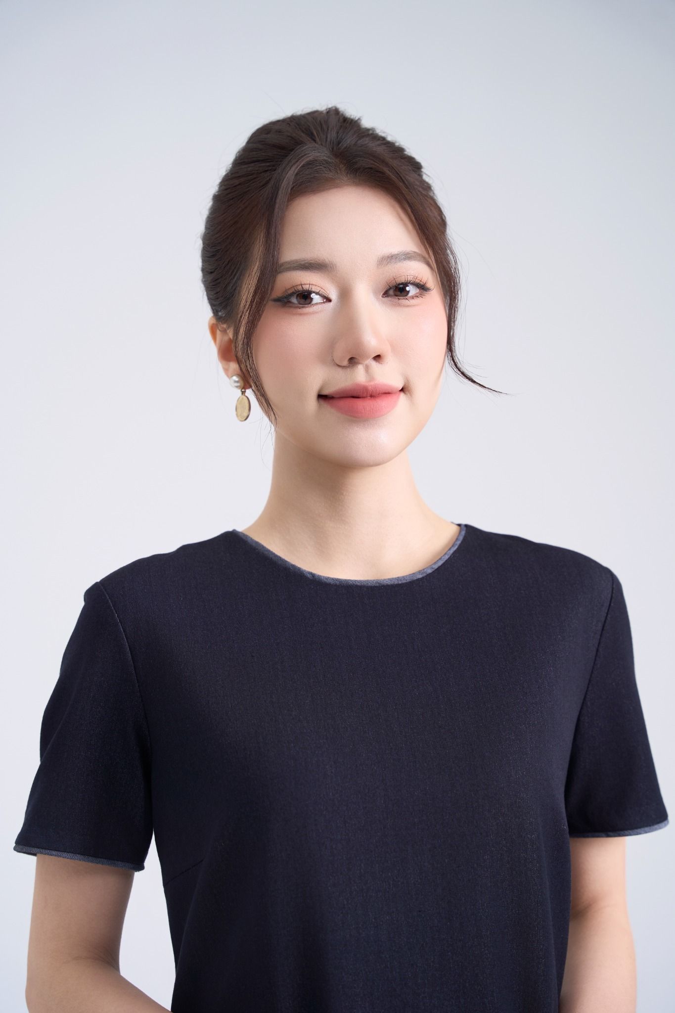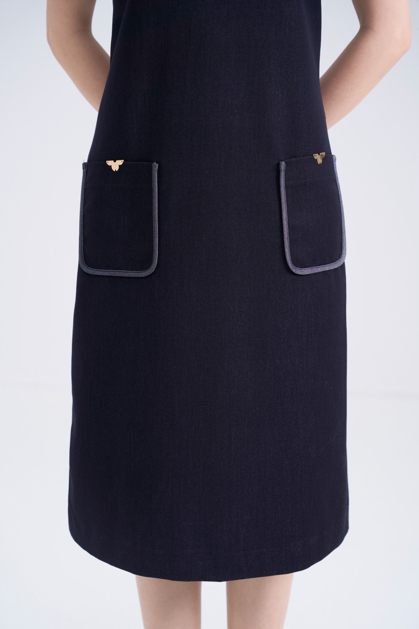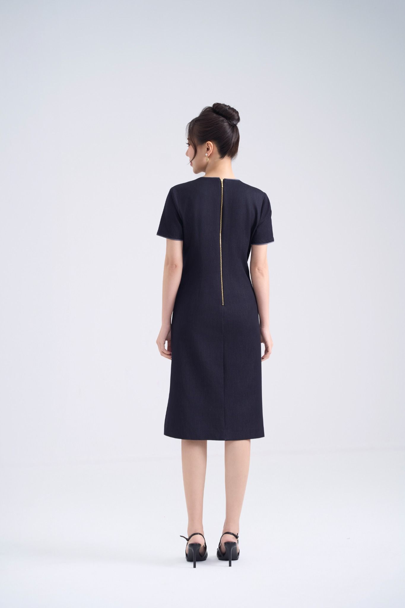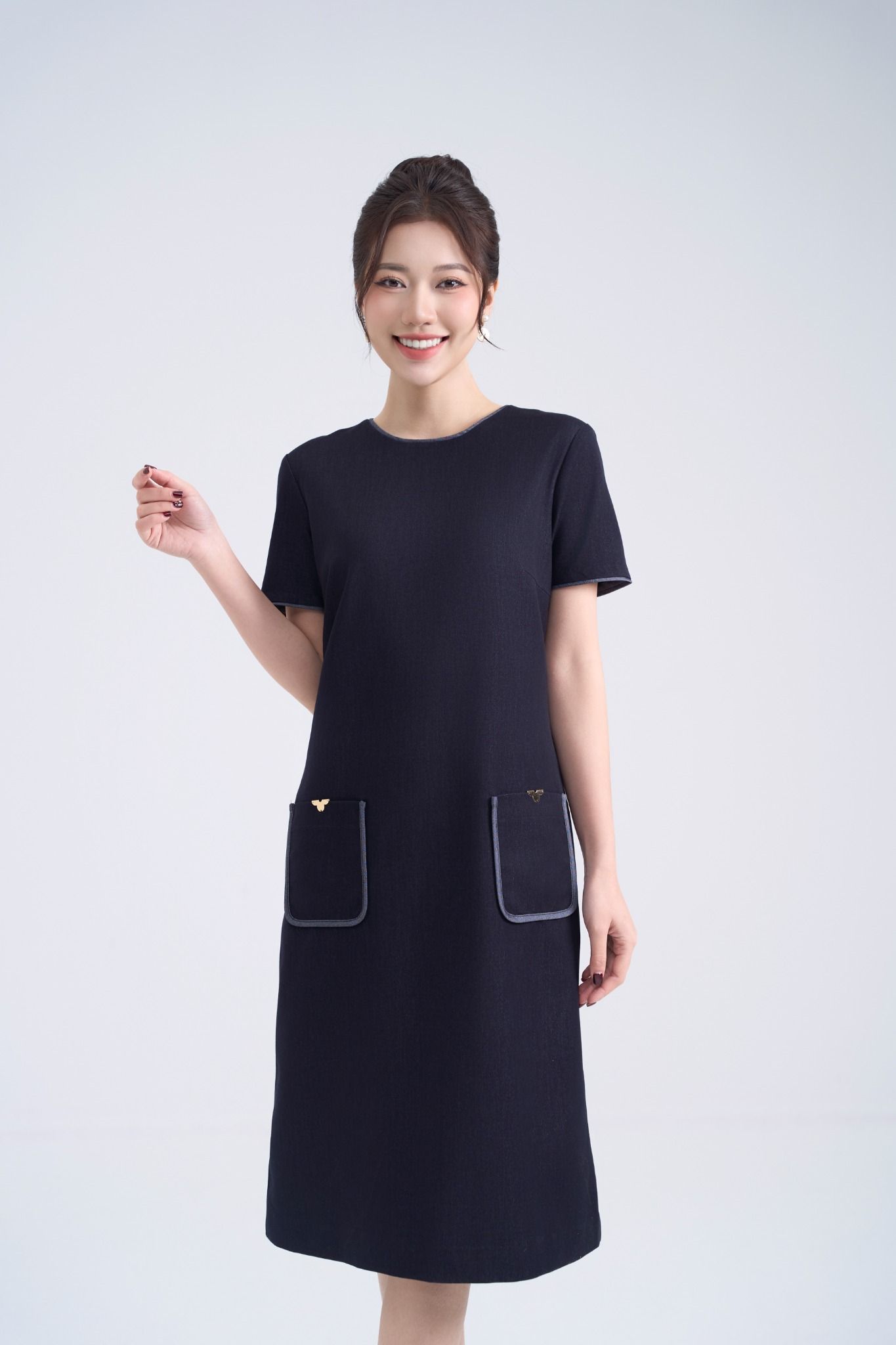 Kiểu dáng: đầm thiết kế dáng suông dài qua gối, tone màu xanh đậm, phối túi 2 bên