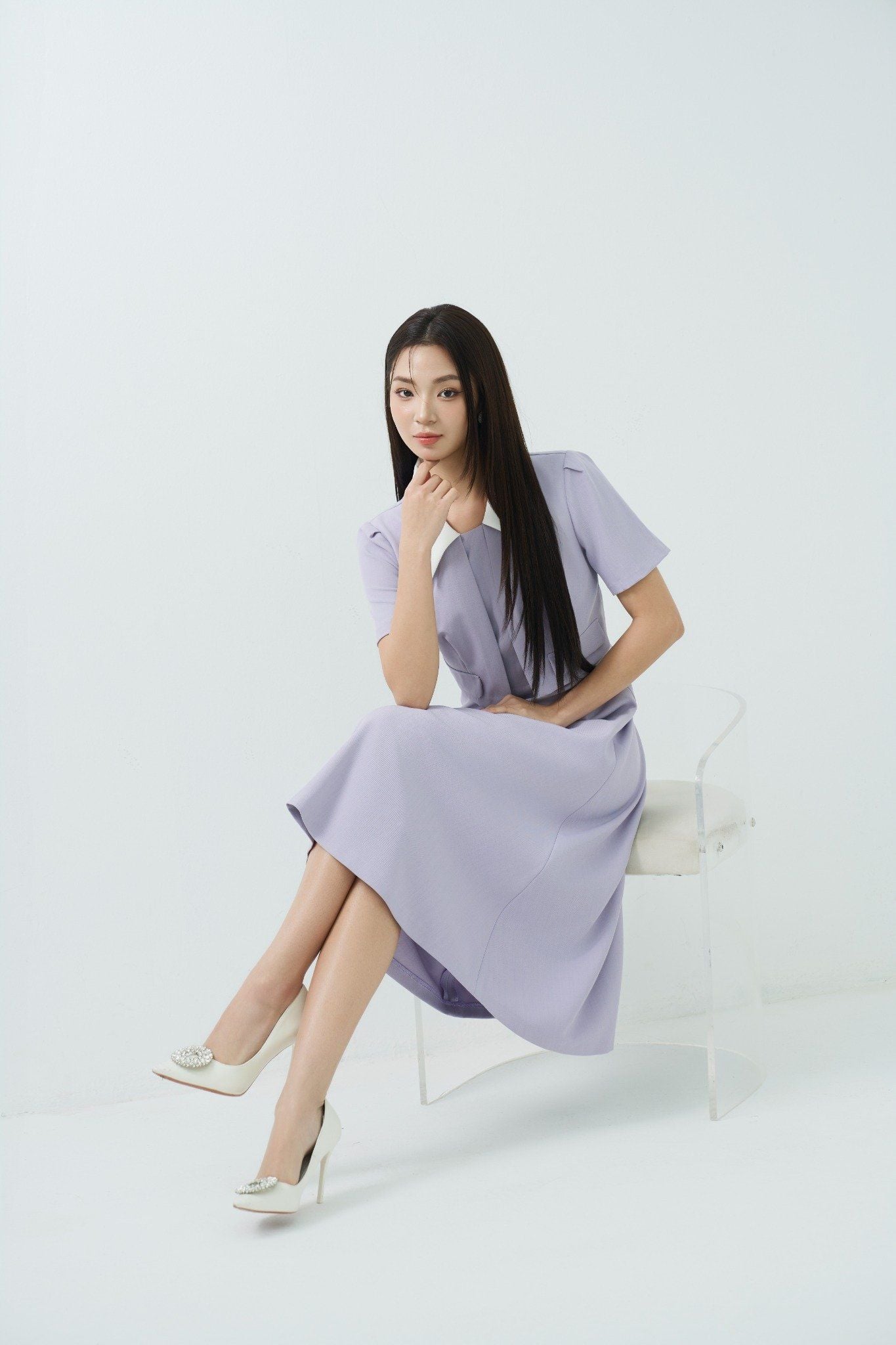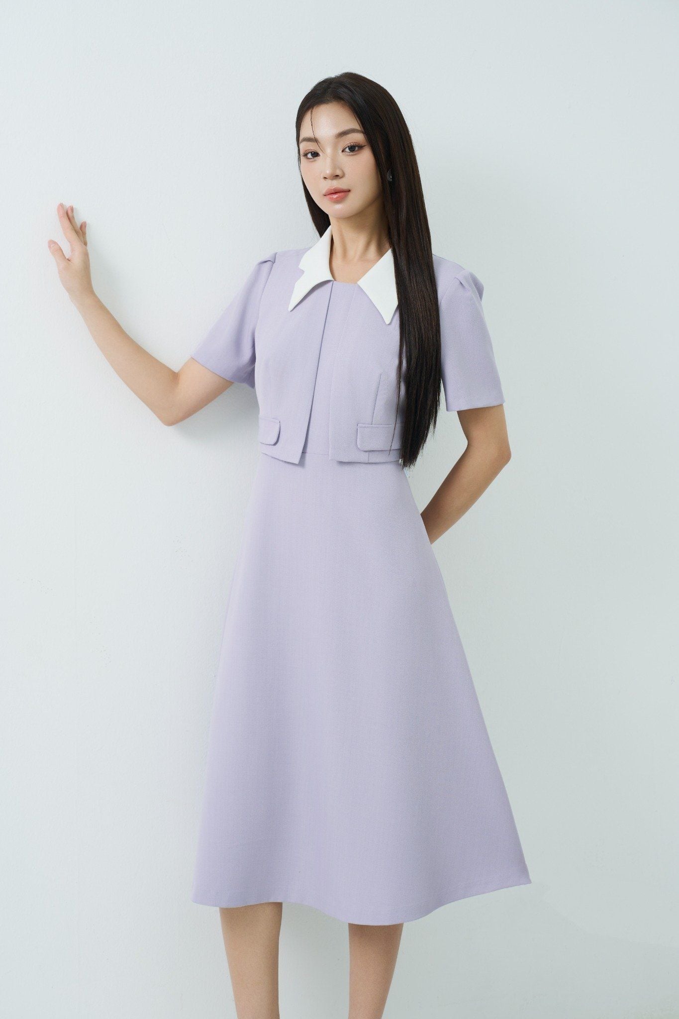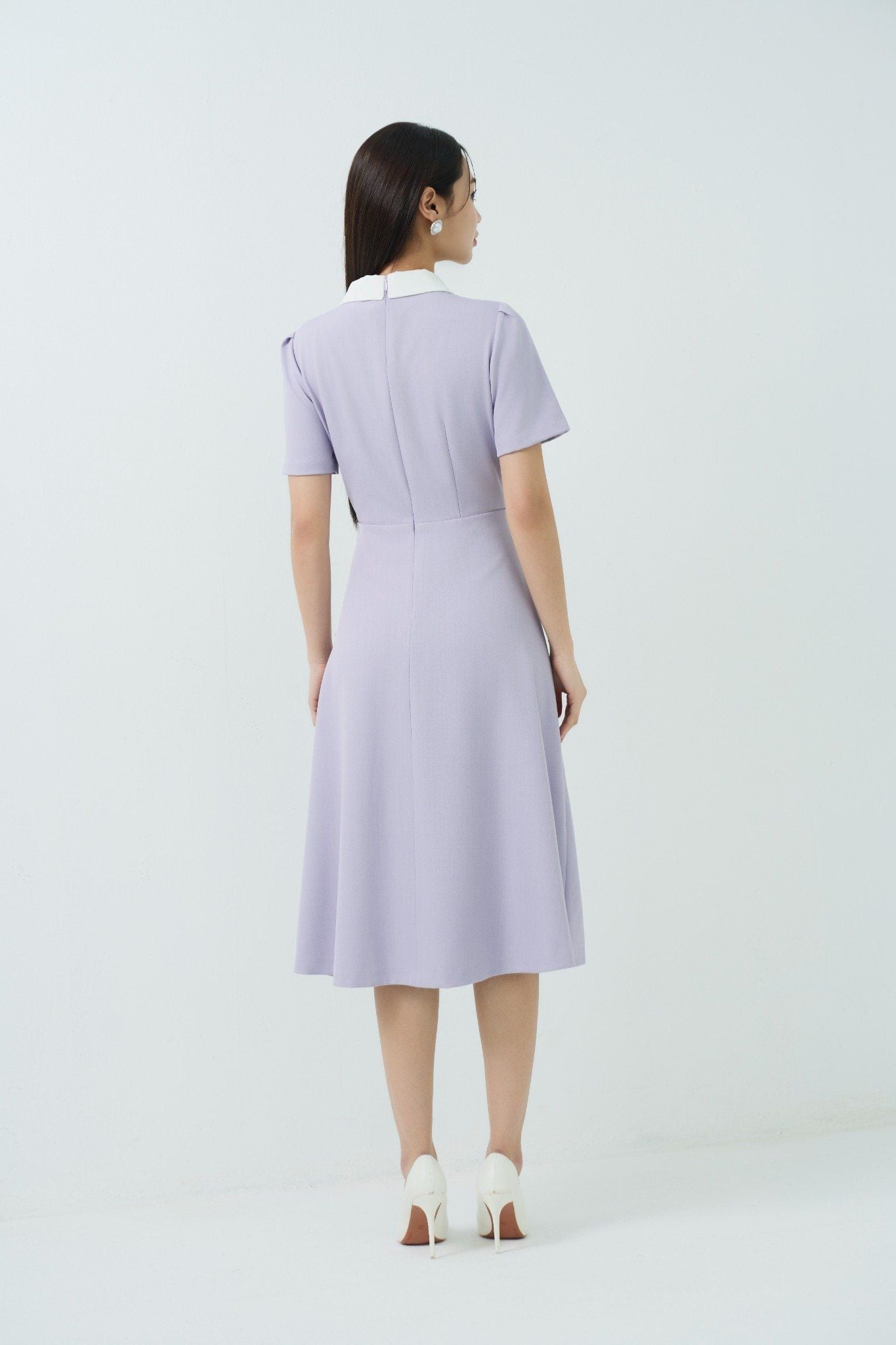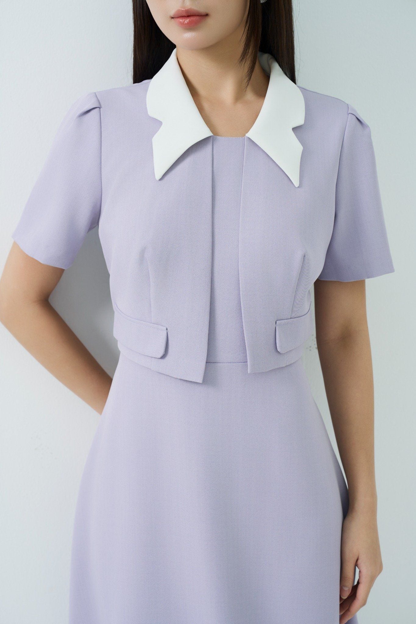 Kiểu dáng: đầm thiết kế dáng chữ A dài qua gối, tone màu tím nhạt phối cổ trắng