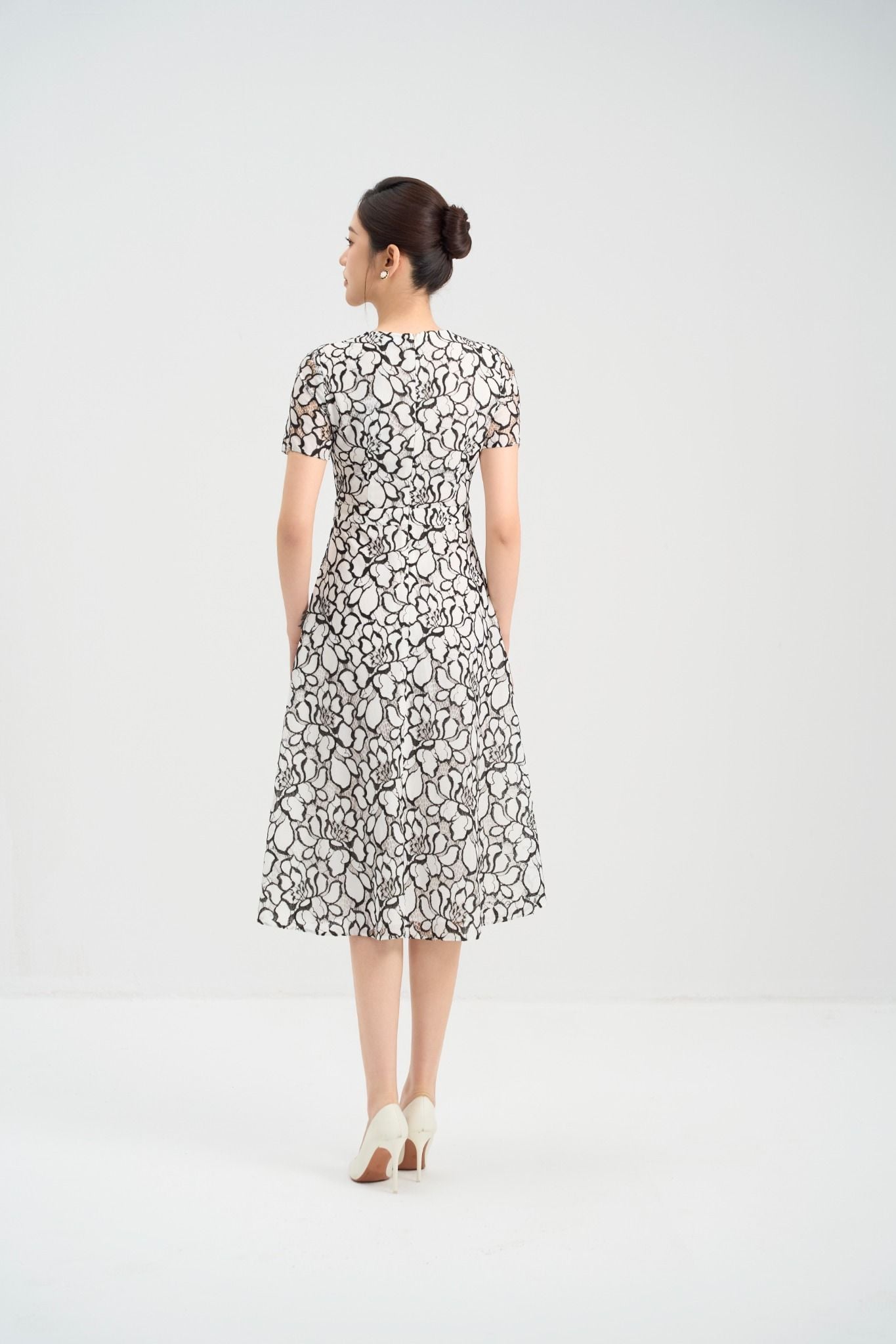 Kiểu dáng: đầm thiết kế dáng chữ A dài qua gối, cổ bẻ, tone màu trắng phối họa tiết hoa thêu viền đen