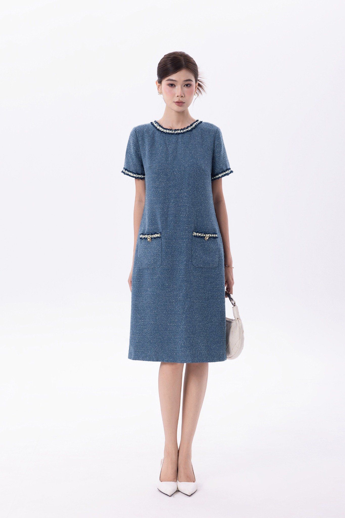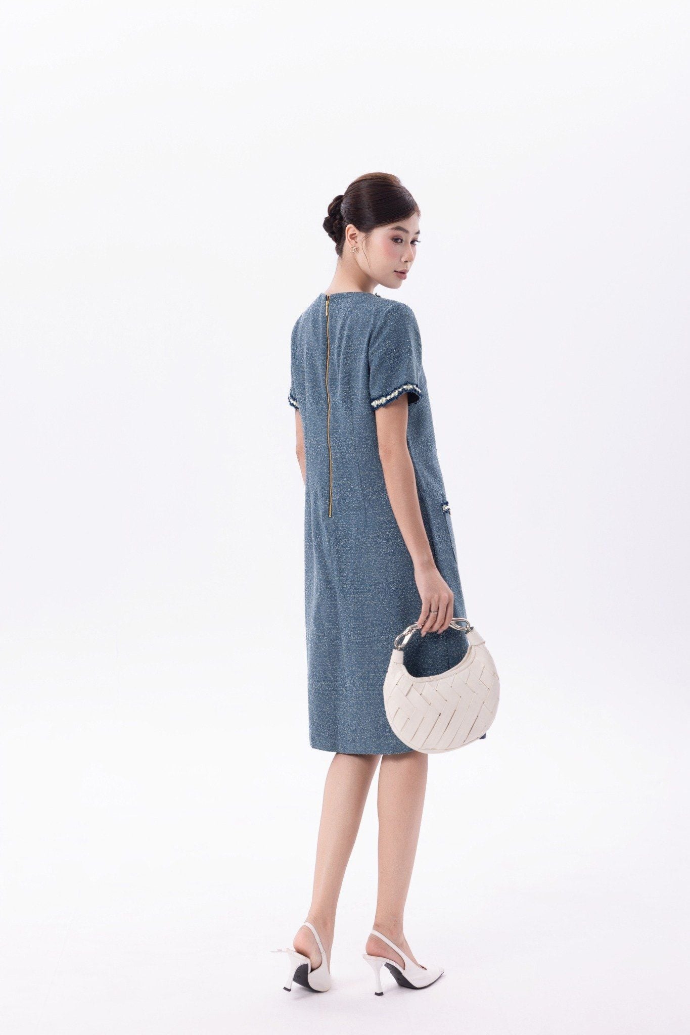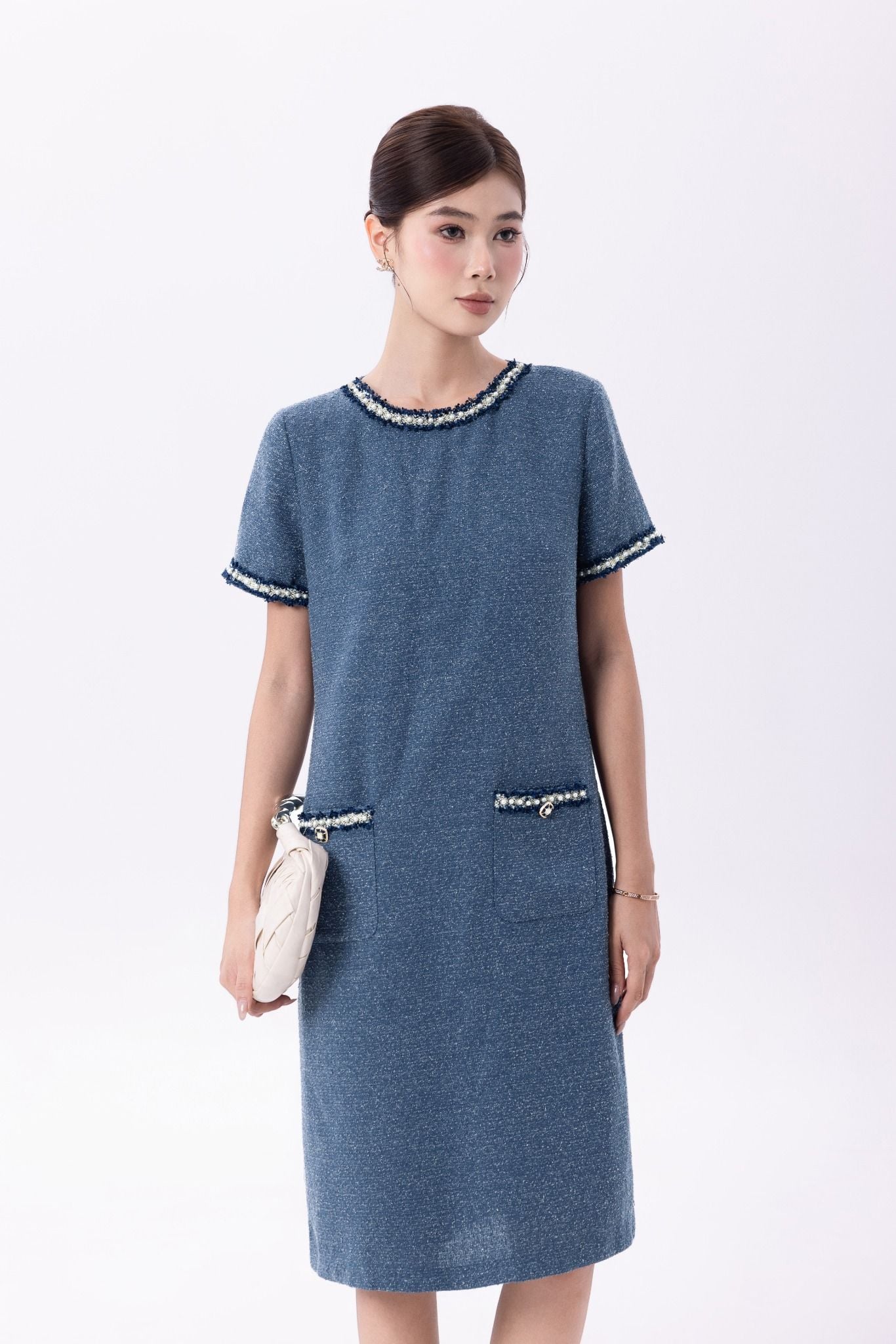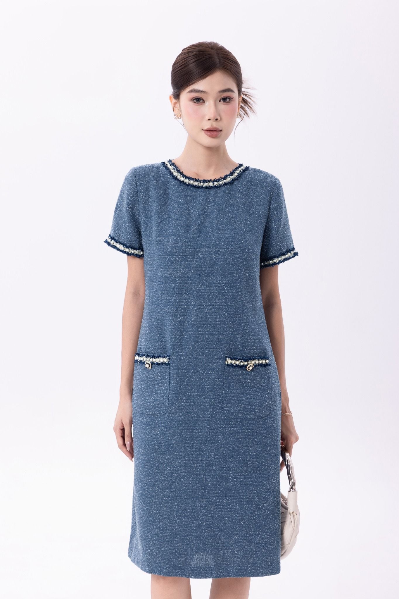 Kiểu dáng: đầm thiết kế dáng suông giúp che khuyết điểm cơ thể hiệu quả, độ dài qua gối, đầm sử dụng tone màu xanh phối viền trắng cùng ngọc đính sang trọng