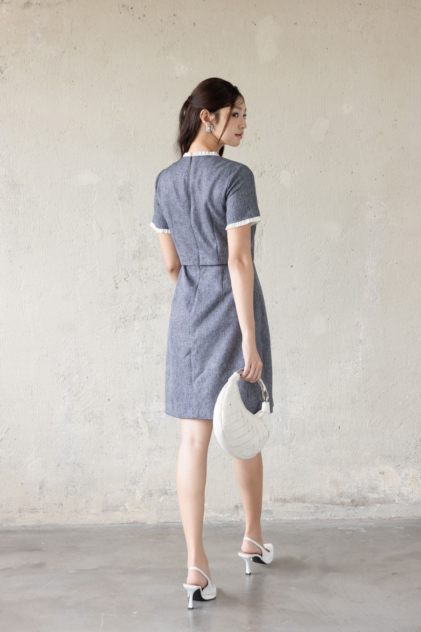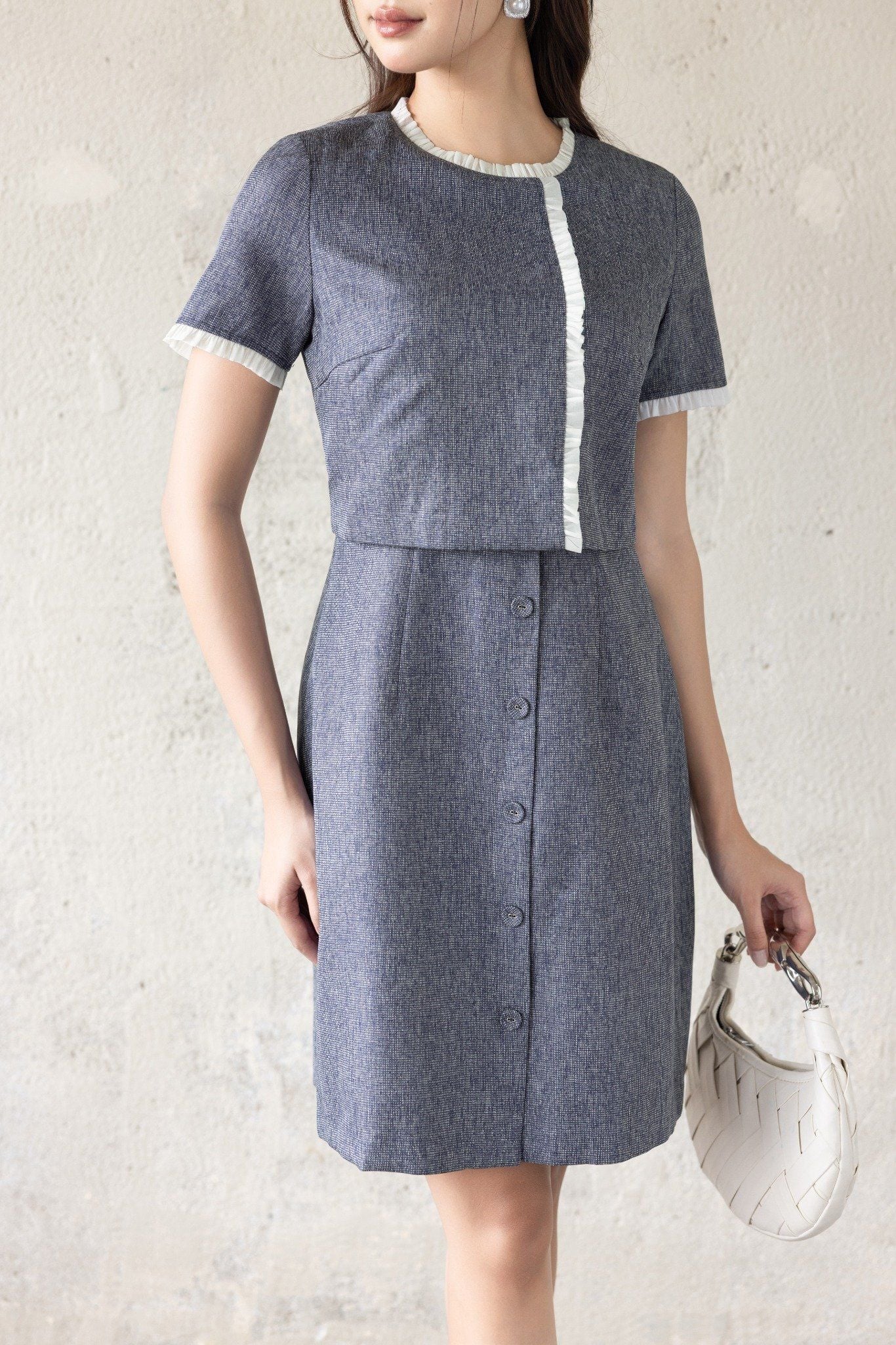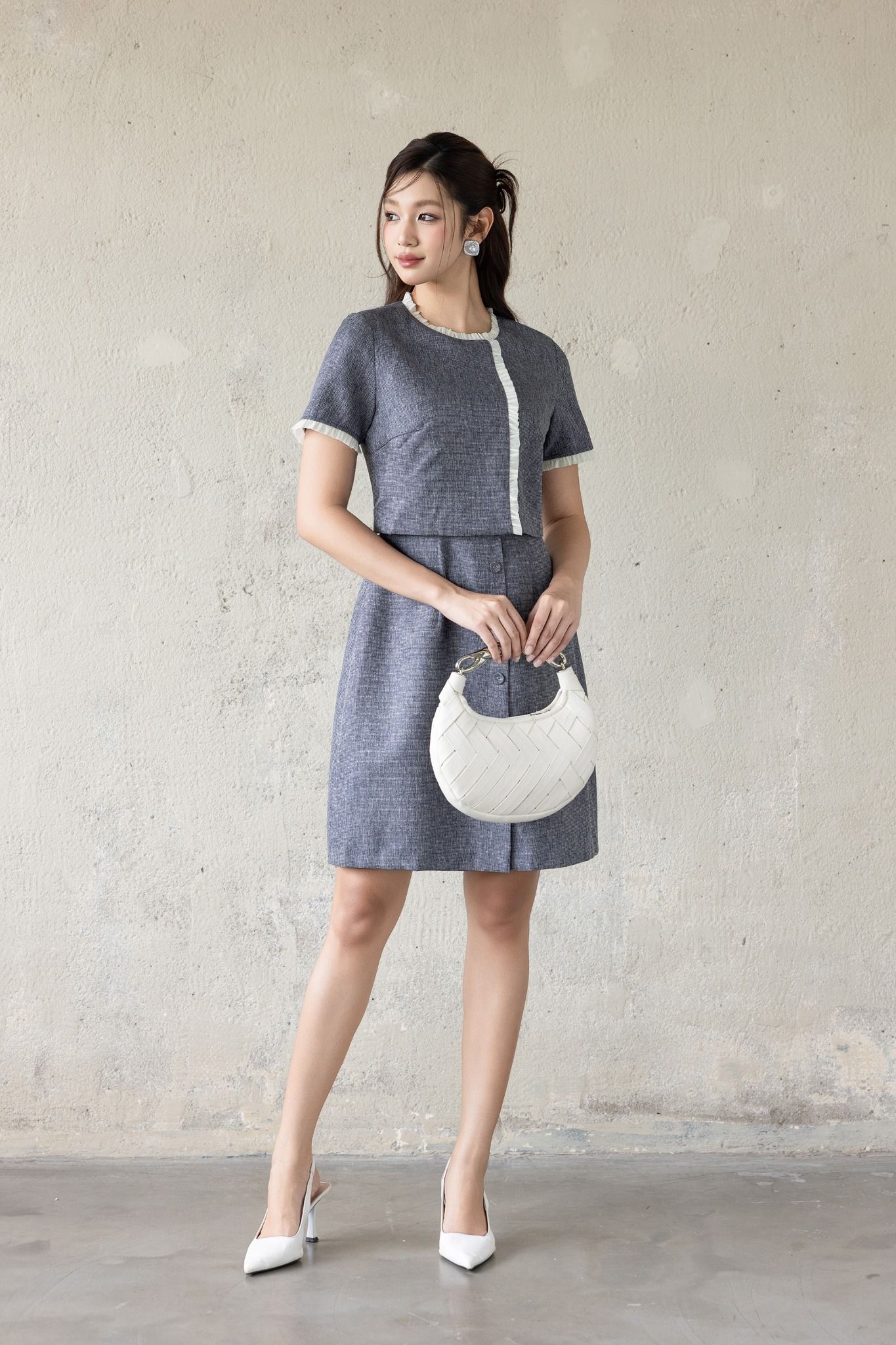 Kiểu dáng: đầm liền thiết kế dáng chữ A xoè nhẹ dài qua gối giúp tôn vòng eo và che khuyết điểm cơ thể hiệu quả. Đầm sử dụng tone màu xanh phối viền đăng ten trắng