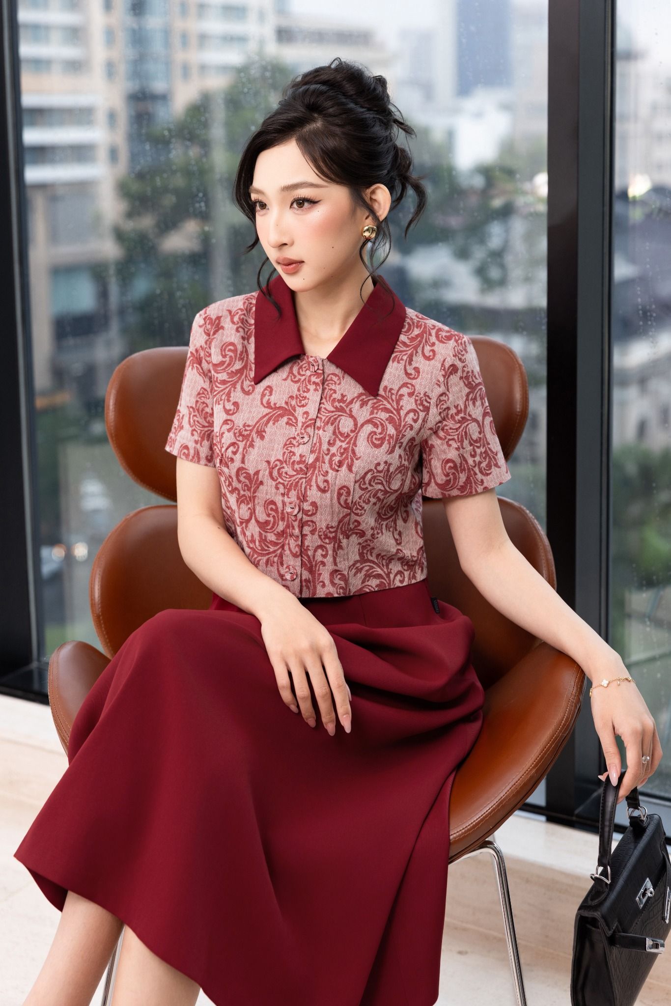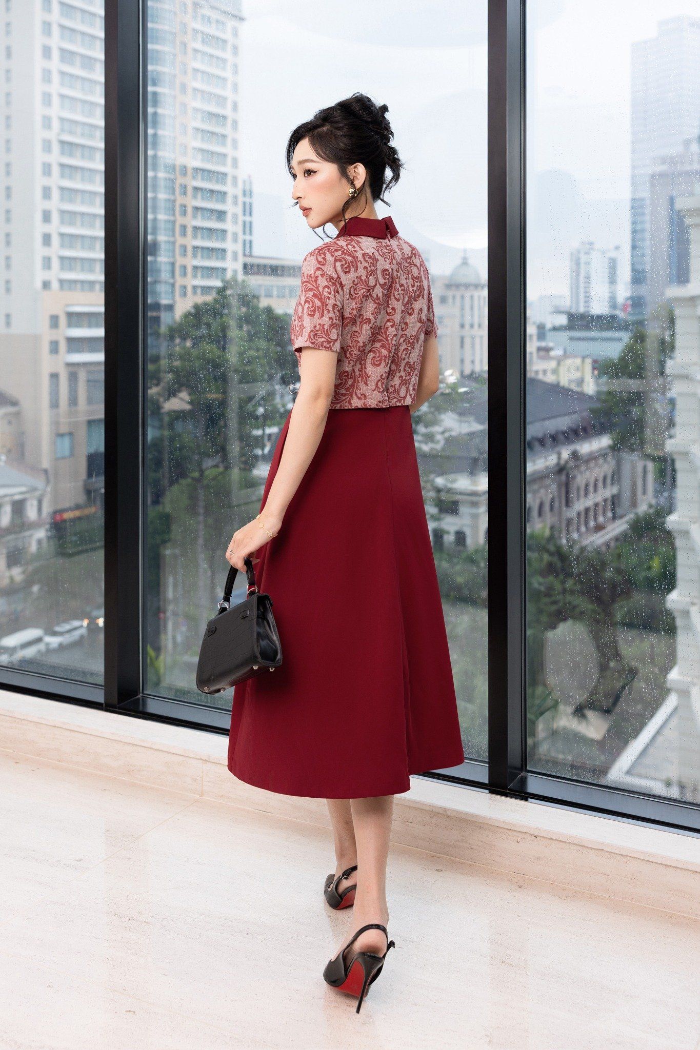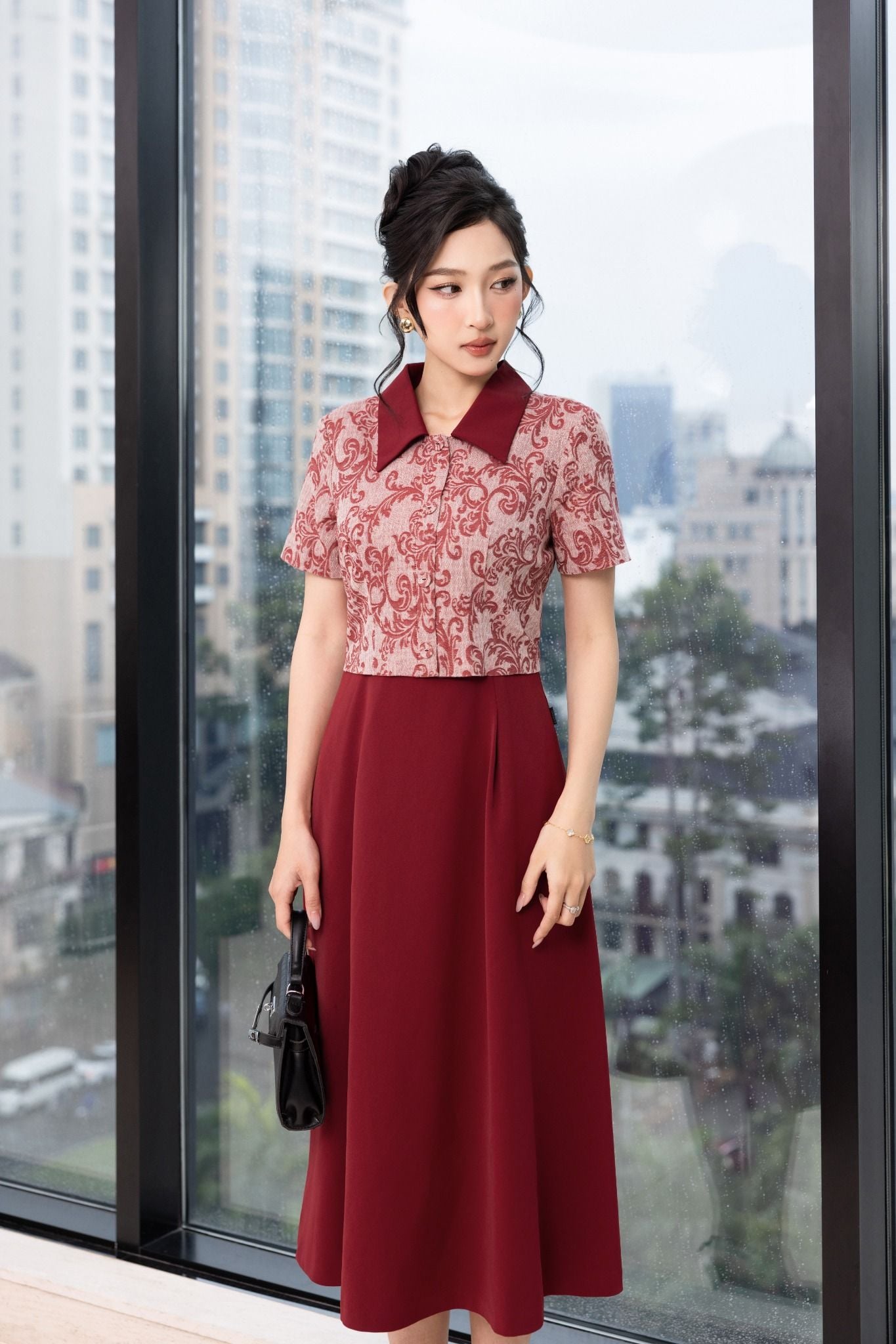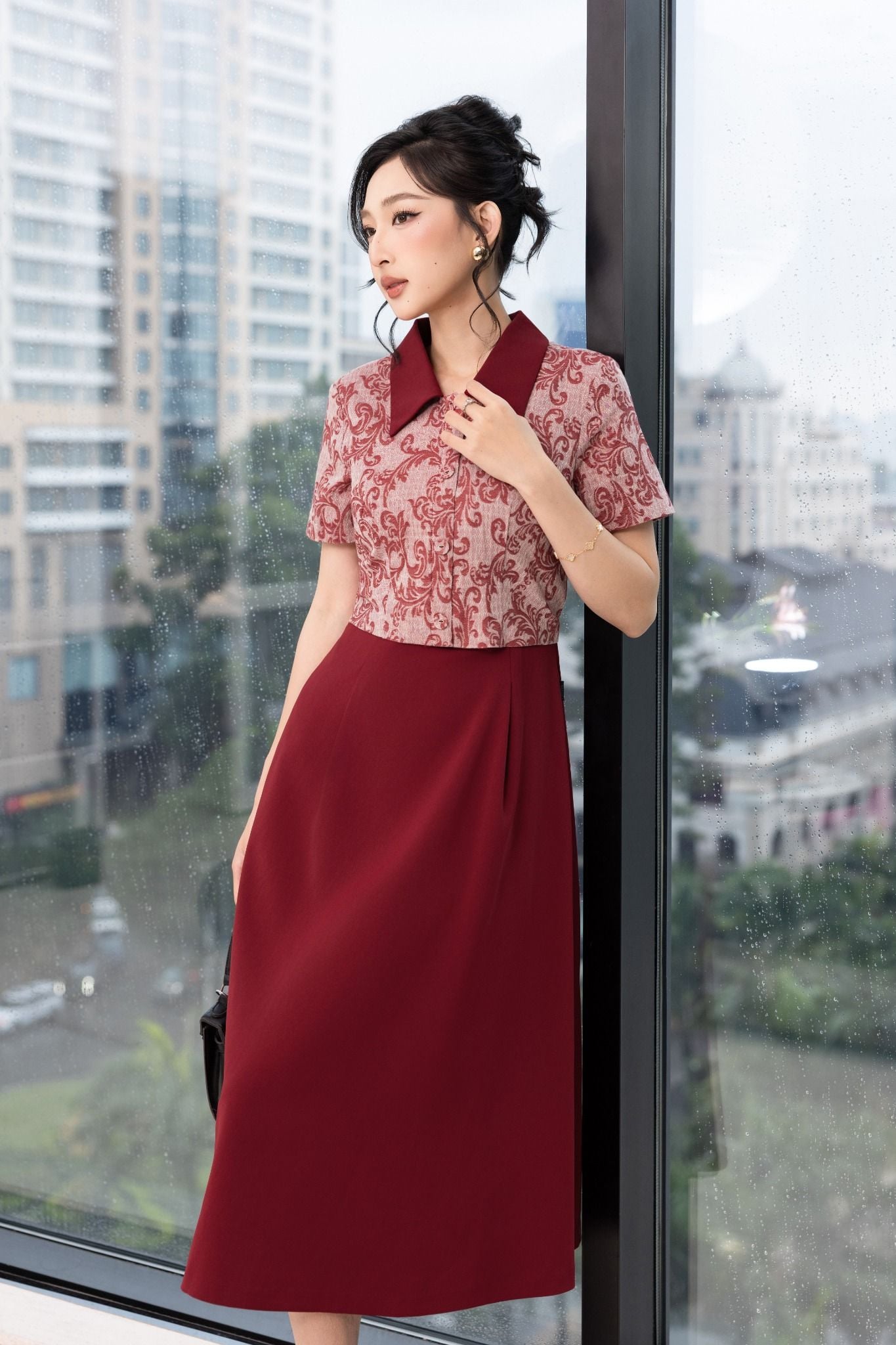 Kiểu dáng: đầm liền thiết kế dáng chữ A xoè nhẹ dài qua gối tạo sự thướt tha, uyển chuyển trong từng bước đi. Đầm sử dụng tone màu đỏ đô sang trọng kết hợp cùng hoạ tiết in nổi bật.