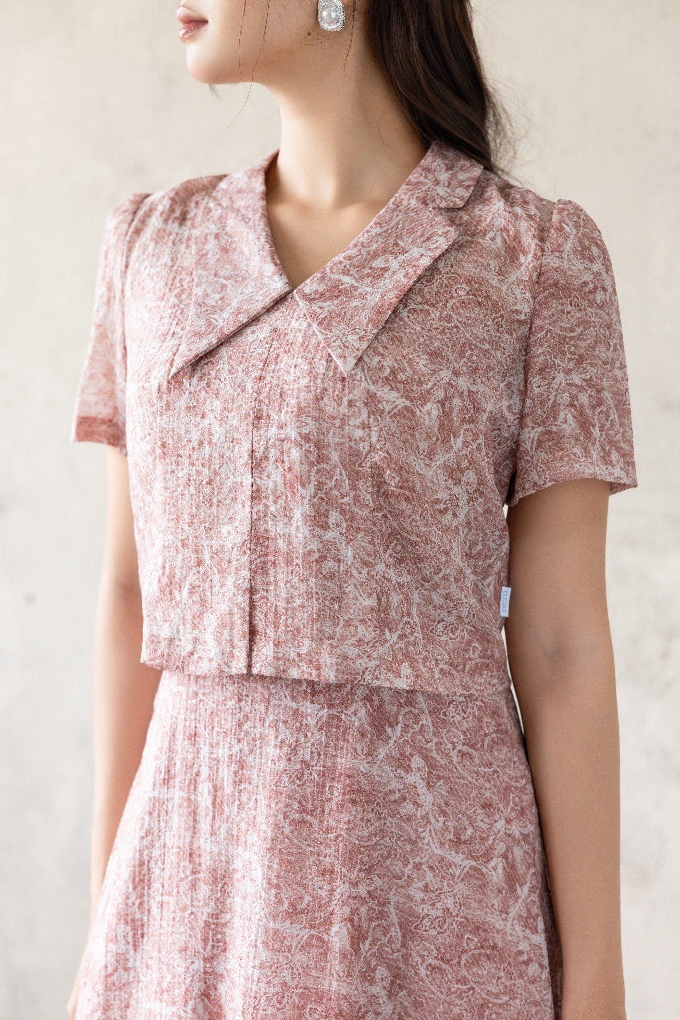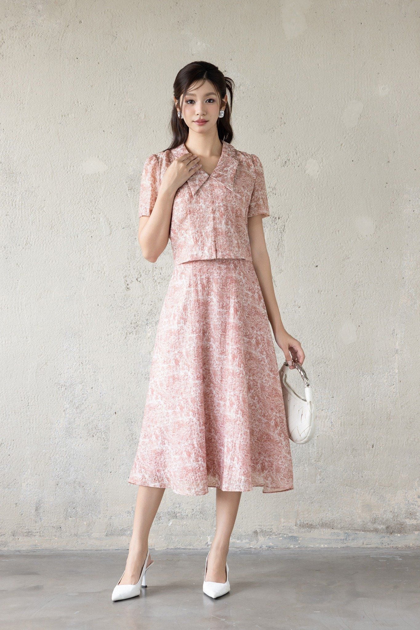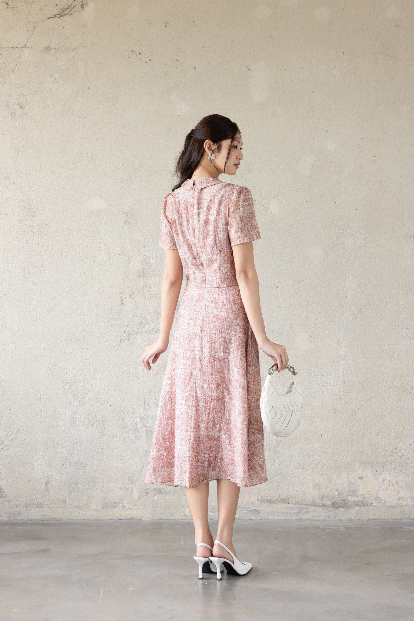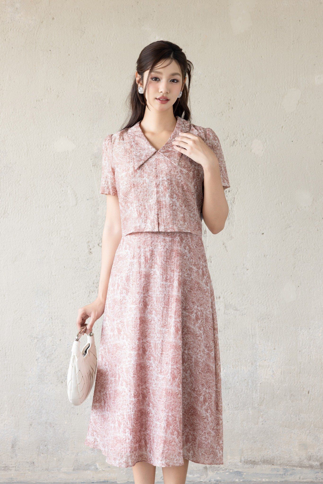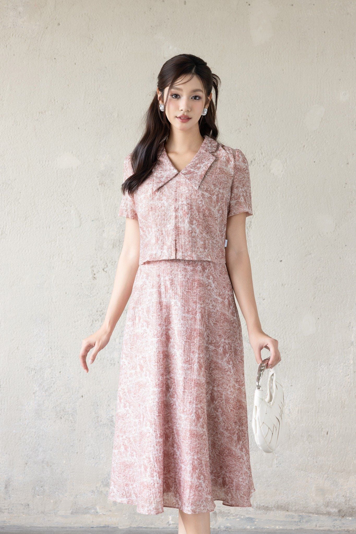 Kiểu dáng: đầm liền thiết kế dáng chữ A xoè nhẹ dài qua gối tạo sự thướt tha, uyển chuyển trong từng bước đi. Đầm sử dụng tone màu hồng phối hoạ tiết