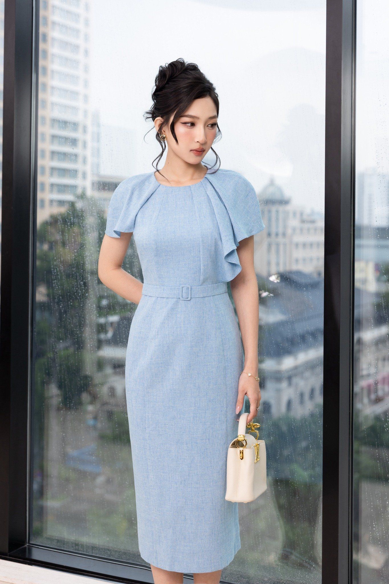 Kiểu dáng: đầm tiệc thiết kế dáng bút chì giúp tôn dáng tối đa, độ ôm vừa phải cùng chi tiết xẻ phía sau giúp người mặc di chuyển dễ dàng và giữ được sự thoải mái, độ dài qua gối. Đầm sử dụng tone màu xanh nhạt kết hợp phần vai rủ cách điệu mang tới sự sang trọng, lịch sự cho người mặc