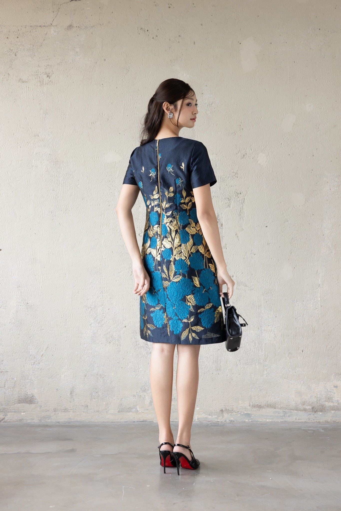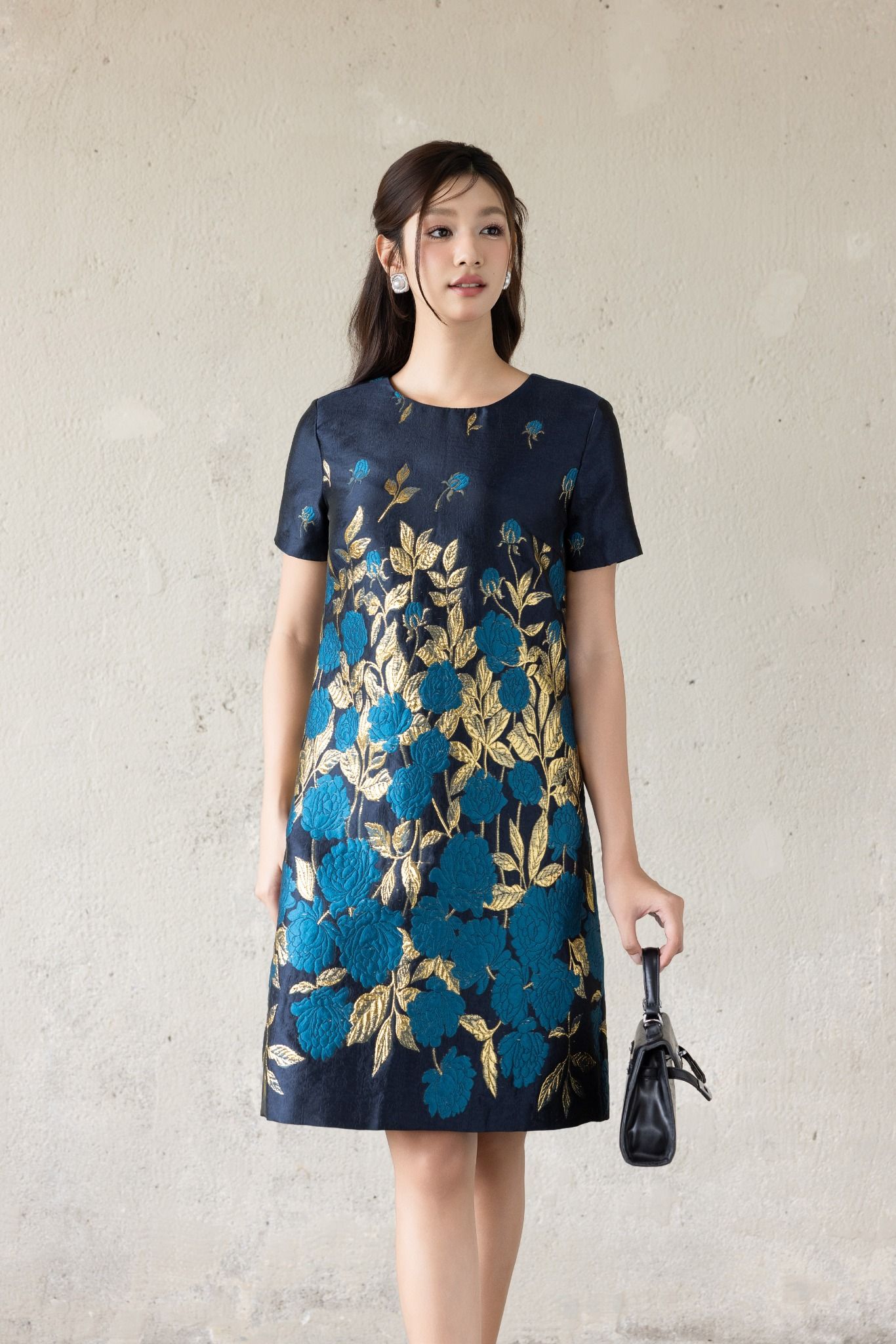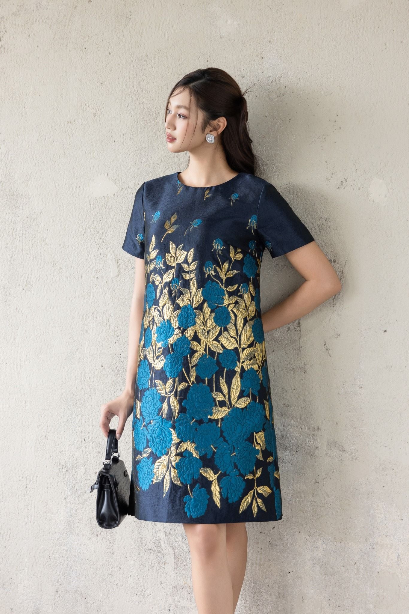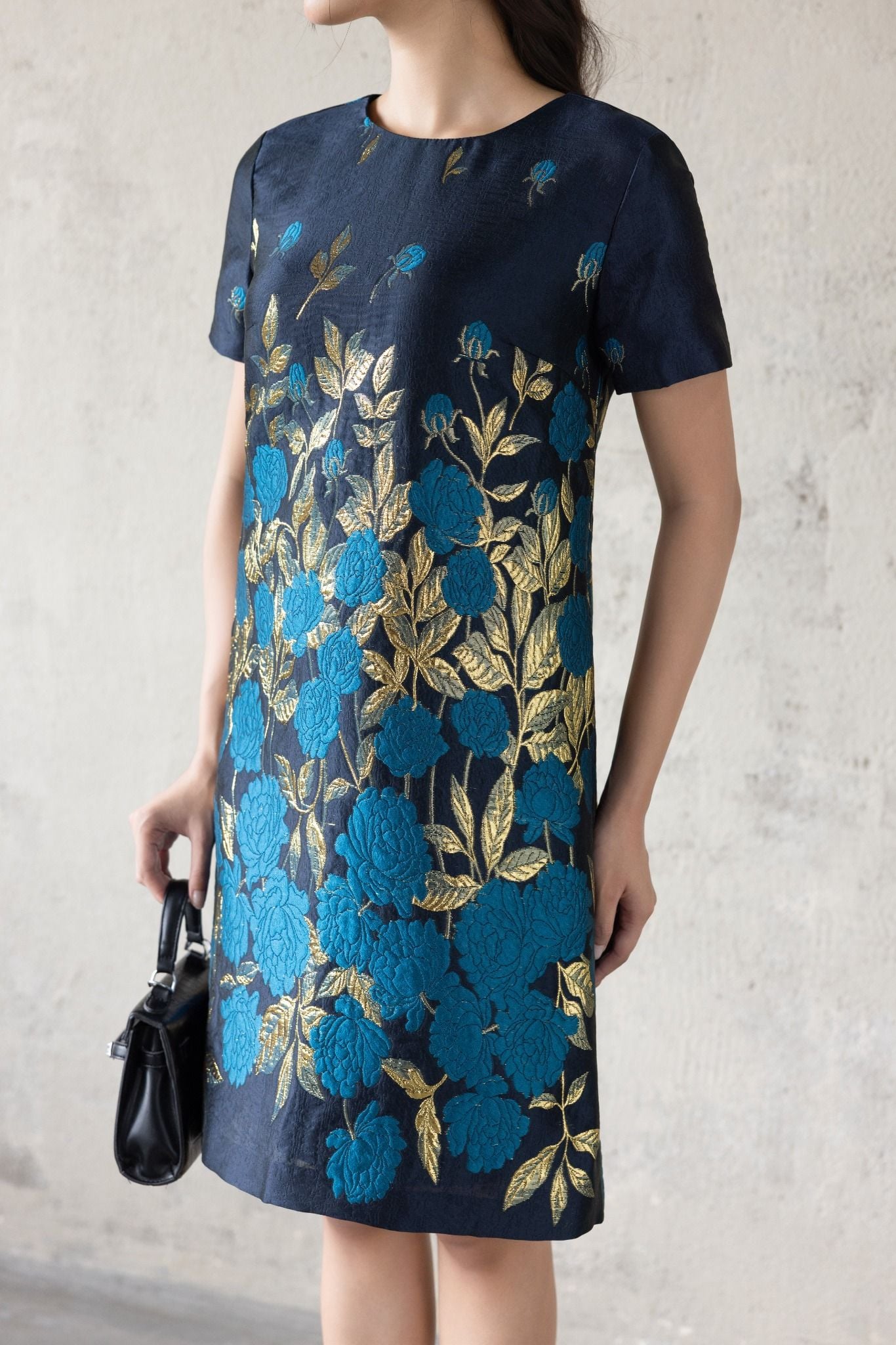 Kiểu dáng: đầm thiết kế dáng suông giúp che khuyết điểm cơ thể hiệu quả, độ dài qua gối, đầm sử dụng tone màu xanh phối hoạ tiết hoa in