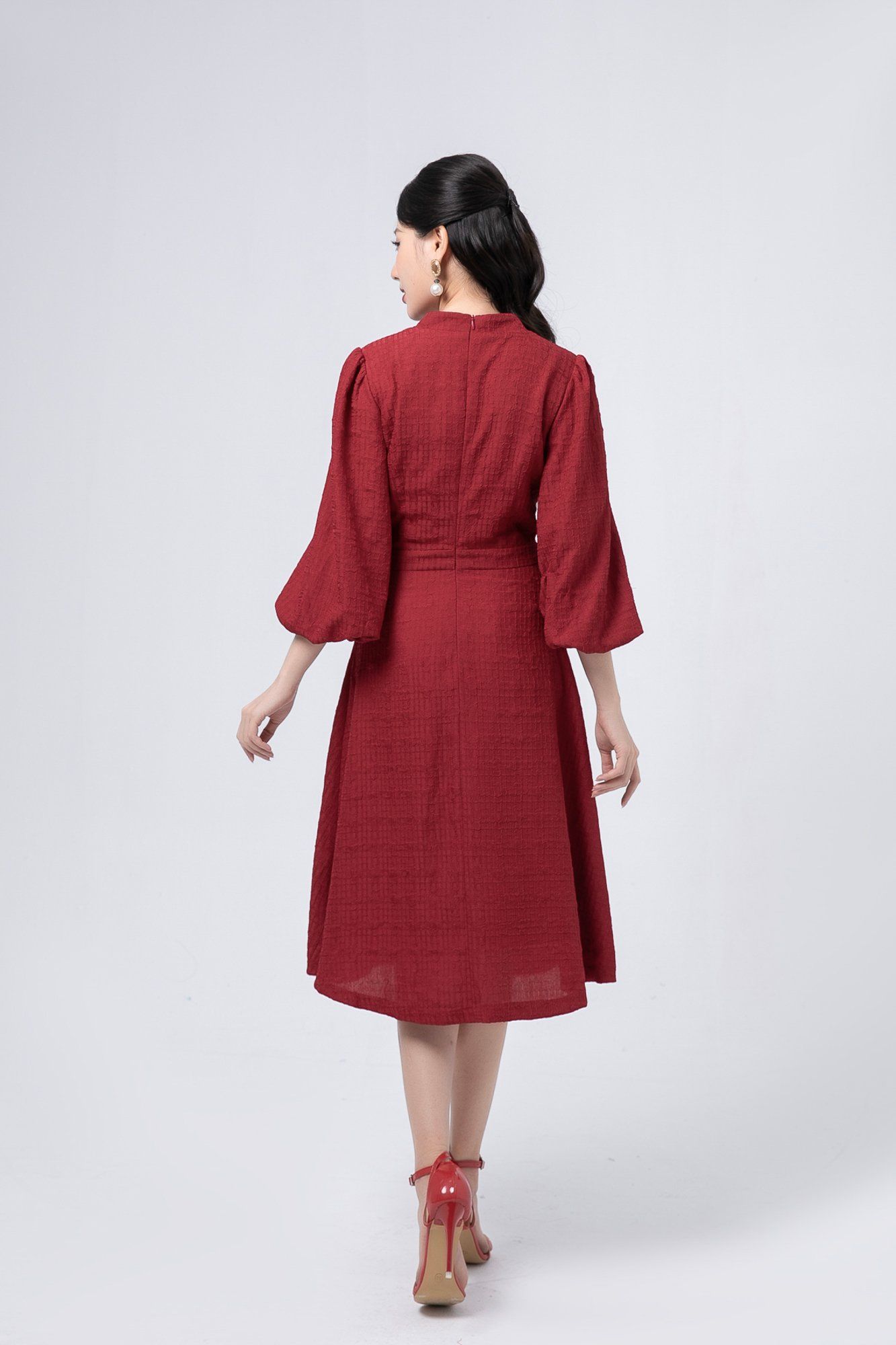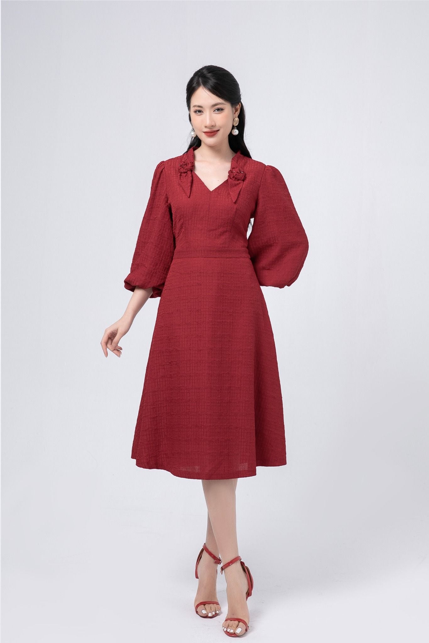 Kiểu dáng: đầm thiết kế dáng chữ A dài qua gối, tone màu đỏ kết hợp hoa đính nổi