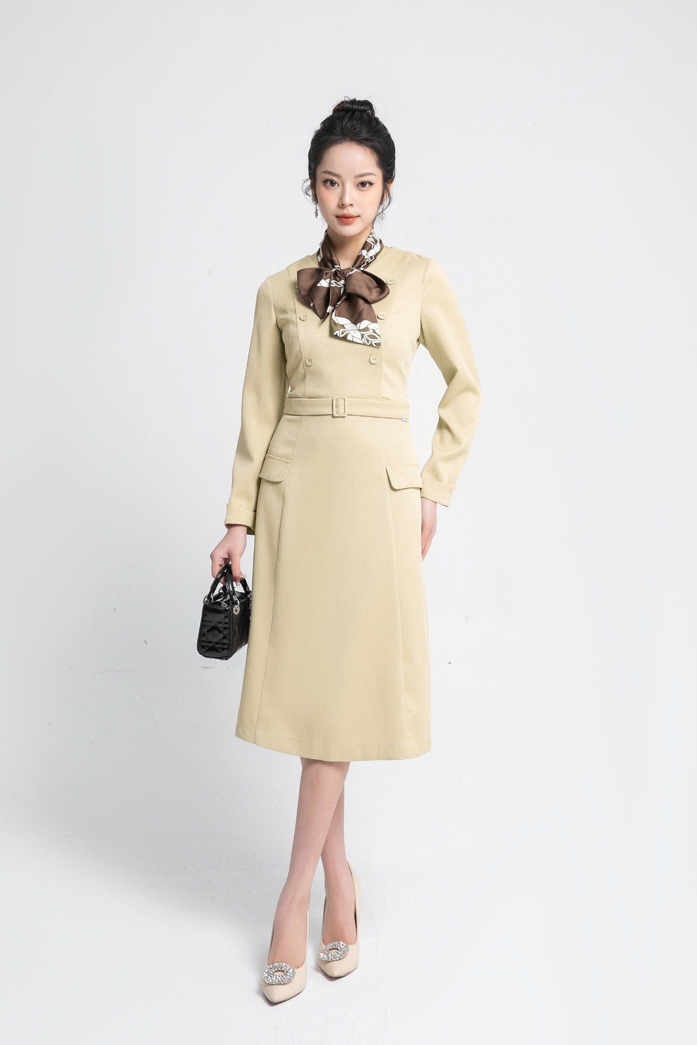 Kiểu dáng: đầm thiết kế dáng ôm dài qua gối, tone màu nâu be, kèm khăn