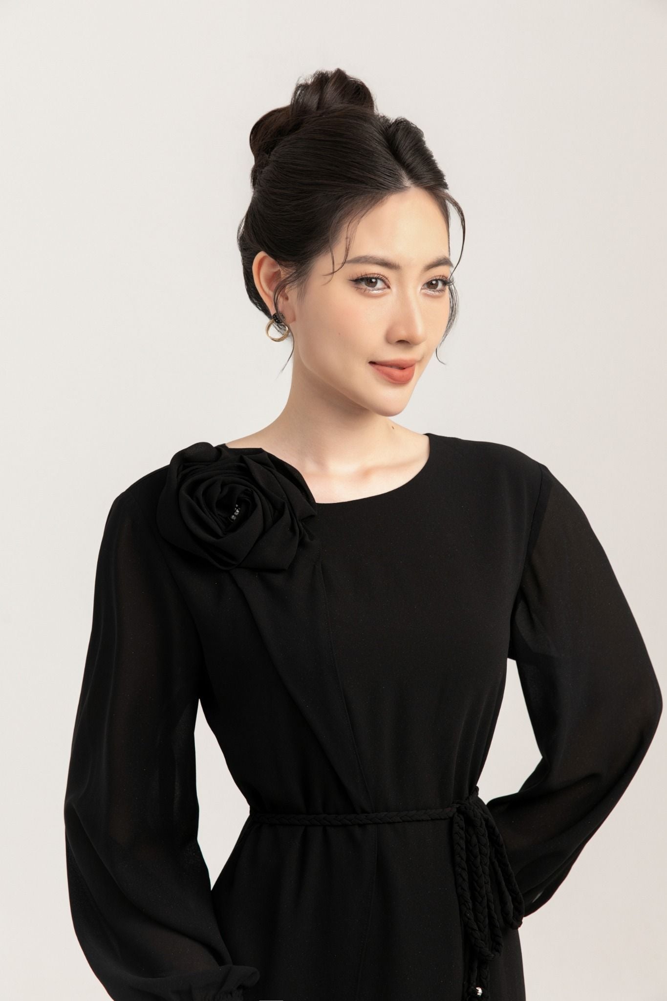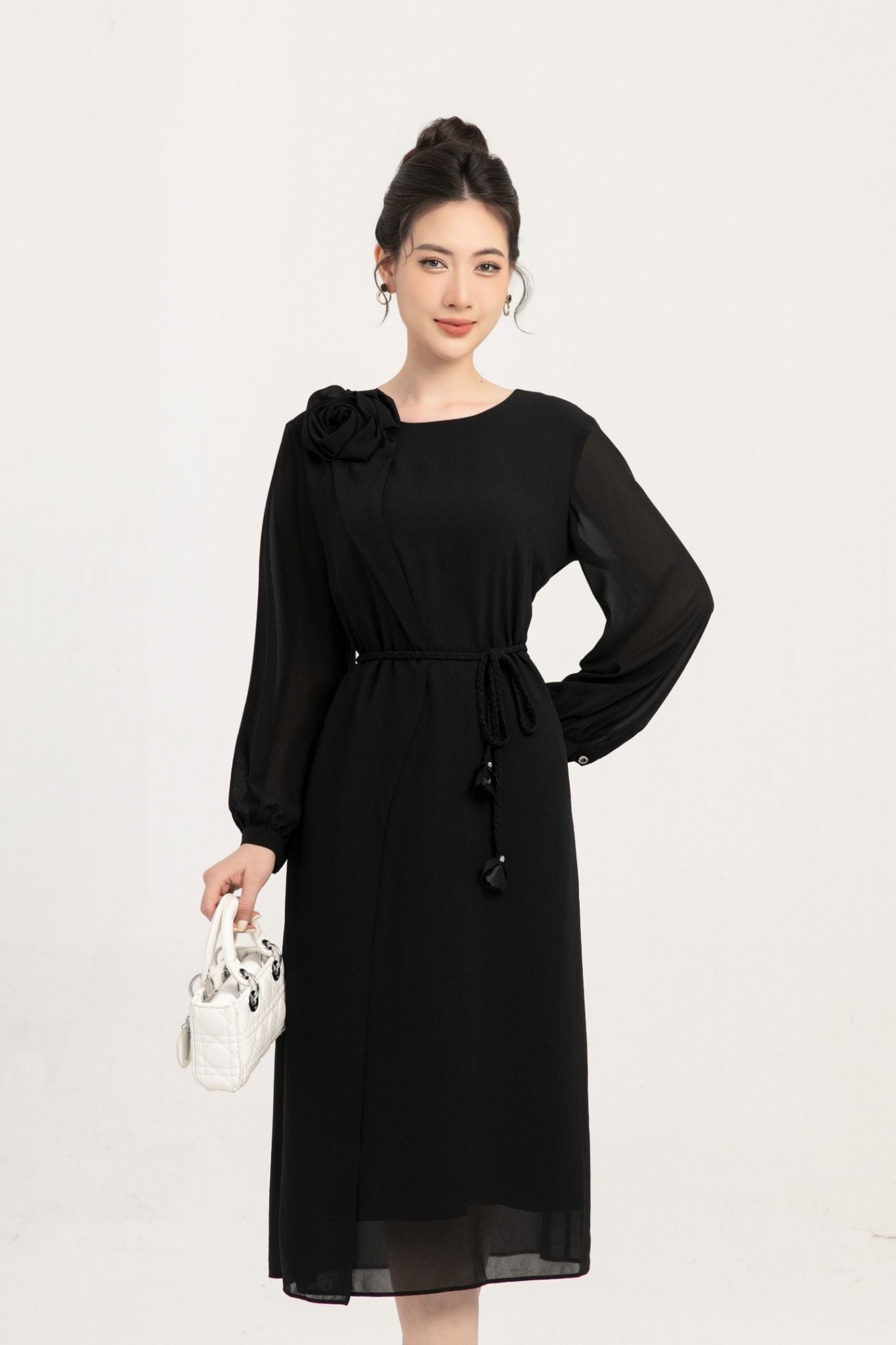 Kiểu dáng: đầm thiết kế dáng suông dài qua gối, tone màu đen phối hoa 3D đính nổi