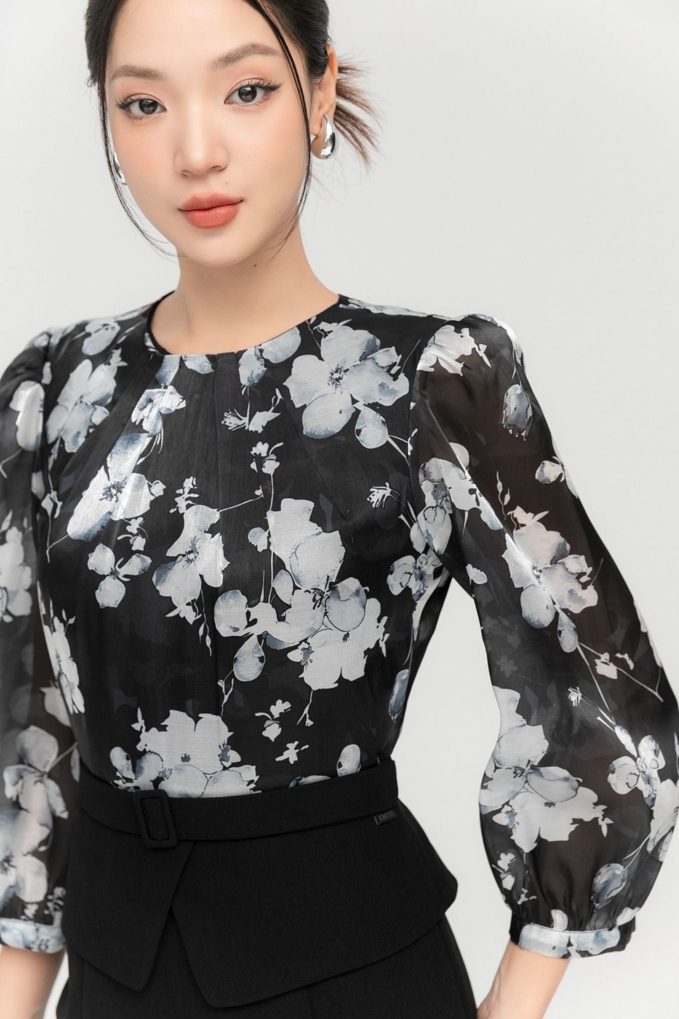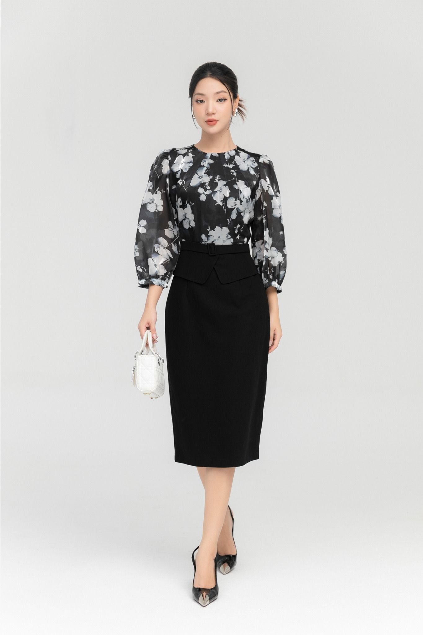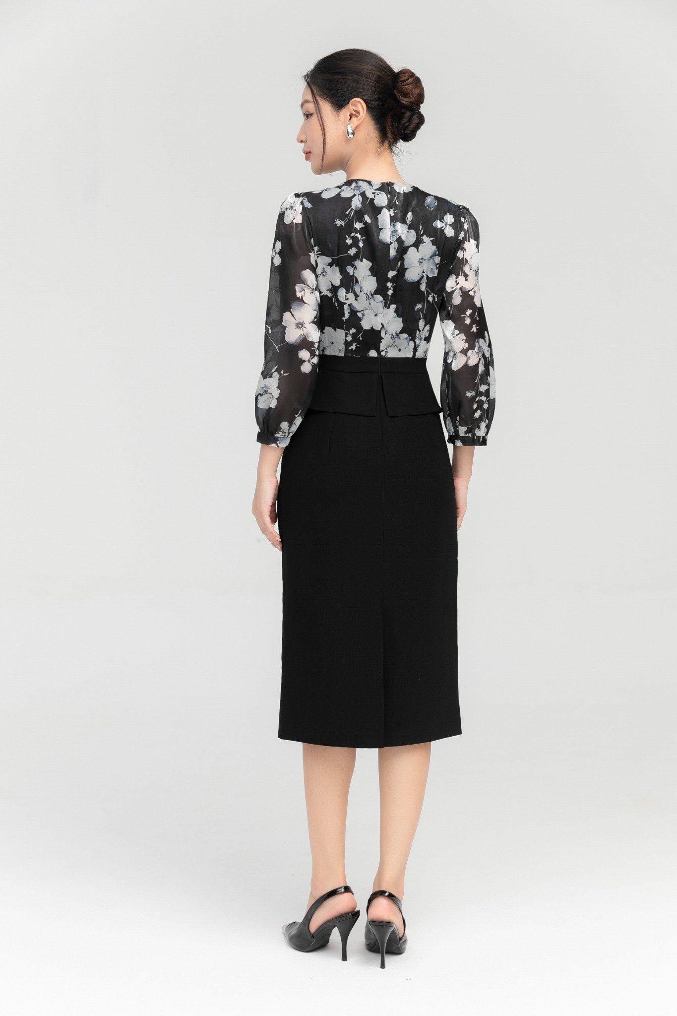 Kiểu dáng: đầm liền thiết kế dáng bút chì dài qua gối, kết hợp họa tiết hoa in