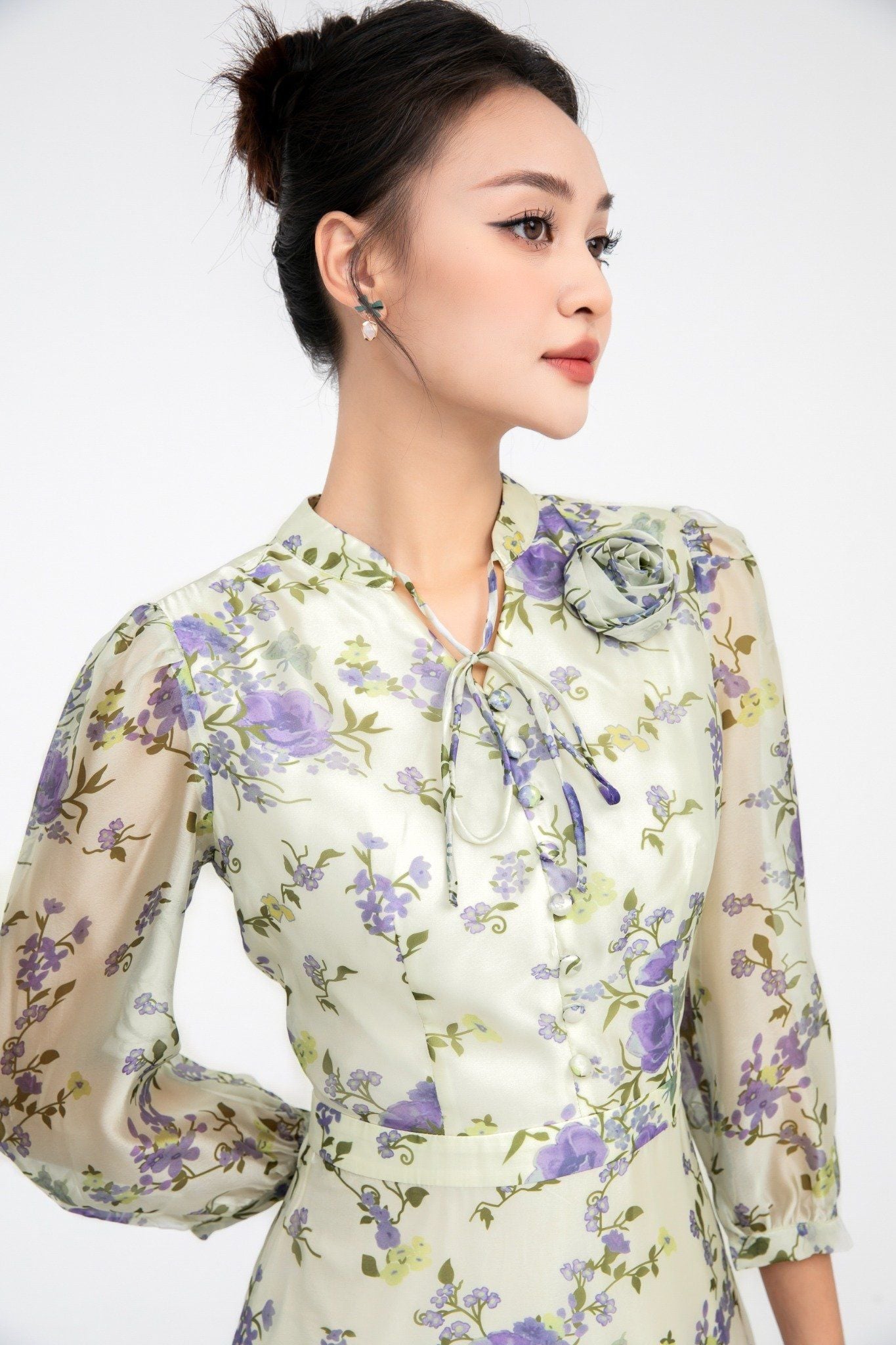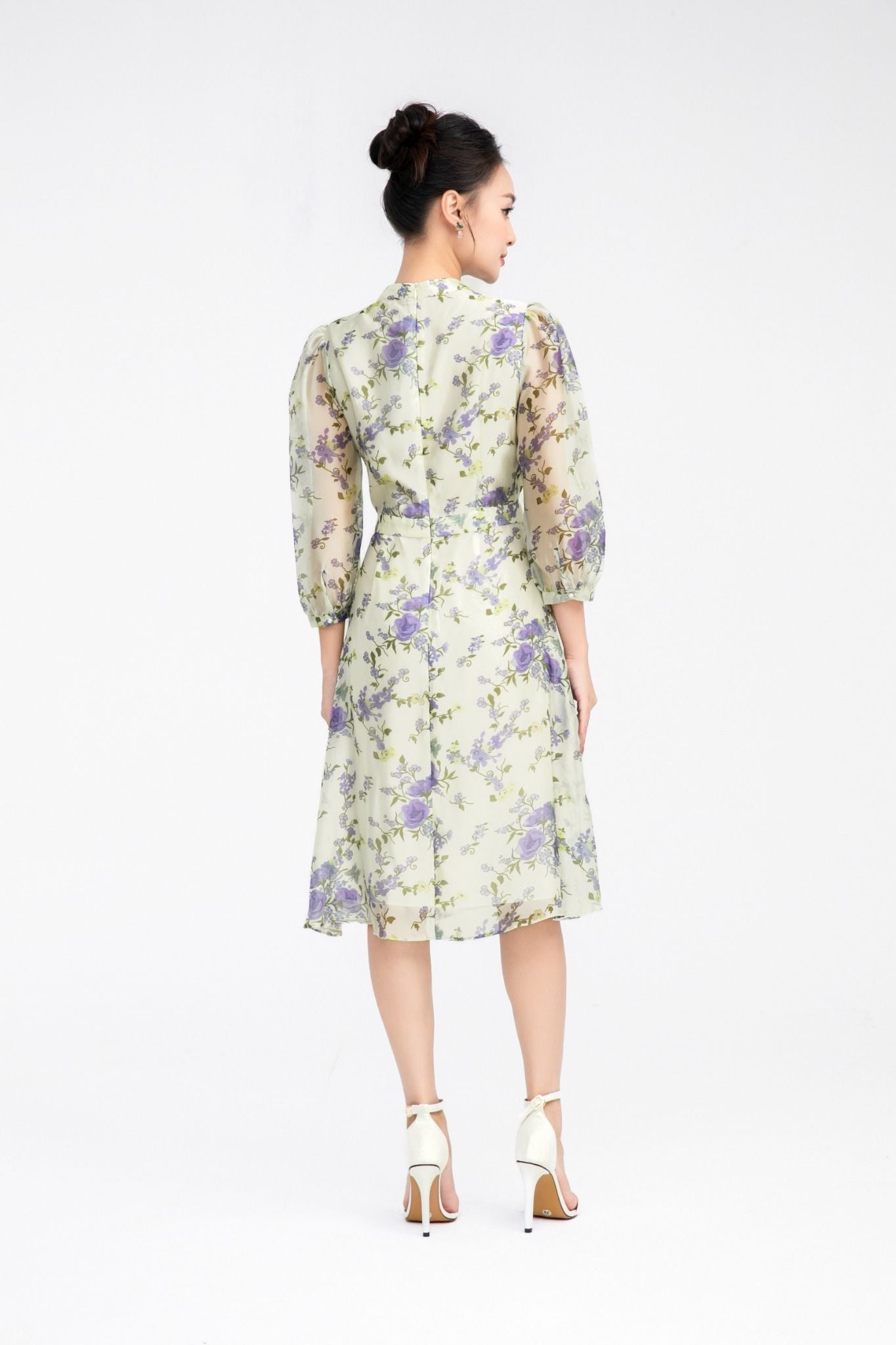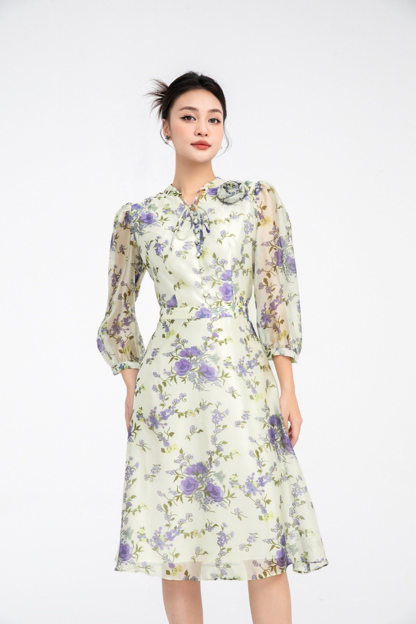 Kiểu dáng: đầm thiết kế dáng chữ A dài qua gối, kết hợp họa tiết hoa in, đính hoa 3D
