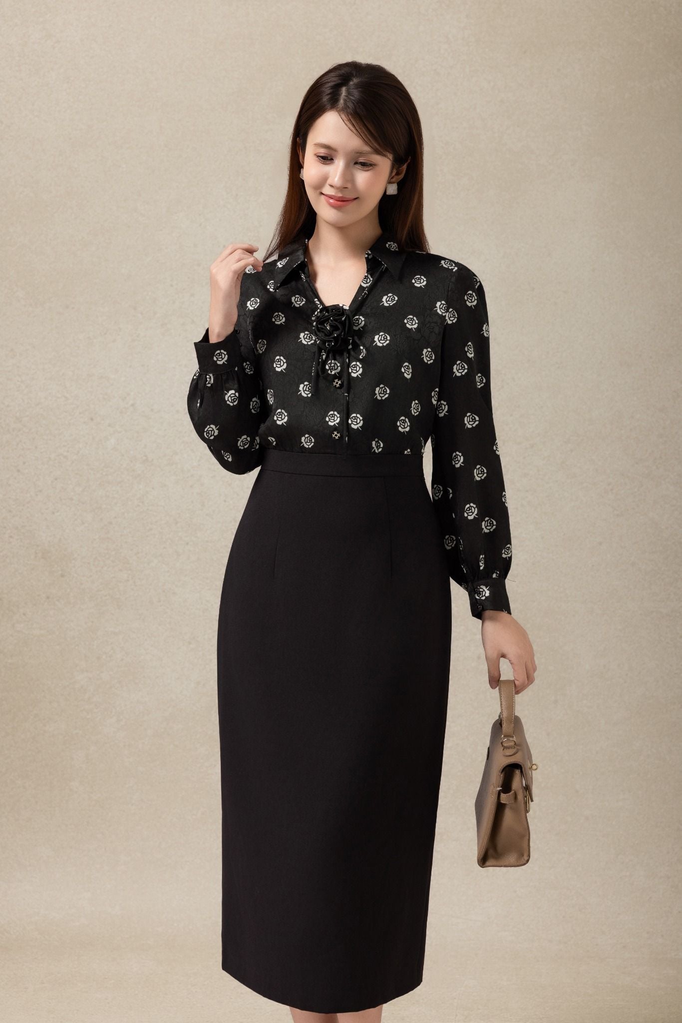 Kiểu dáng: đầm liền thiết kế dáng ôm giúp tôn dáng tối đa, độ ôm vừa phải cùng chi tiết xẻ phía sau giúp người mặc di chuyển dễ dàng và giữ được sự thoải mái, độ dài qua gối. Đầm sử dụng tone màu đen phối hoạ tiết in nổi bật