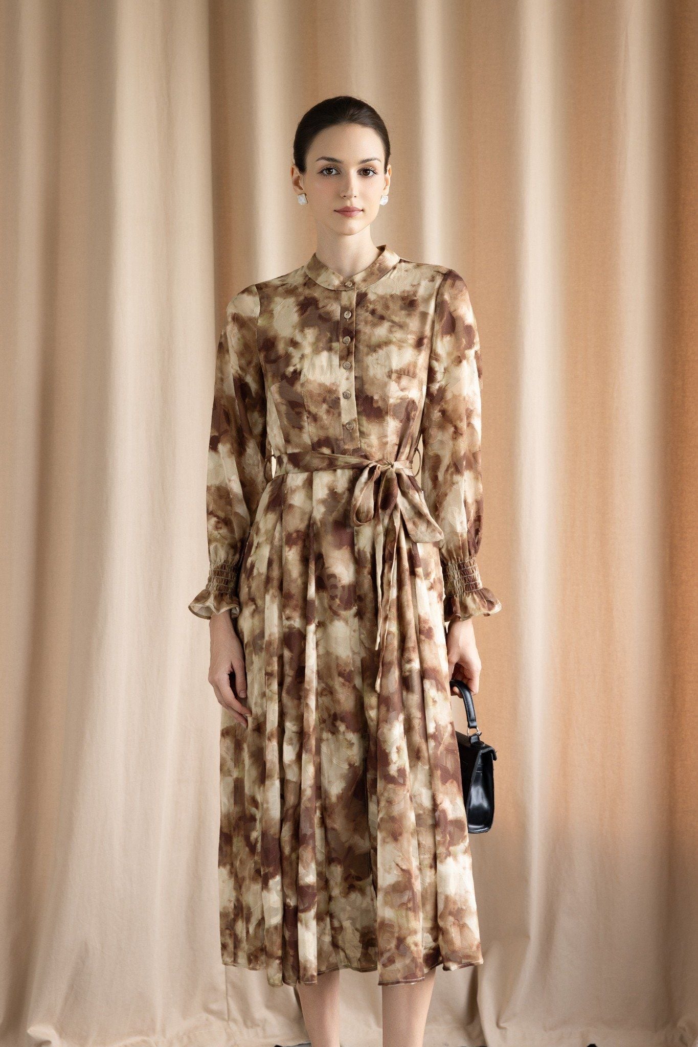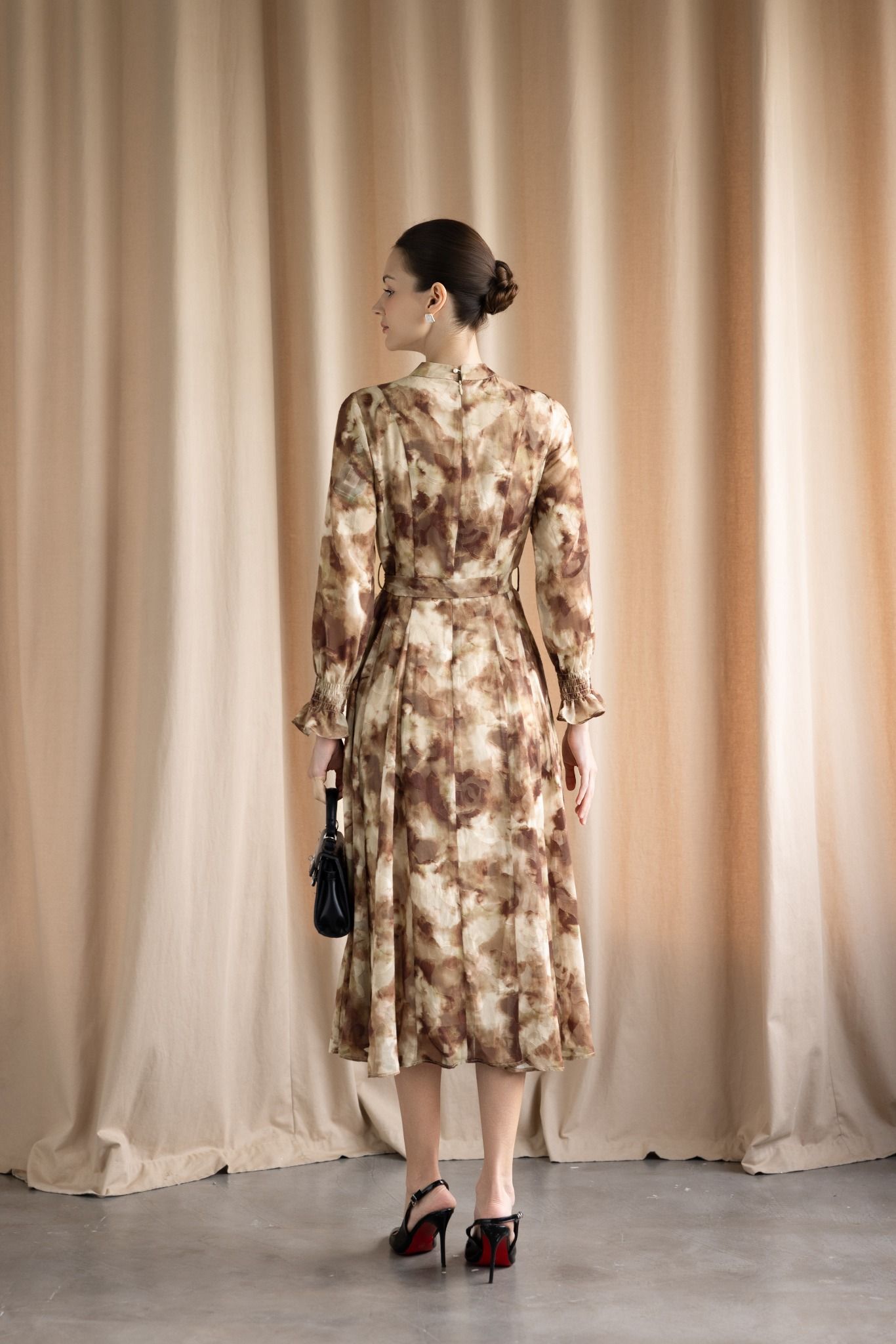 Kiểu dáng: đầm thiết kế dáng chữ A giúp che khuyết điểm cơ thể hiệu quả, độ dài qua gối, đầm sử dụng hoạ tiết loang tone màu nâu, tay bo chun cách điệu, kèm đai như hình