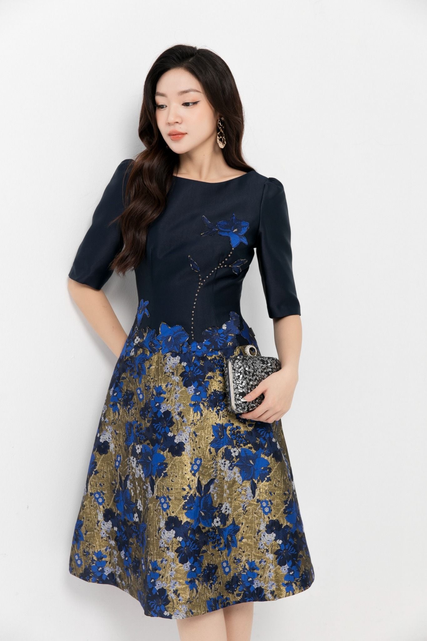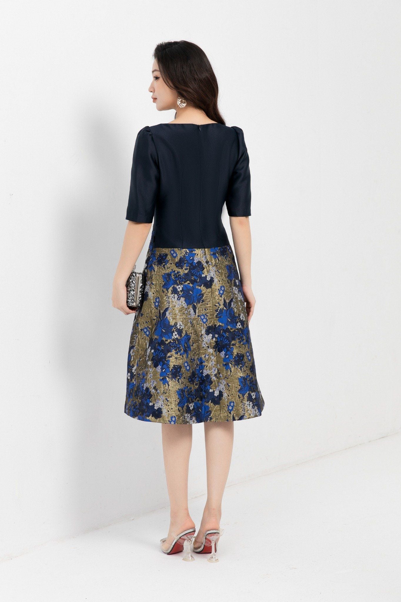 Kiểu dáng: đầm thiết kế dáng chữ A dài qua gối, tone màu xanh kết hợp họa tiết hoa