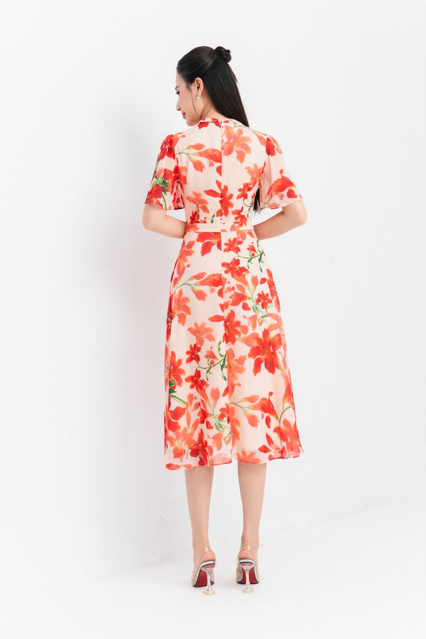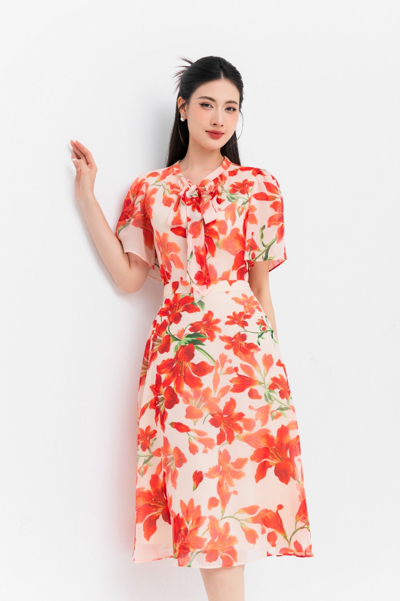 Kiểu dáng: đầm thiết kế dáng chữ A dài qua gối, kết hợp họa tiết hoa in tone màu đỏ