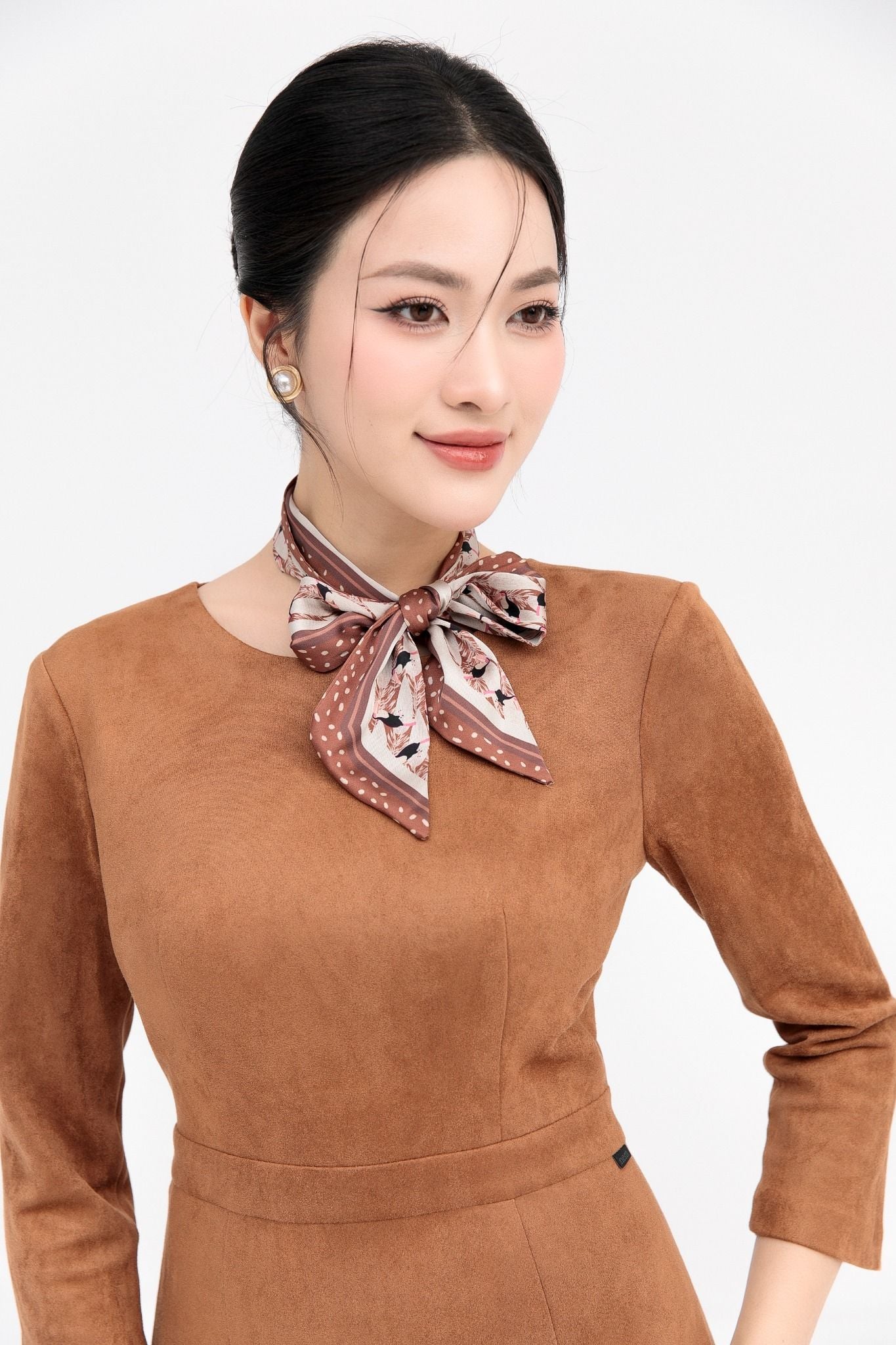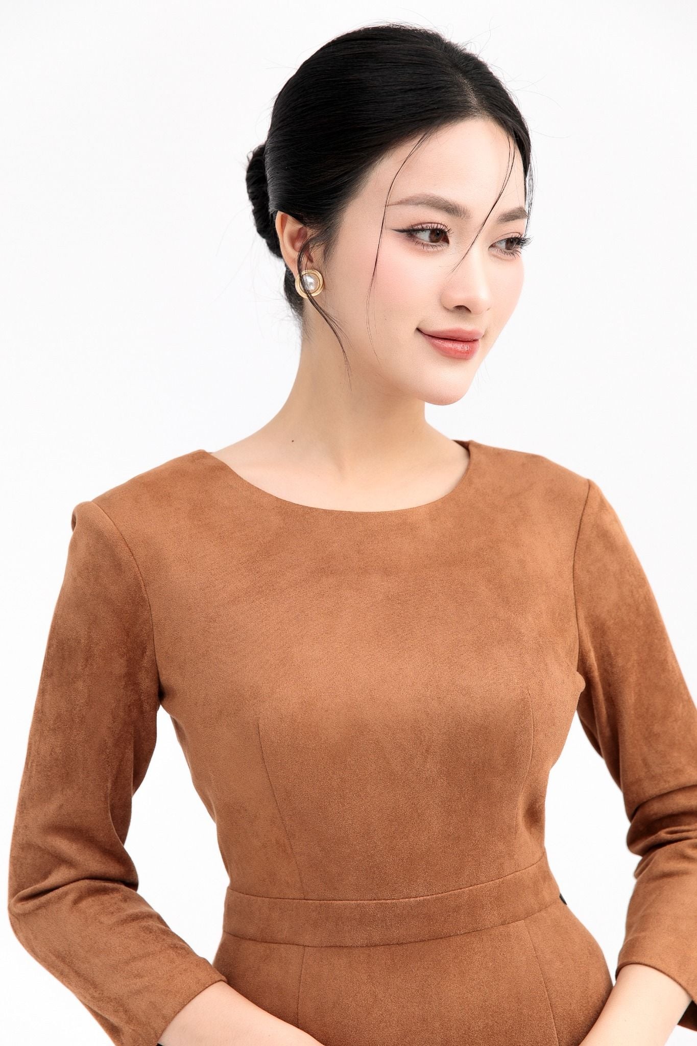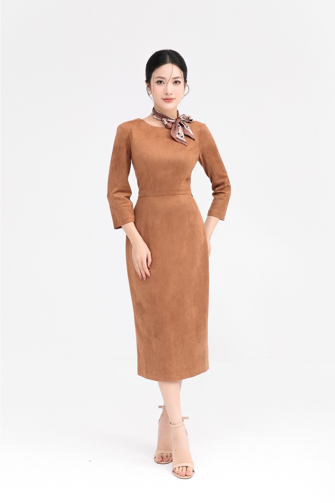 Kiểu dáng: đầm thiết kế dáng bút chì, tone màu nâu phối nơ như hình