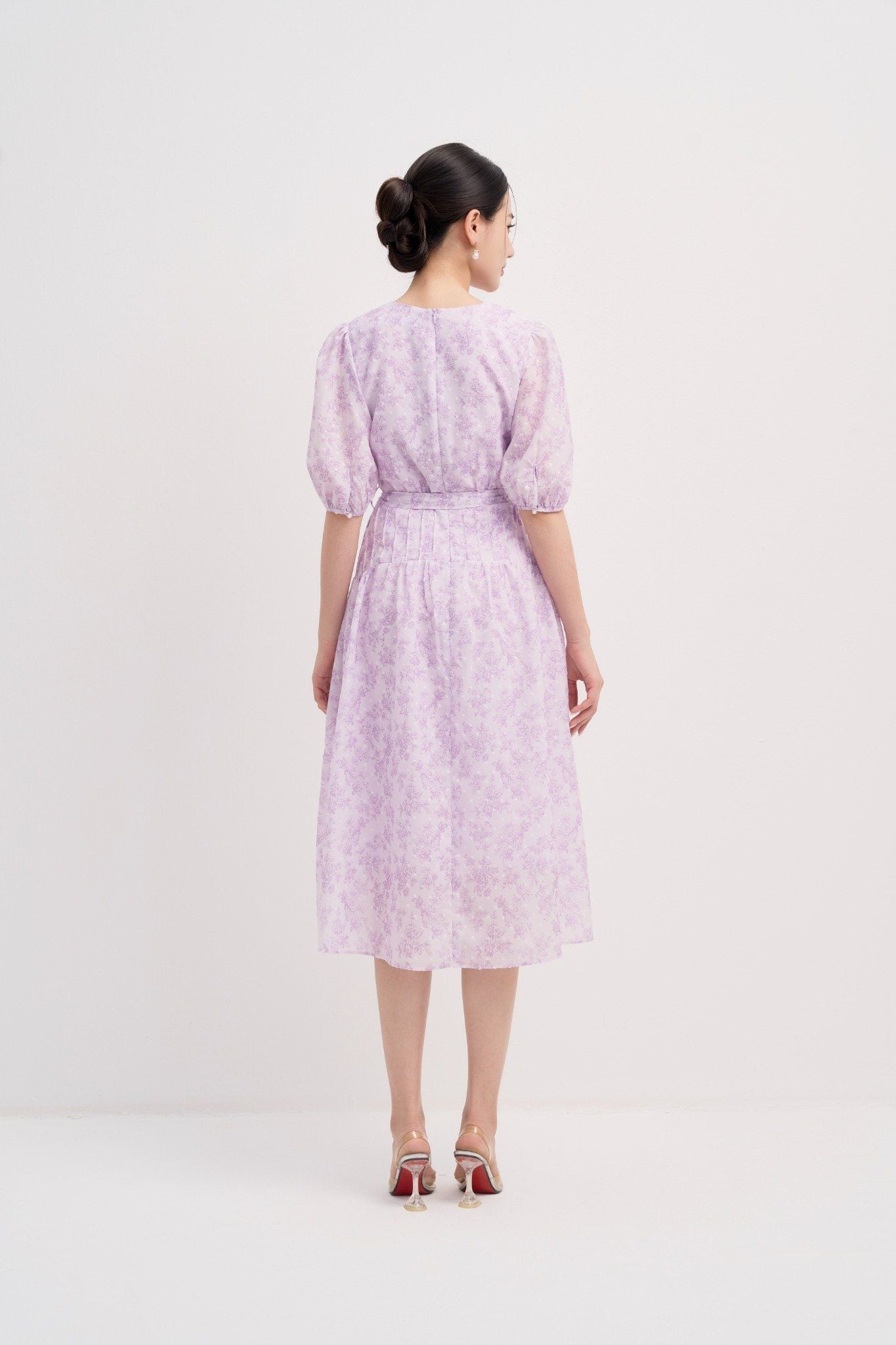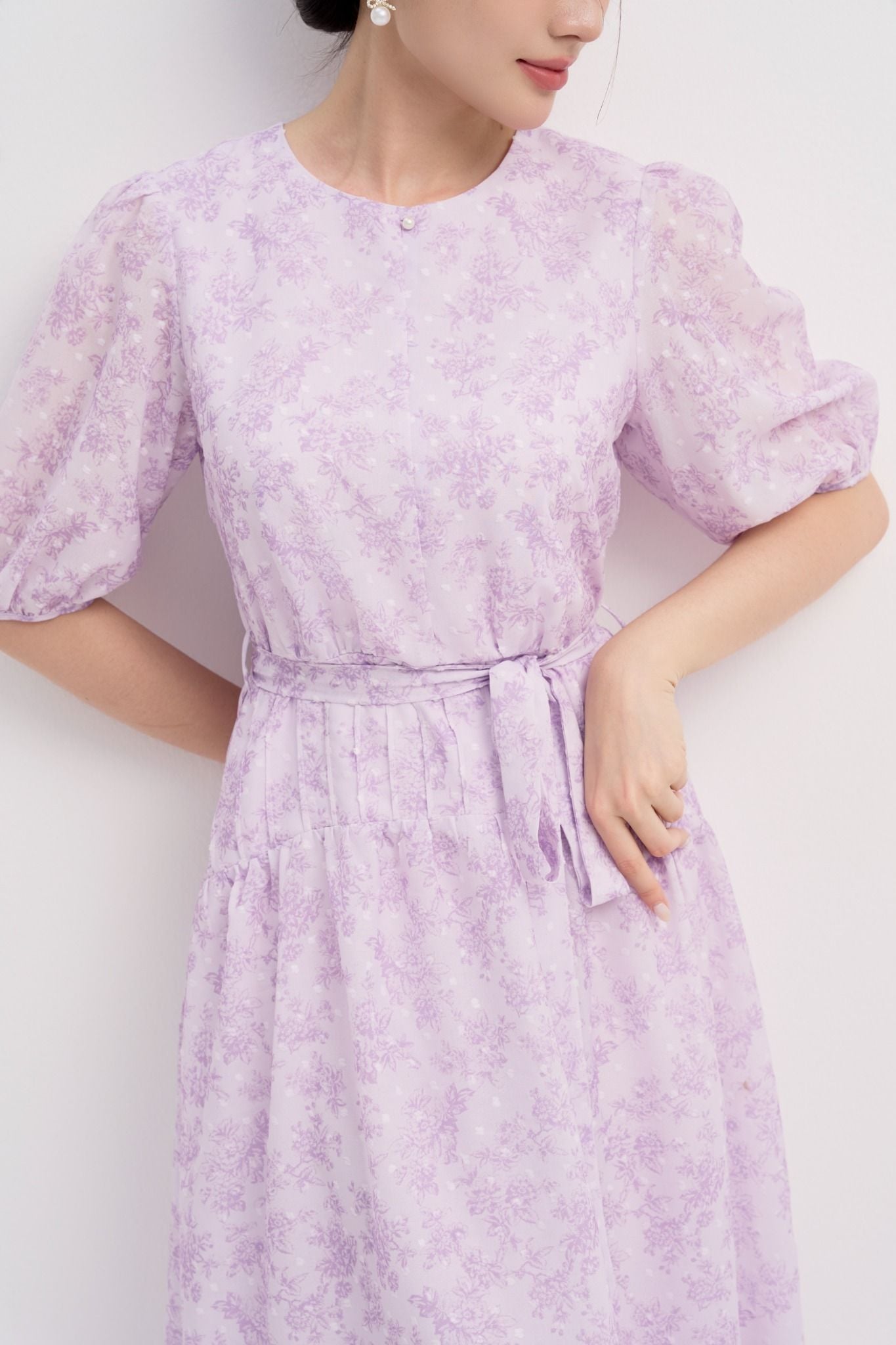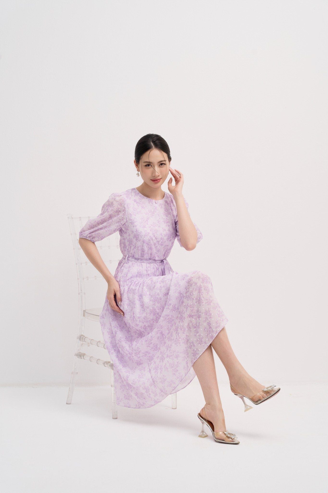 Kiểu dáng: đầm thiết kế dáng chữ A dài qua gối, tay bồng, kết hợp họa tiết hoa tone màu tím nhạt, eo phối dây thắt nơ