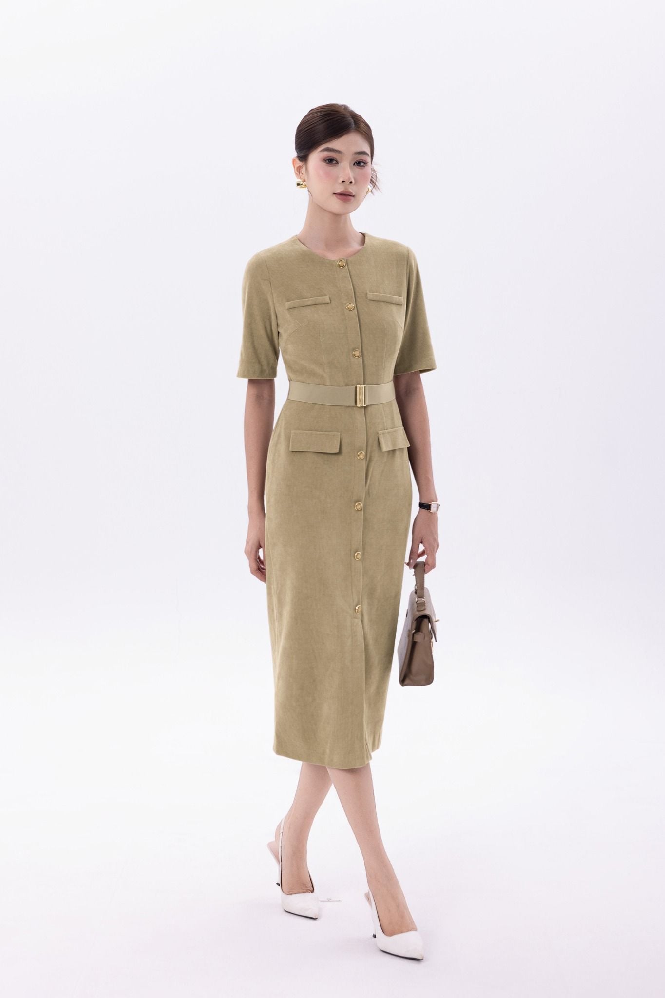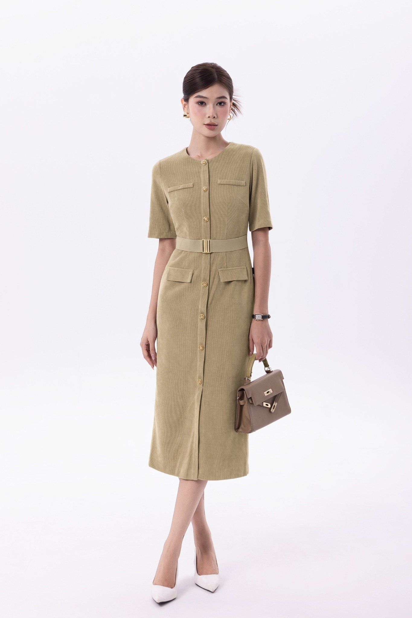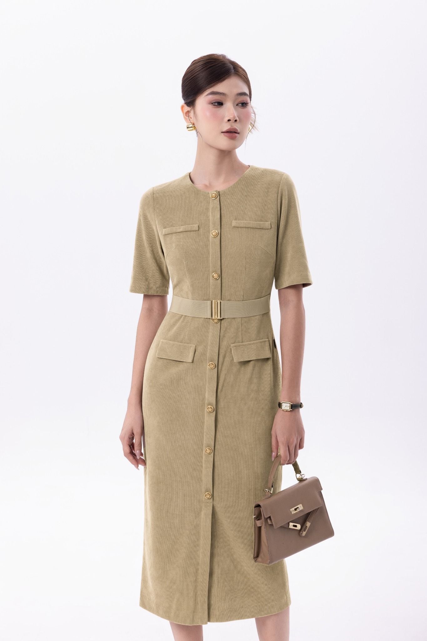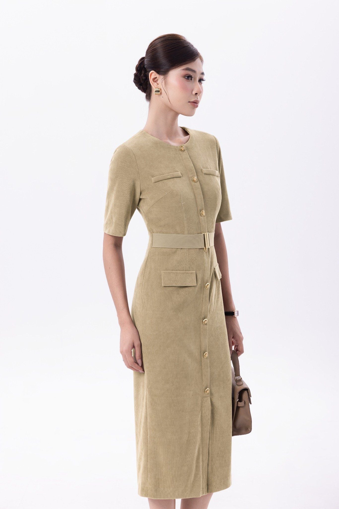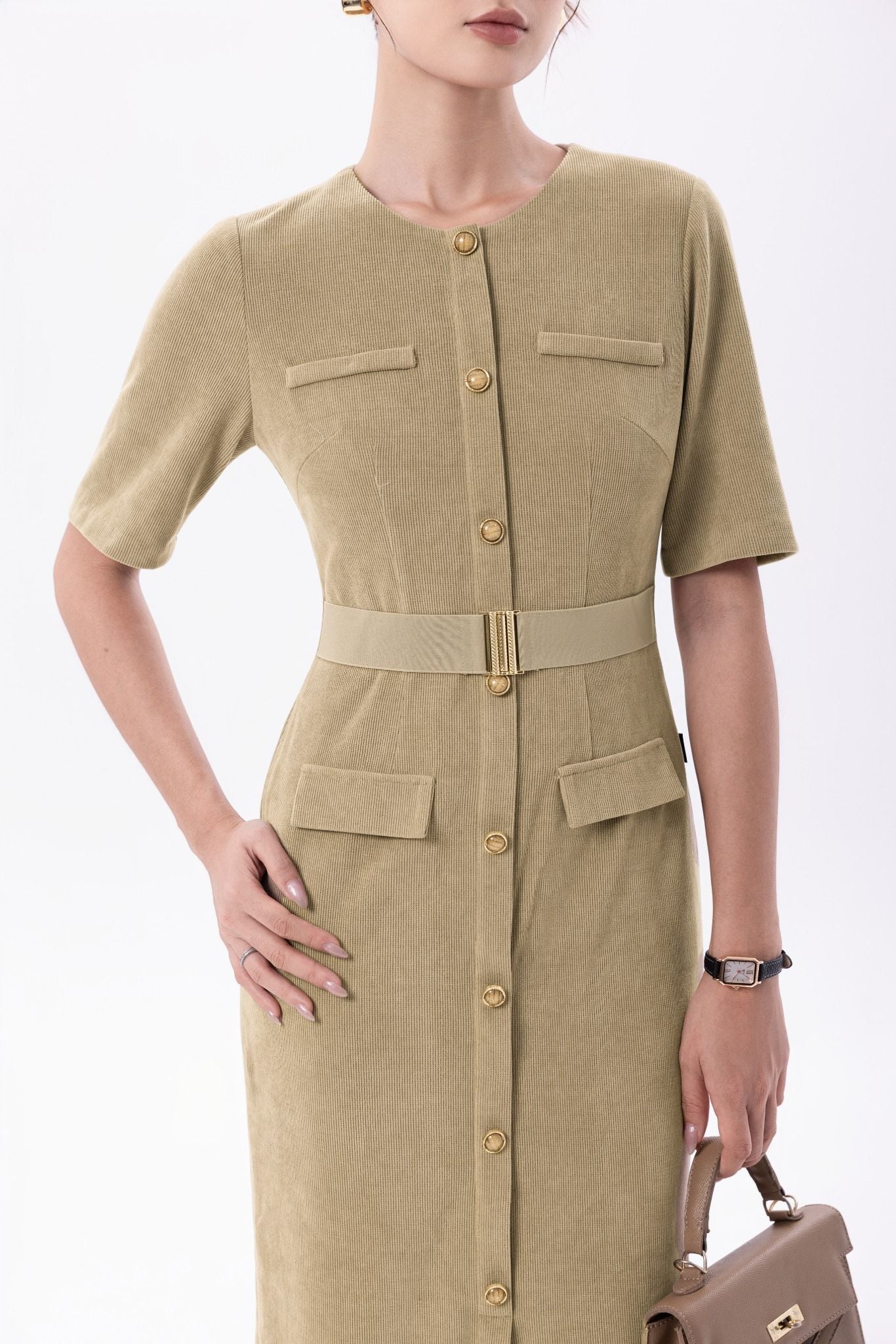 Kiểu dáng: đầm thiết kế dáng ôm giúp tôn dáng tối đa, độ ôm vừa phải cùng chi tiết xẻ phía sau giúp người mặc di chuyển dễ dàng và giữ được sự thoải mái, độ dài qua gối. Đầm sử dụng tone màu nâu be sang trọng kết hợp hàng khuy kim loại đính phía trước, kết hợp đai bản to may liền