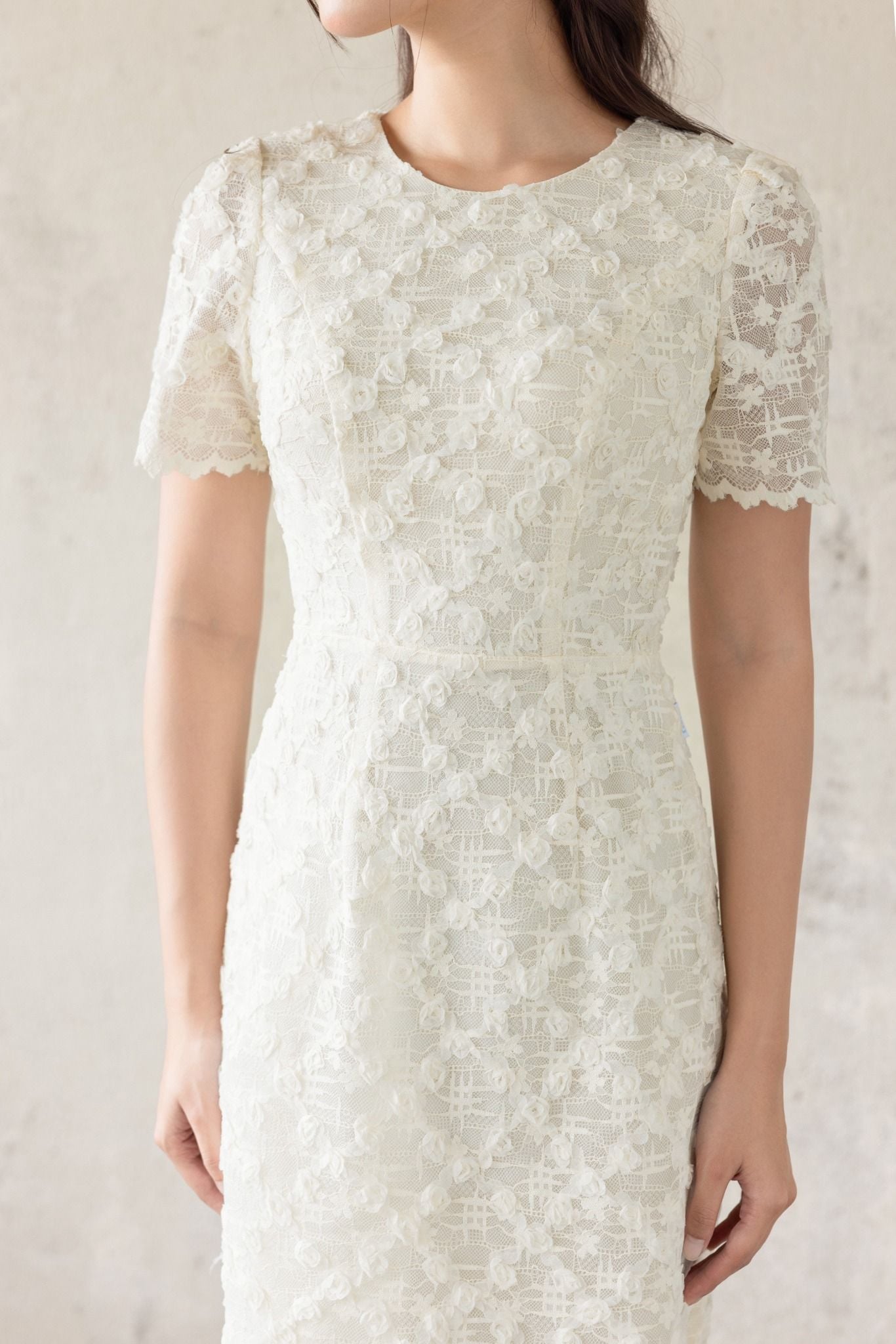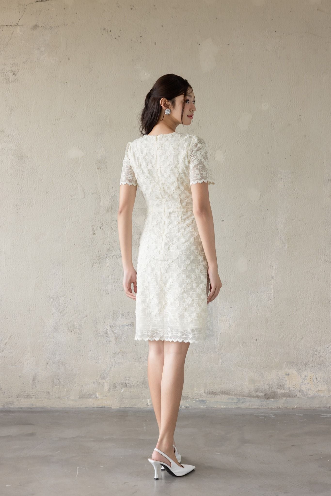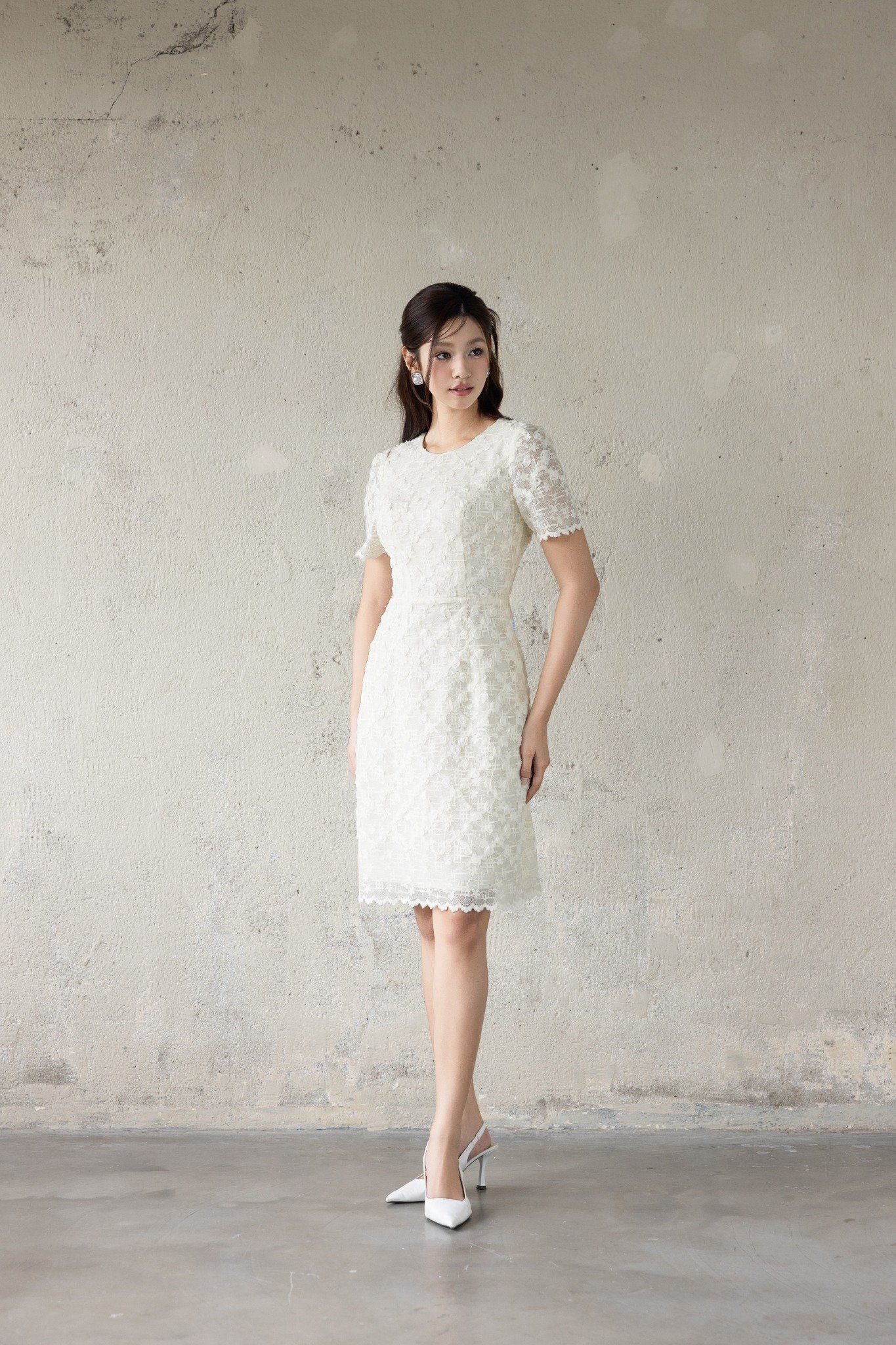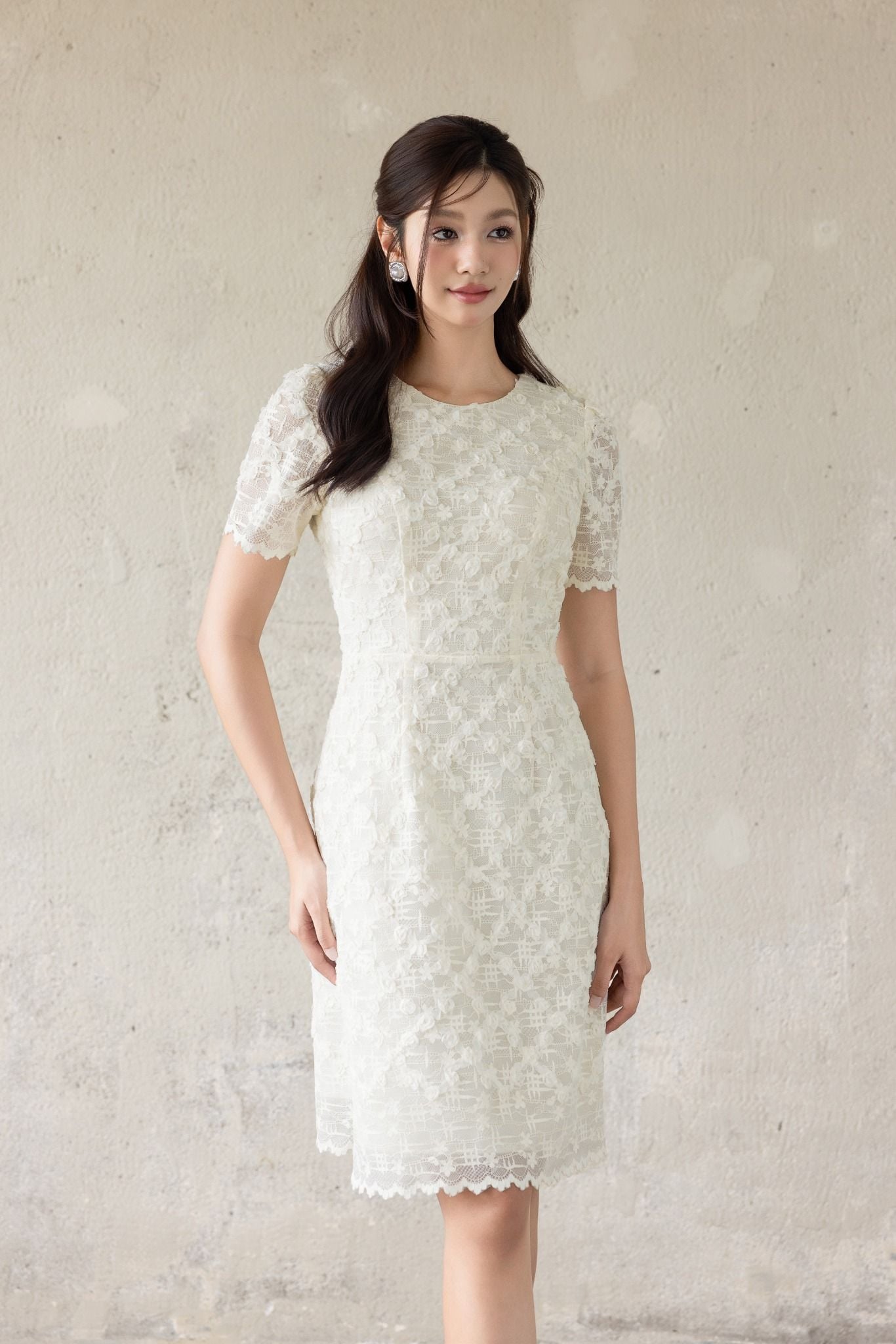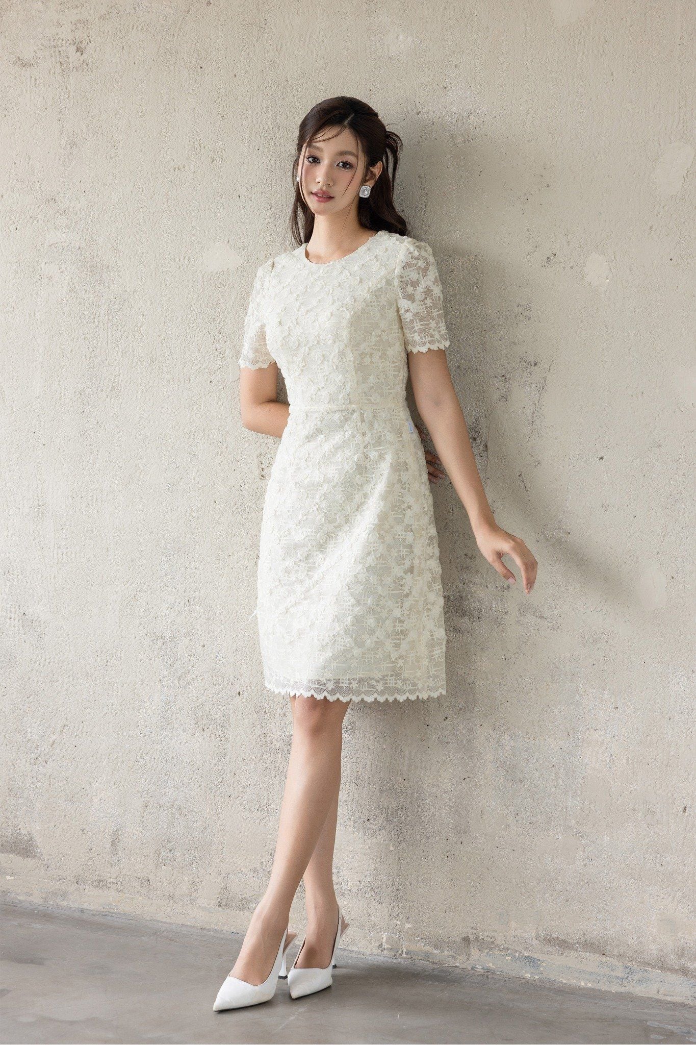 Kiểu dáng: đầm thiết kế dáng A giúp che khuyết điểm cơ thể hiệu quả, độ dài qua gối, đầm sử dụng tone màu trắng thanh lịch phối hoa đính nổi