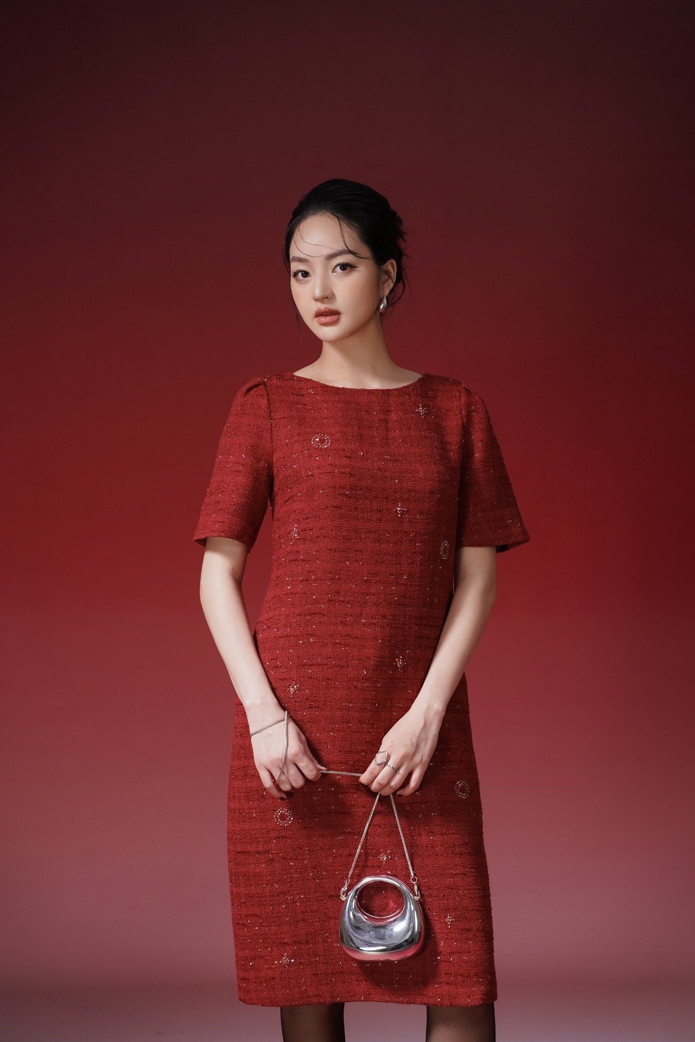 Kiểu dáng: đầm thiết kế dáng suông giúp che khuyết điểm cơ thể hiệu quả, độ dài qua gối, đầm sử dụng tone màu đỏ đính cườm sang trọng