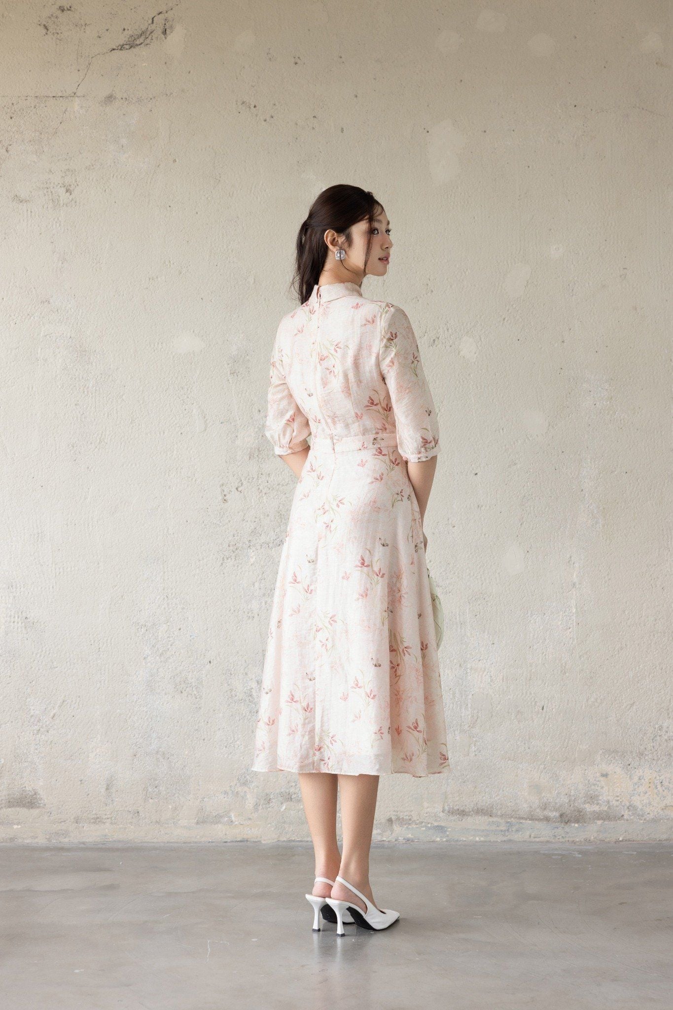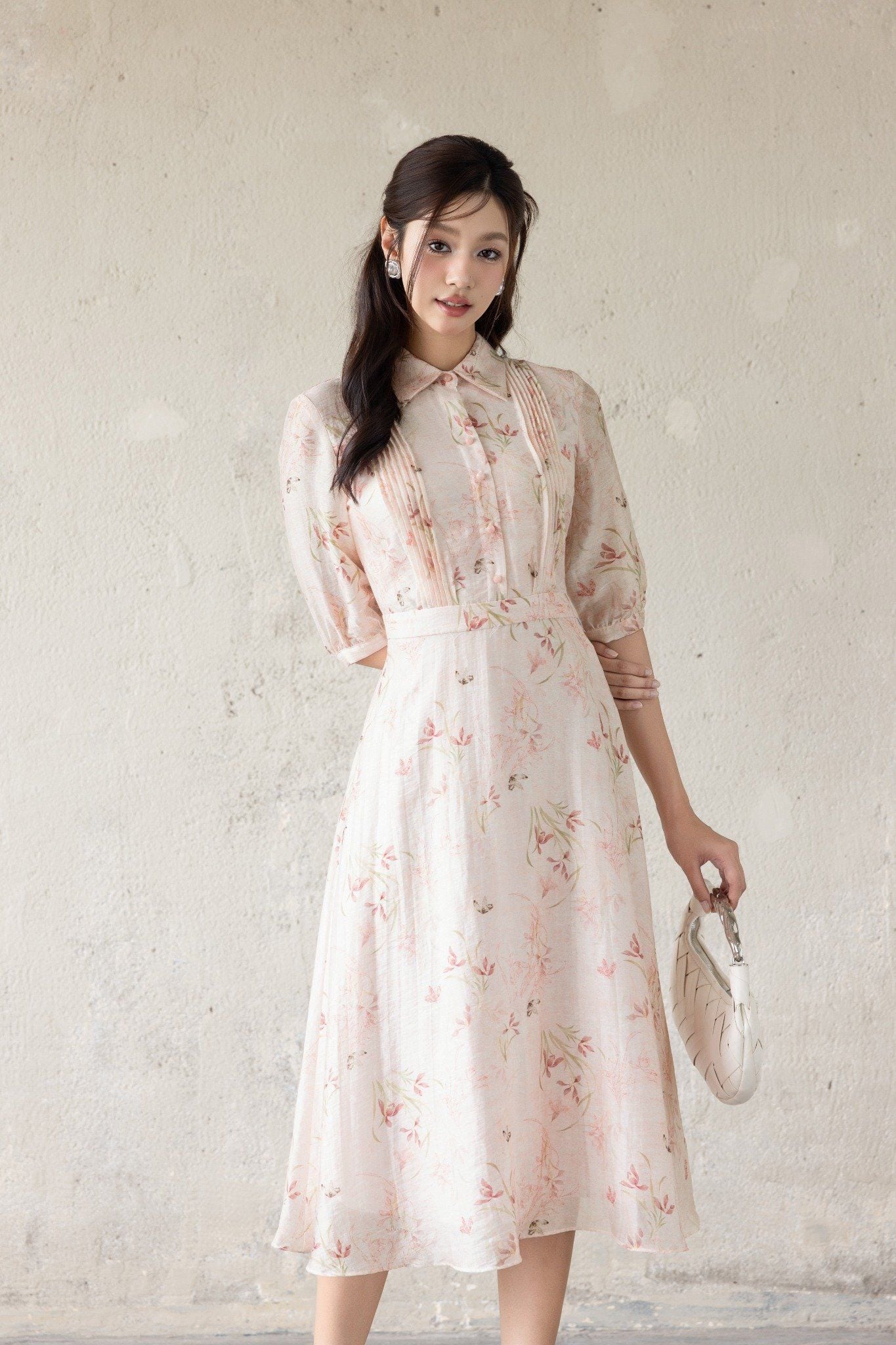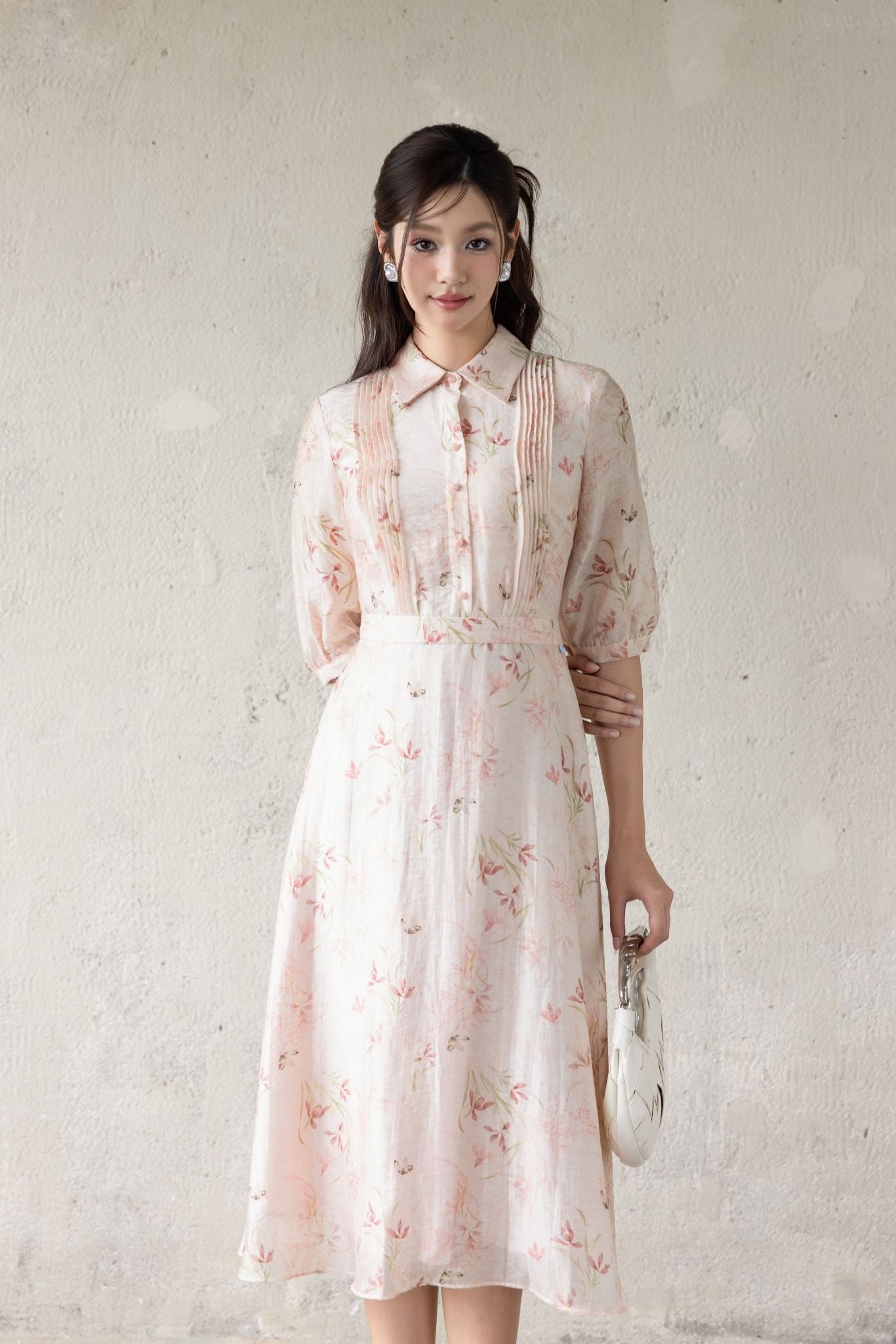 Kiểu dáng: đầm thiết kế dáng chữ A xoè nhẹ dài qua gối tạo sự thướt tha, uyển chuyển trong từng bước đi. Đầm sử dụng hoạ tiết hoa nhí cùng chi tiết nẹp thân trước trang trí tạo điểm nhấn