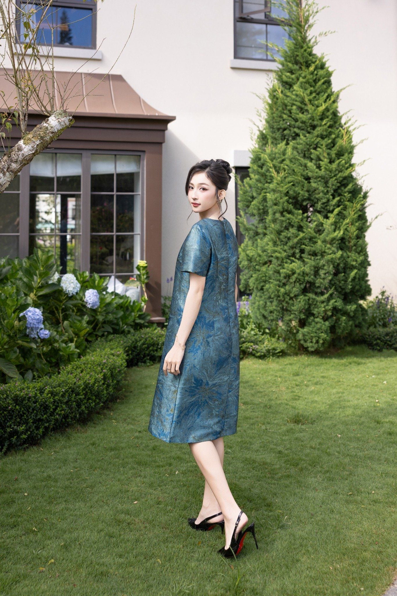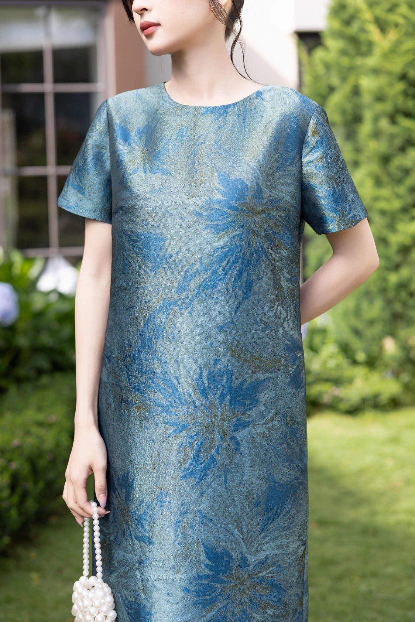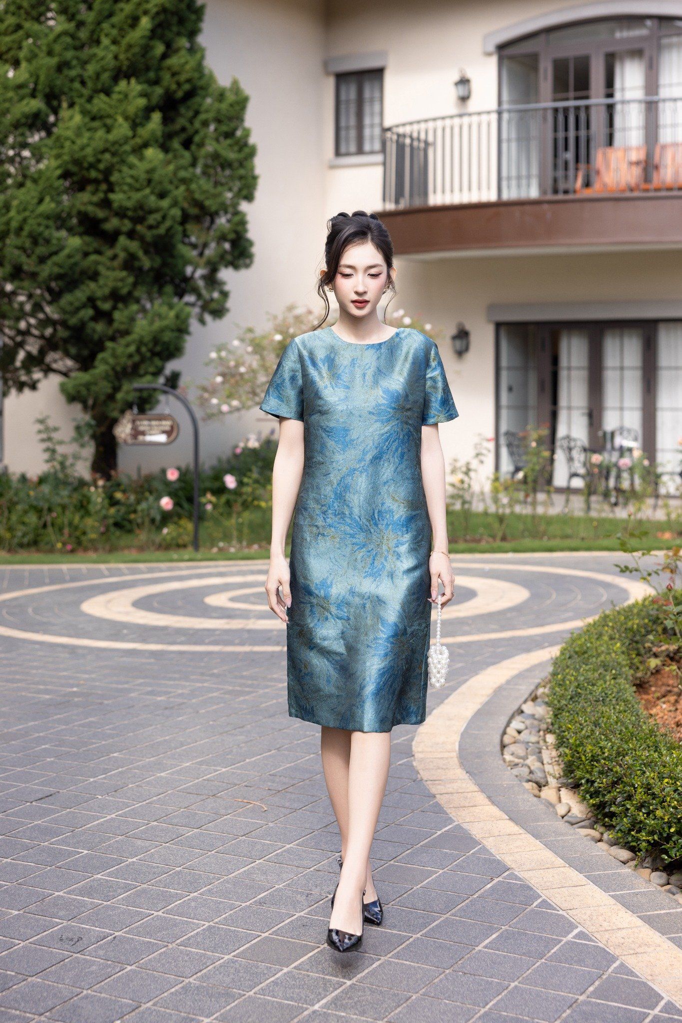 Kiểu dáng: đầm thiết kế dáng suông giúp che khuyết điểm cơ thể hiệu quả, độ dài qua gối, đầm sử dụng tone màu xanh kết hợp hoạ tiết hoa sang trọng