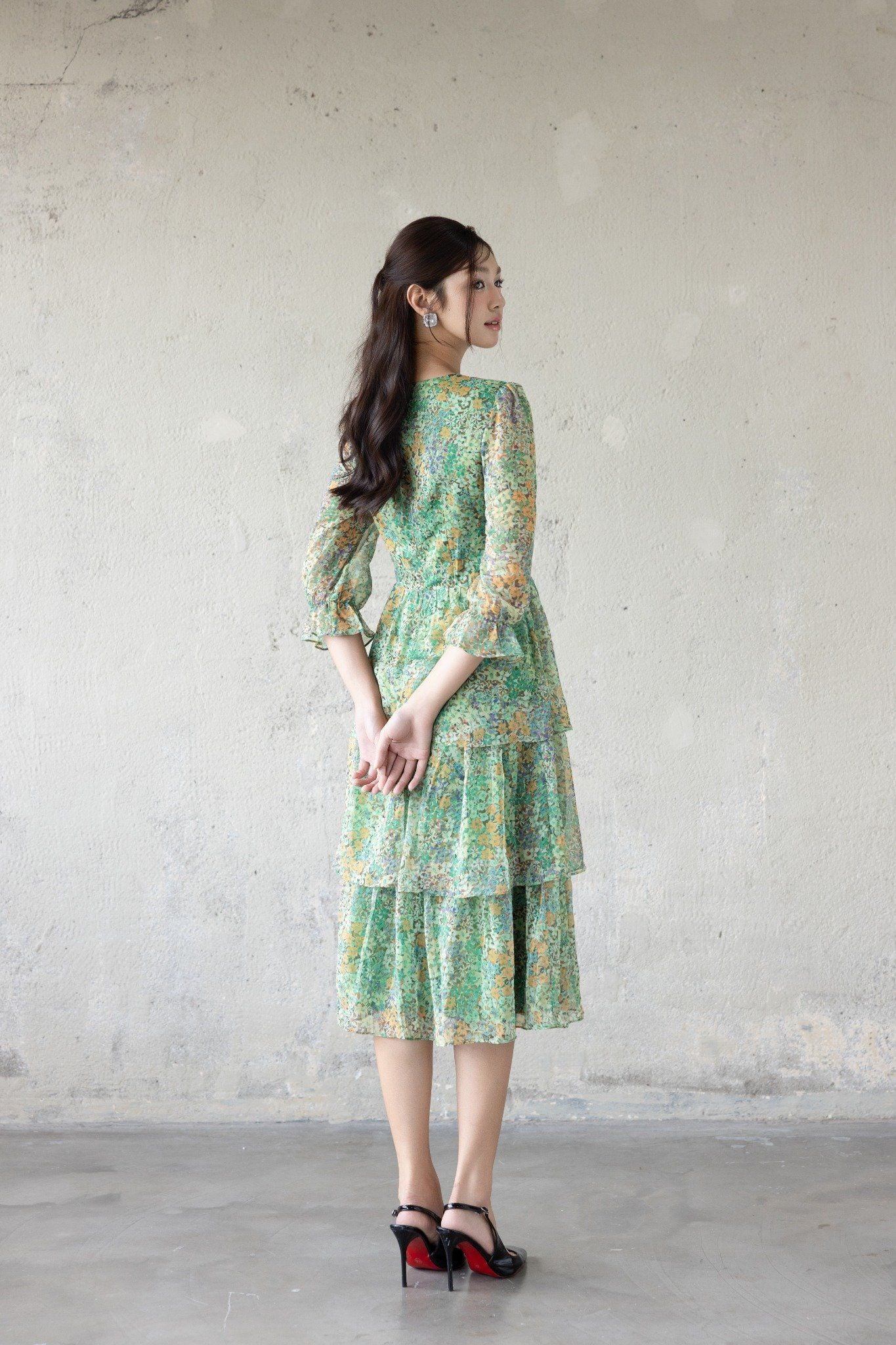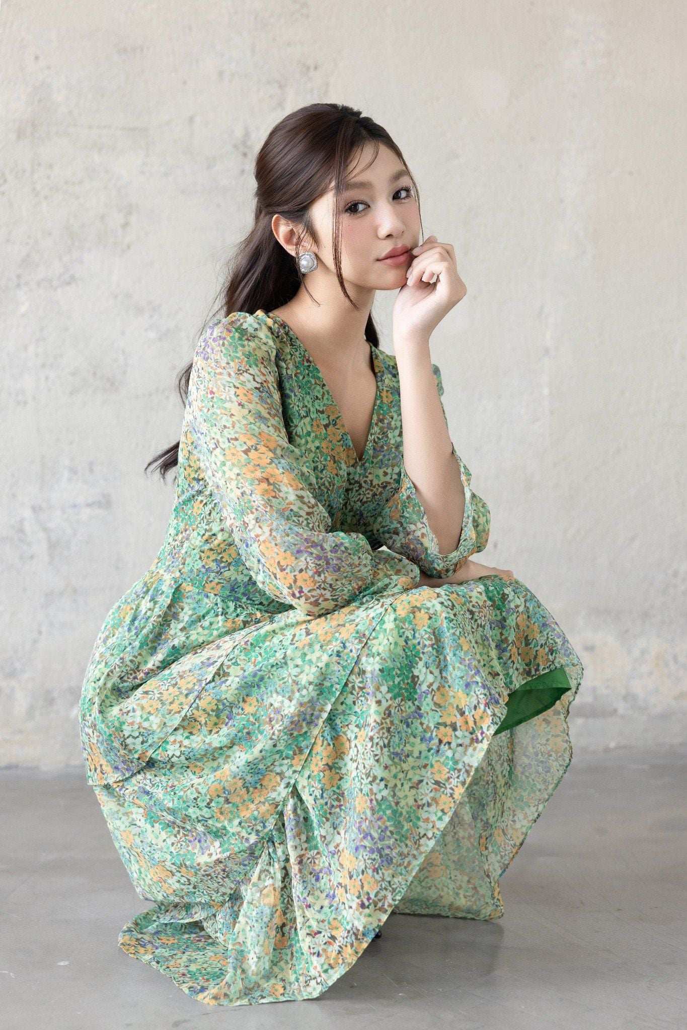 Kiểu dáng: đầm thiết kế dáng chữ A xoè nhẹ dài qua gối tạo sự thướt tha, uyển chuyển trong từng bước đi. Đầm sử dụng hoạ tiết hoa nhí in nổi bật, có thể mặc đi dạo phố hay tới công sở