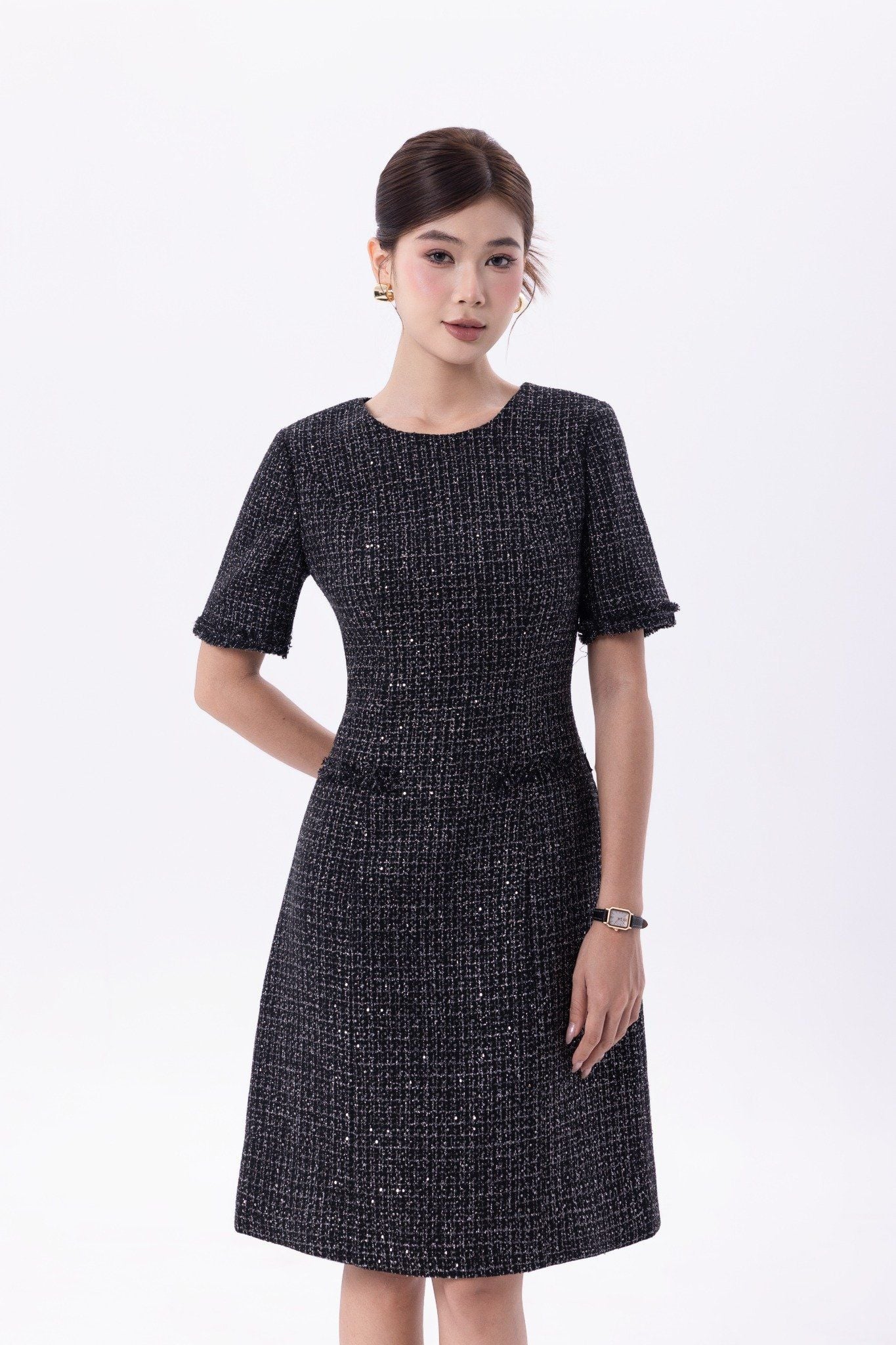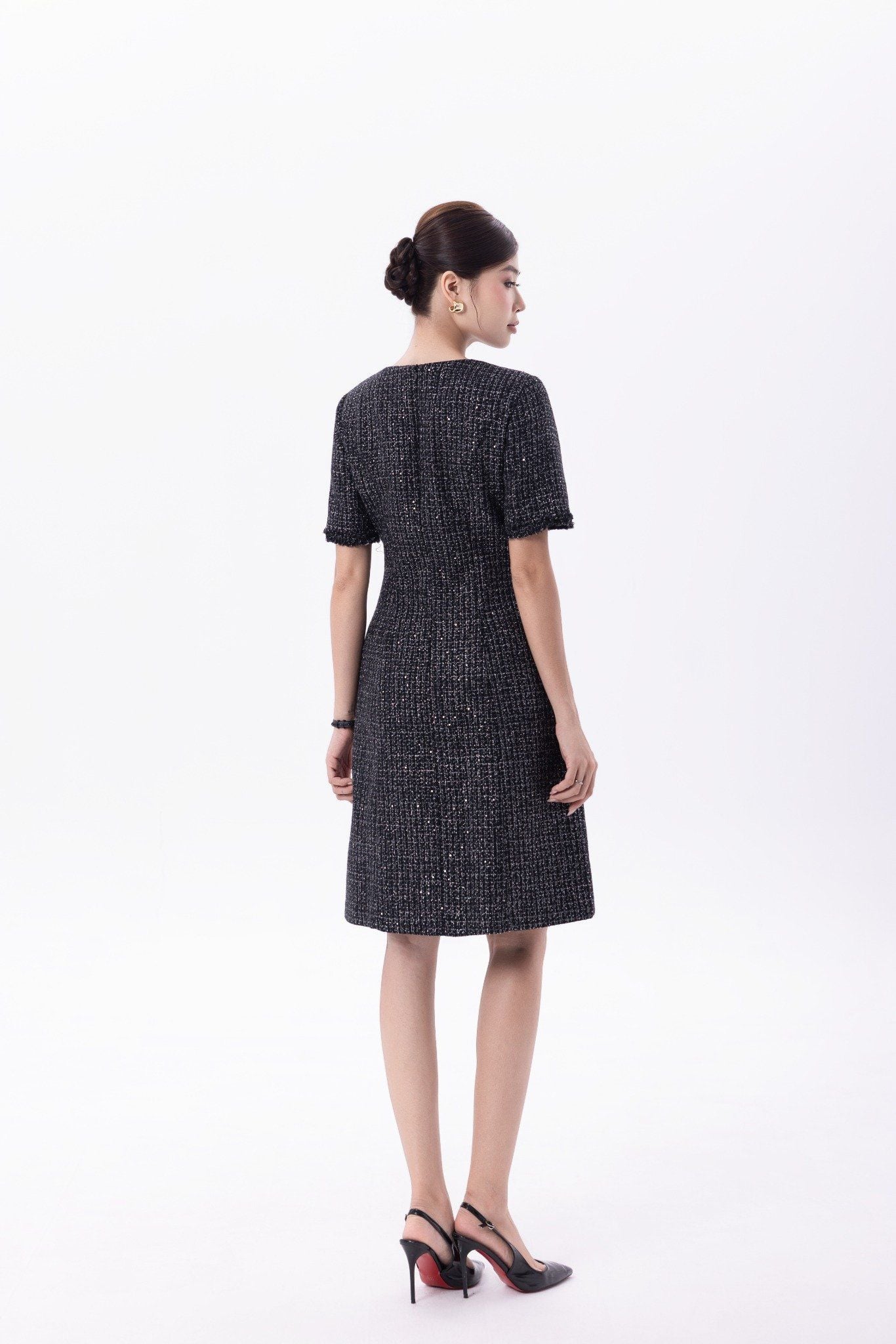 Kiểu dáng: đầm thiết kế dáng suông giúp che khuyết điểm cơ thể hiệu quả, độ dài qua gối, đầm sử dụng tone đen pha phối kim tuyến sang trọng
