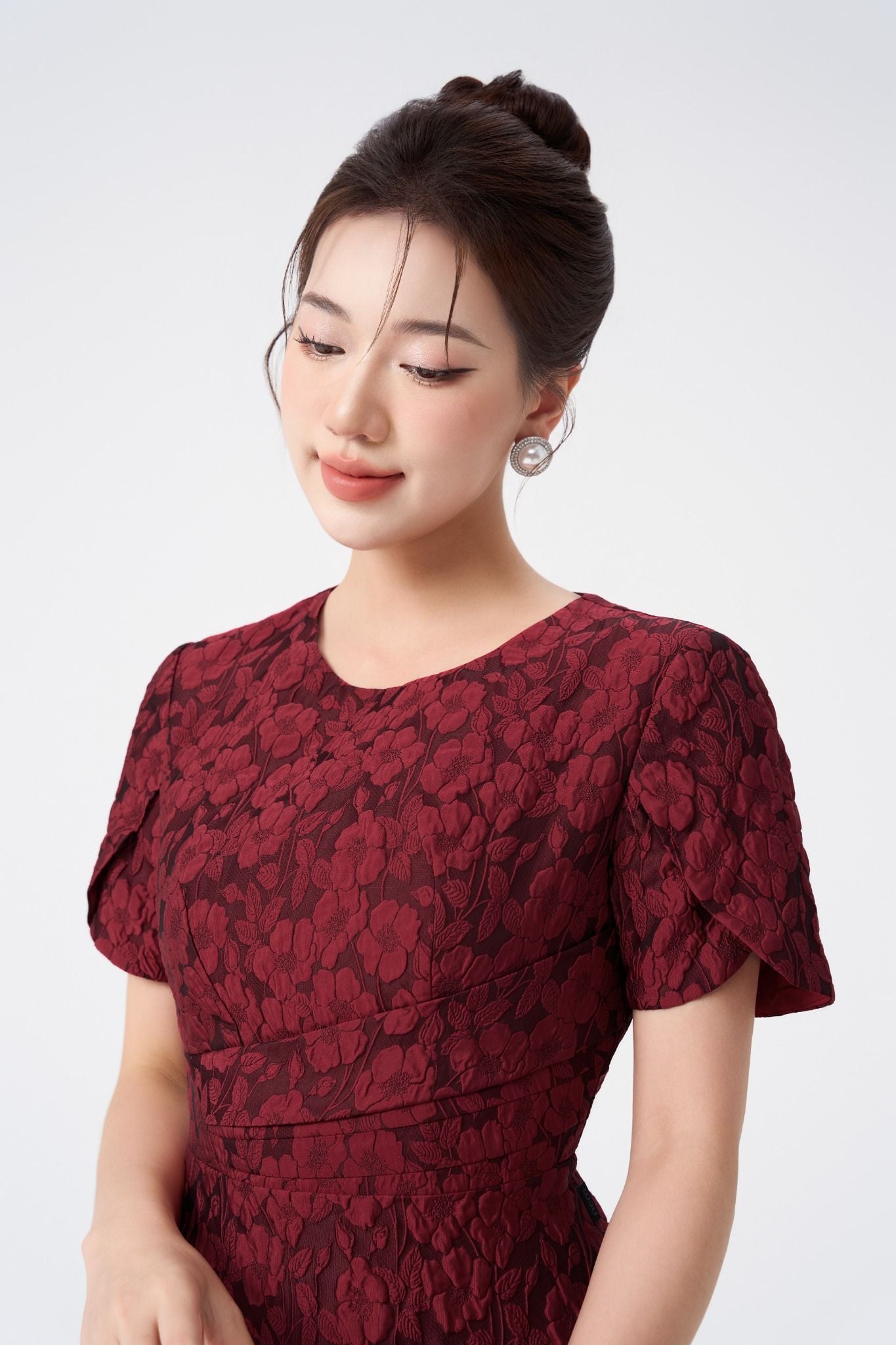 Kiểu dáng: đầm thiết kế dáng chữ A dài qua gối, kết hợp họa tiết hoa tone màu đỏ